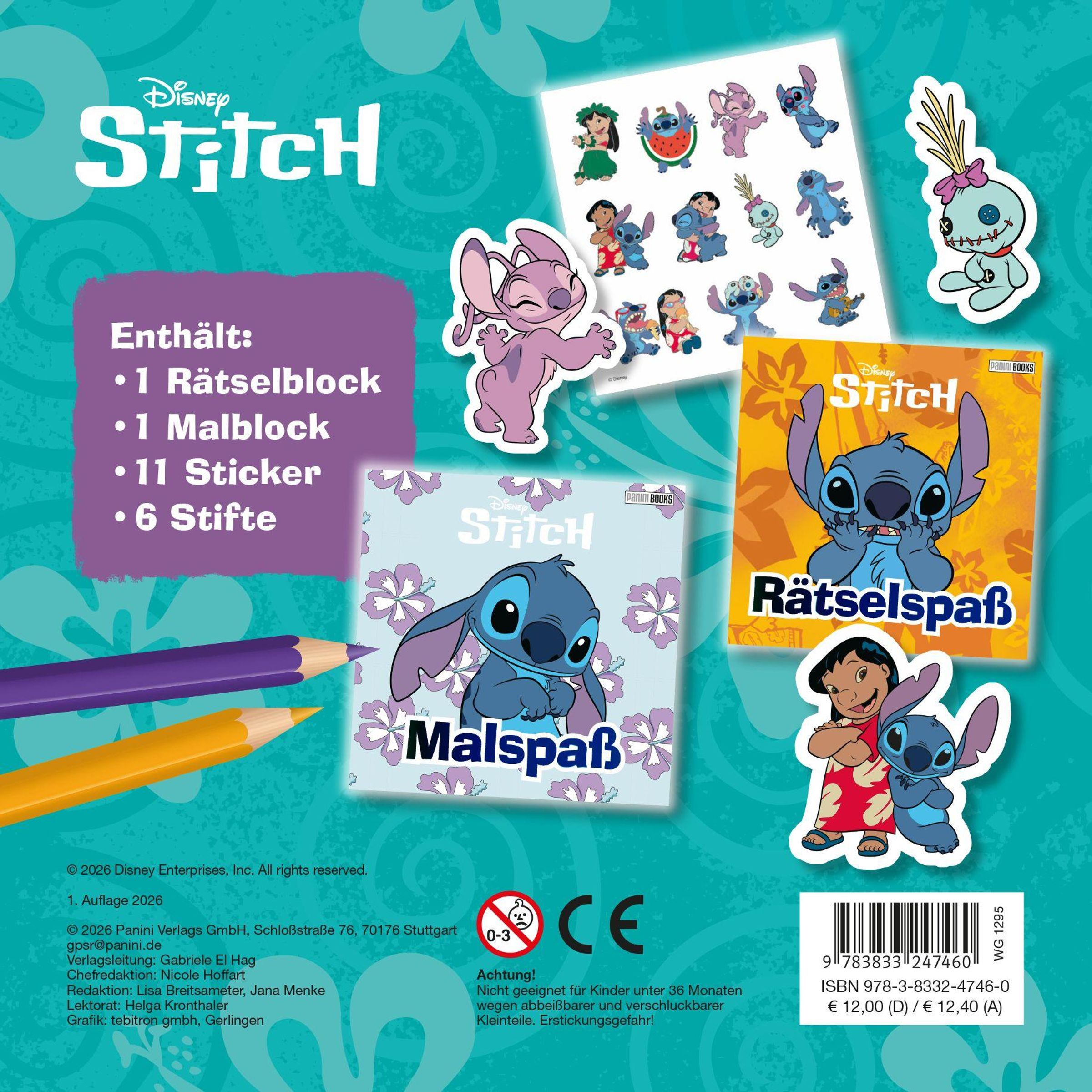 Mach dich bereit für jede Menge Mal-, Rätsel- und Stickerspaß mit Stitch! Diese hochwertige Metallbox enthält ein Rätselbuch, ein Malbuch, 11 Sticker und 6 Buntstifte. Das perfekte Geschenk für kleine Stitch-Fans!