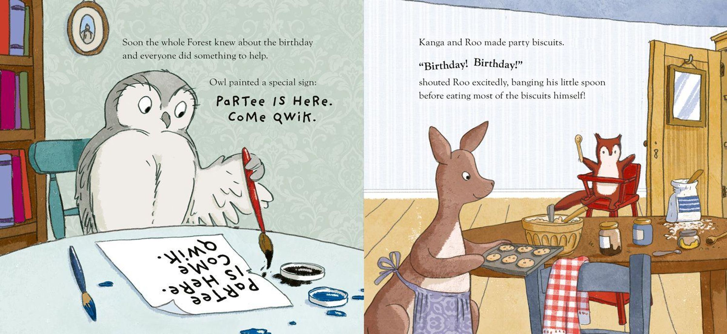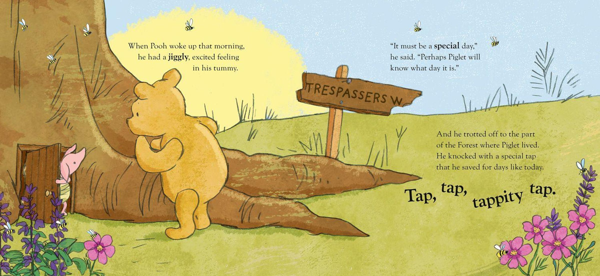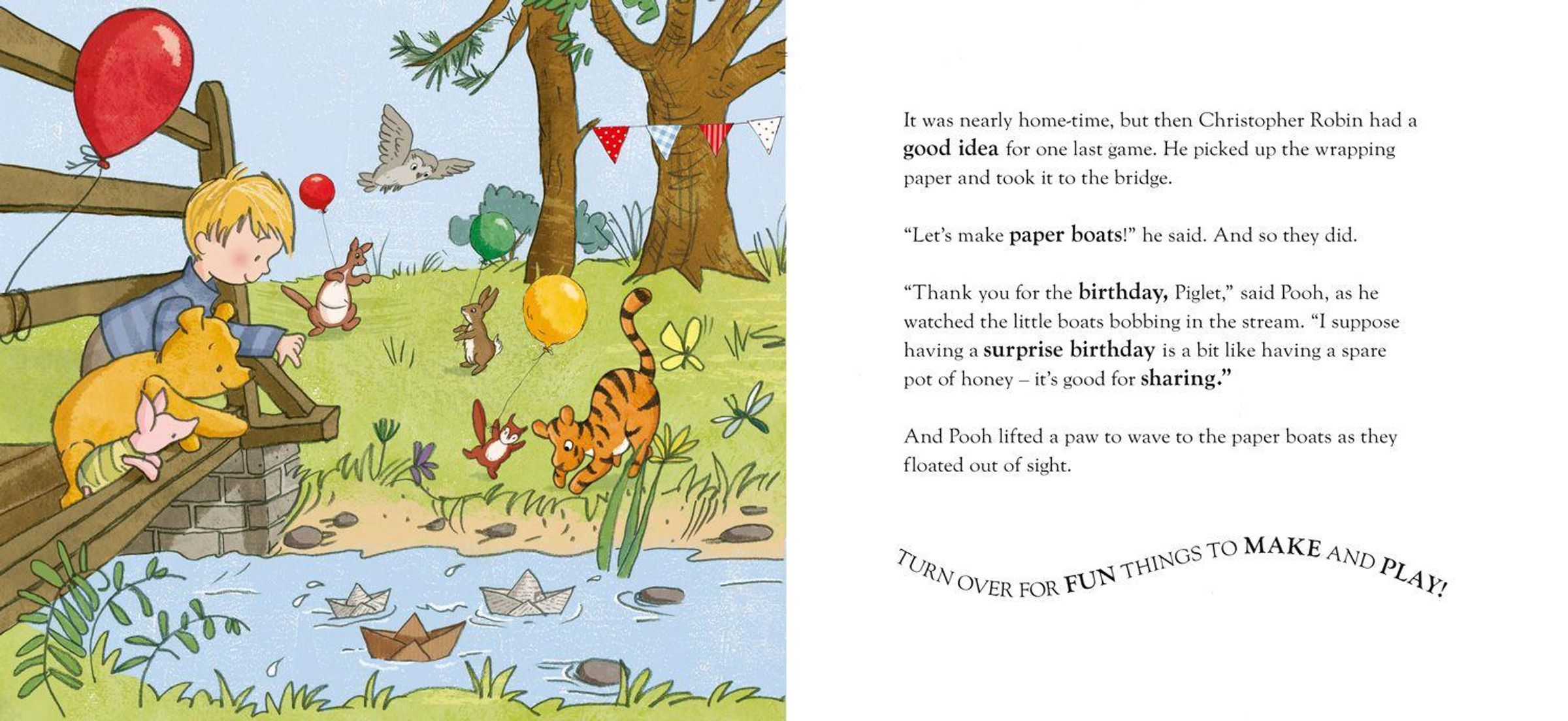 One day Winnie-the-Pooh had an excited feeling in his tummy that told him it was a special day. Christopher Robin told him it was a birthday feeling. That was wonderful to hear, because birthdays mean parties , games and cake! Everyone in the Forest got busy getting everything ready for a special birthday party celebration - from invites to a birthday cake - but then they realised they hadn't asked the most important question of all ... whose birthdaywas it?