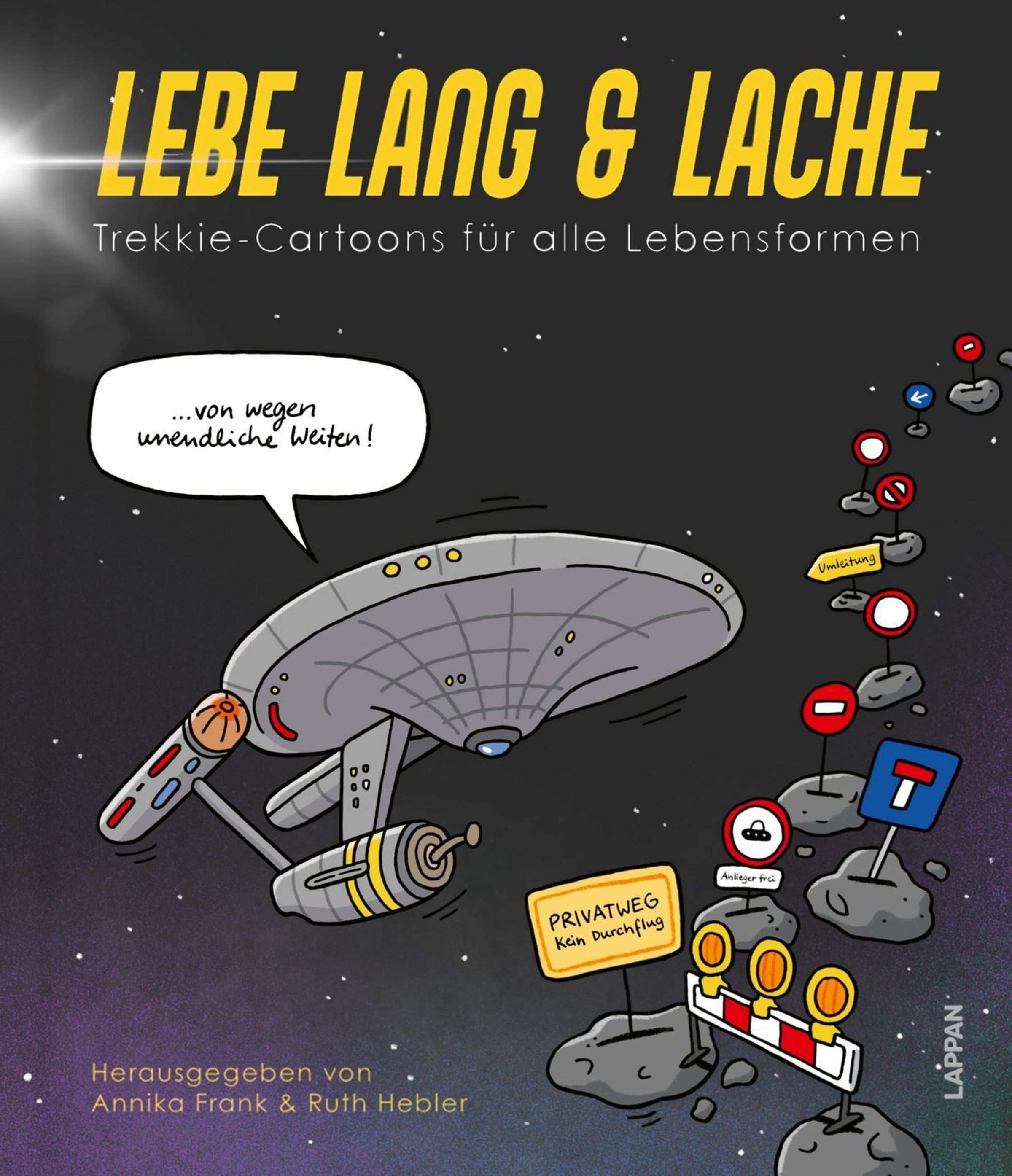 "Lebe Lang & Lache: Trekkie-Cartoons für alle Lebensformen." Sci-Fi-Raumschiff stoppt vor Verkehrsschildern im Weltall., Buch
