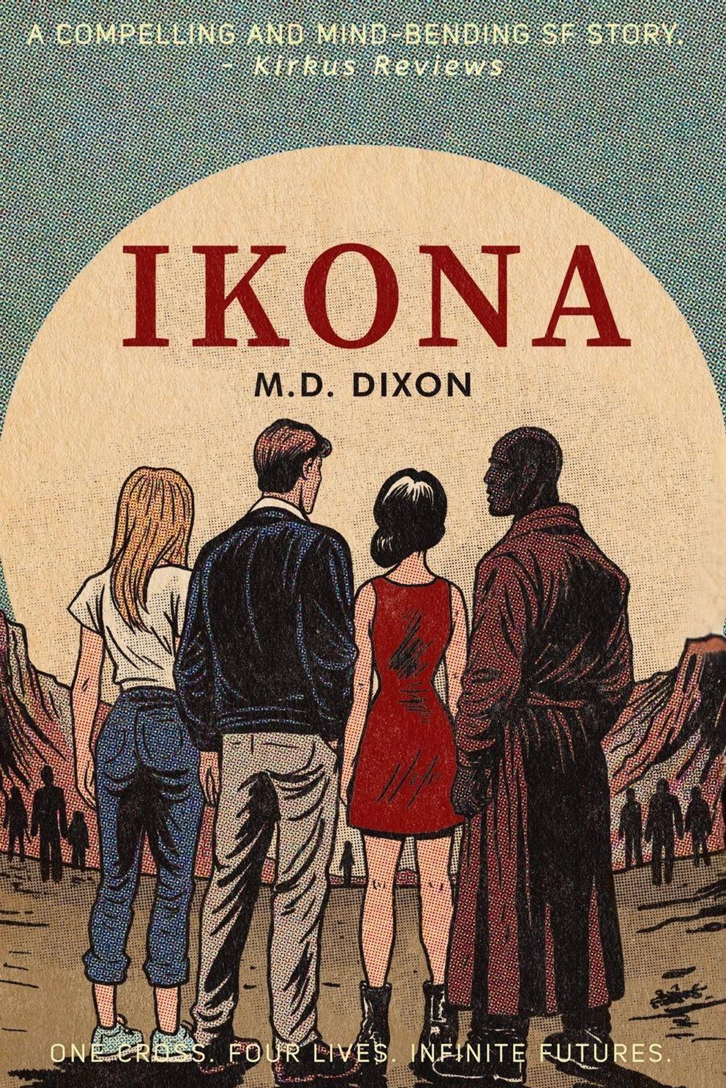 „A compelling and mind bending SF story.” Oben, „IKONA” groß in Rot. Vier Personen von hinten, im Stil einer Illustration., Buch