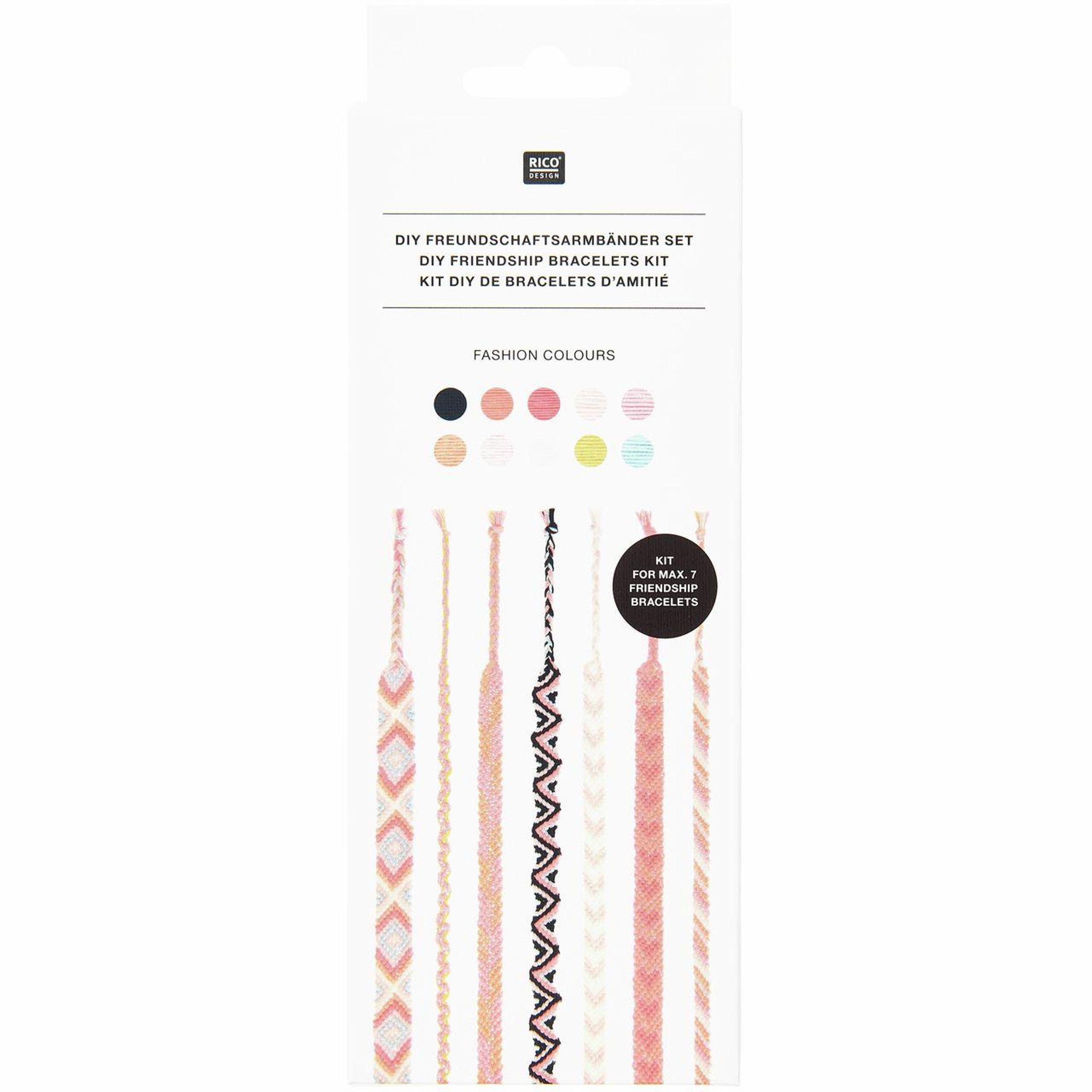 Das DIY Freundschaftsarmbänder Set Fashion Colours enthält alles, was für das Knüpfen farbenfroher Armbänder benötigt wird. Mit zehn kräftigen Garnfarben aus 100 % Baumwolle und einer Anleitung für zehn verschiedene Knüpfmotive lassen sich bis zu sieben individuelle Freundschaftsarmbänder gestalten. Ein ergänzendes Video-Tutorial erleichtert den Einstieg und inspiriert zu kreativen Kombinationen.