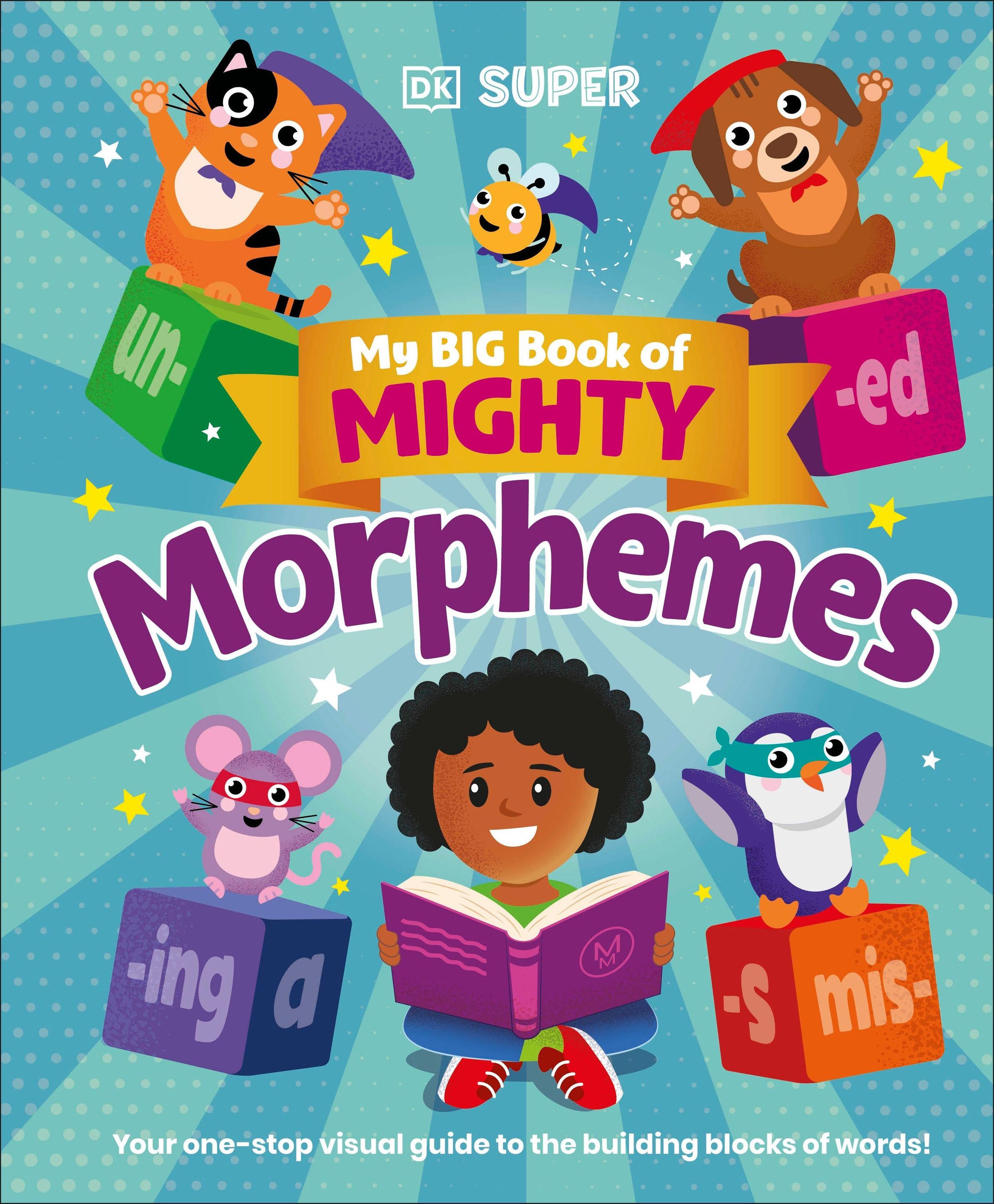 Titel: "My Big Book of Mighty Morphemes". Farbenfrohe Illustration mit Tieren und einem Kind, das ein Buch liest., Buch