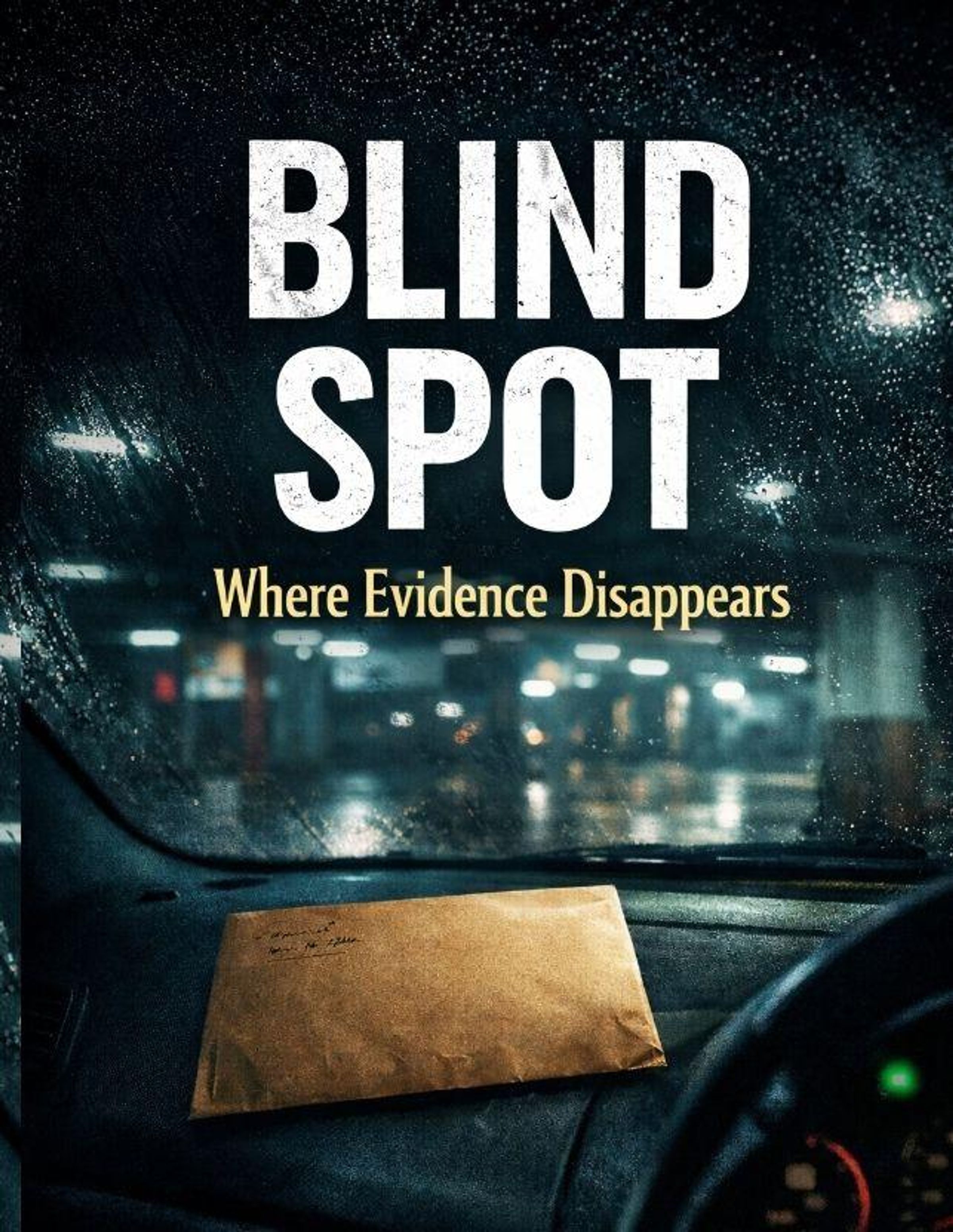 "BLIND SPOT: Where Evidence Disappears." Innenansicht eines Autos, brauner Umschlag auf dem Armaturenbrett, regennasses Fenster., Buch