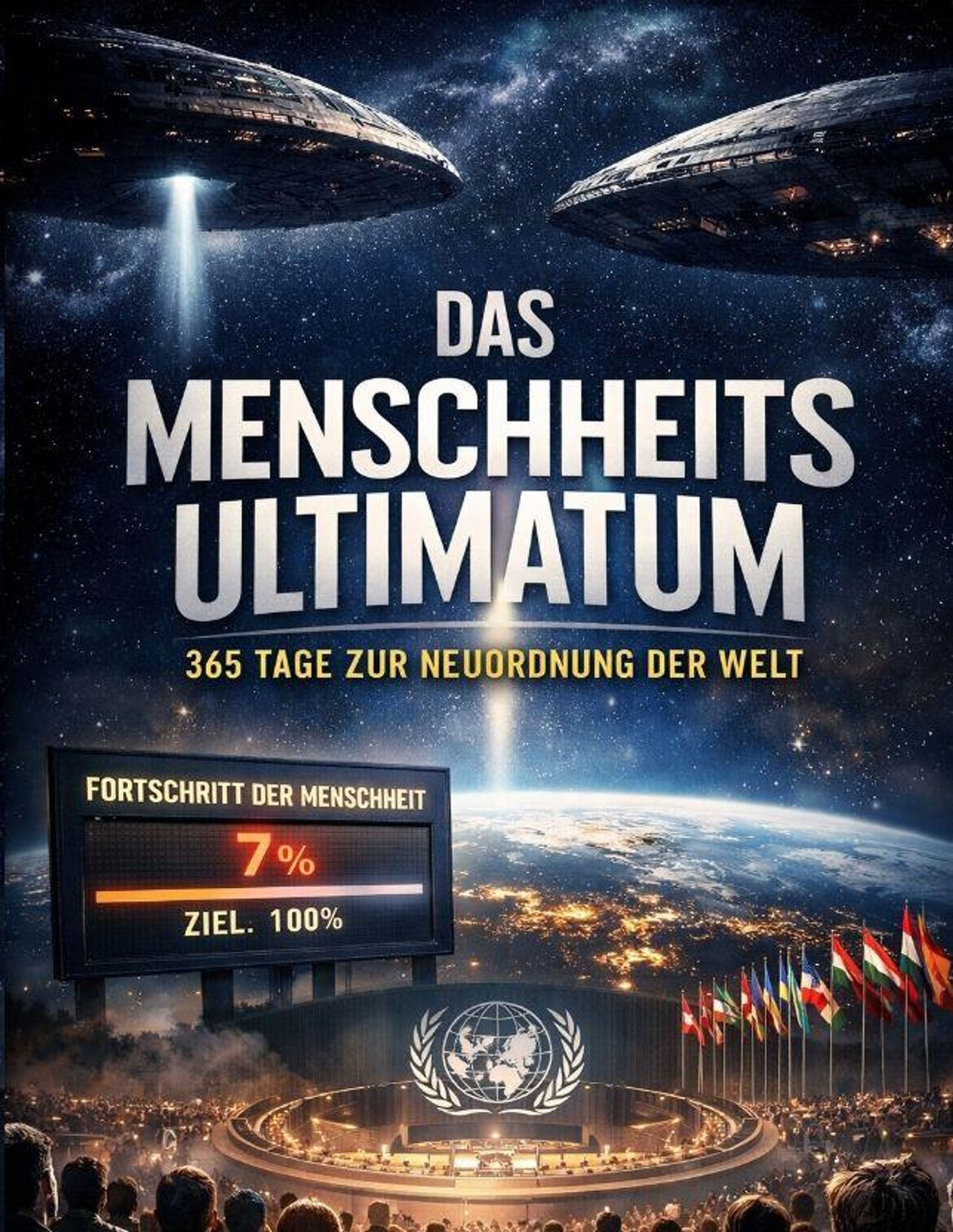 Auf allen Bildschirmen erscheint dieselbe verstörende Zahl: 7 %. So viel ist die Menschheit zu Beginn noch wert. Von diesem Moment an läuft ein global sichtbarer Fortschrittswert unaufhaltsam in Richtung 100 % - und mit jedem Tag steigt der Druck. Regierungen geraten ins Wanken, die UNO versagt, alte Machtstrukturen brechen auseinander, und die Idee eines Weltparlaments wird plötzlich zur letzten Hoffnung der Zivilisation.