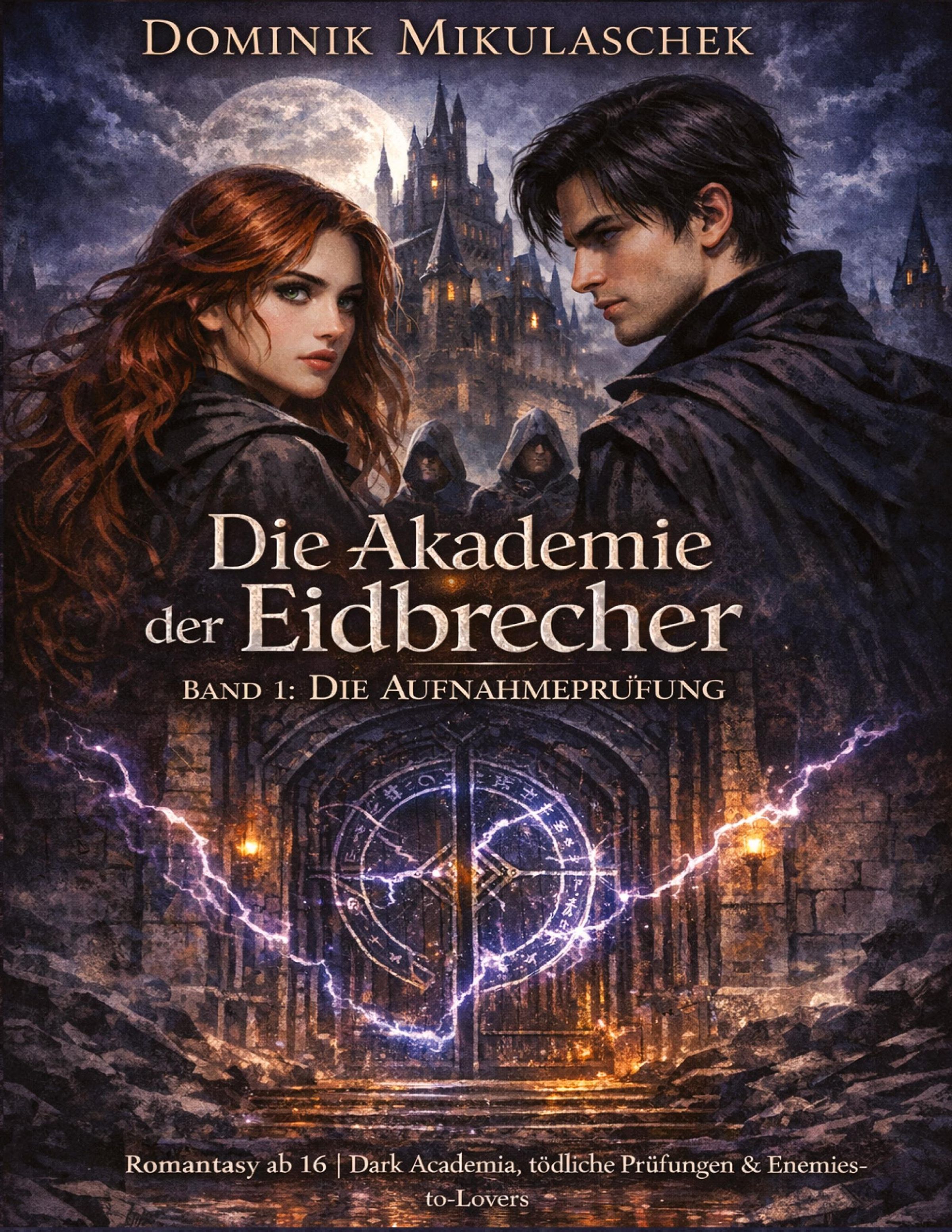 Titel: "Die Akademie der Eidbrecher". Zwei Personen vor einem Schloss, magische Tür mit leuchtendem Kreis., Buch