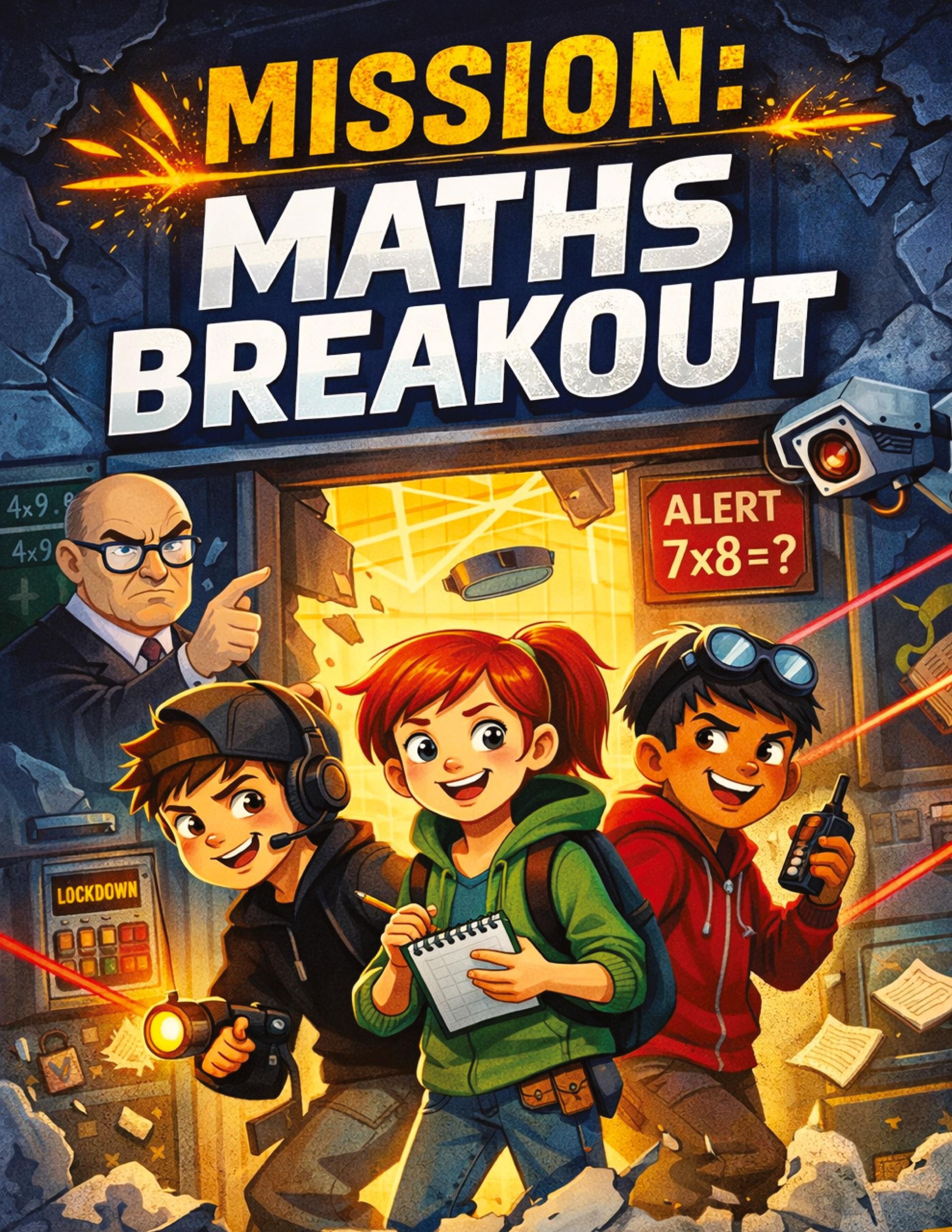 „MISSION: MATHS BREAKOUT“, „ALERT 7x8=?“, Kinder halten Technik und Notizblock, entschlossener Lehrer im Hintergrund., Buch