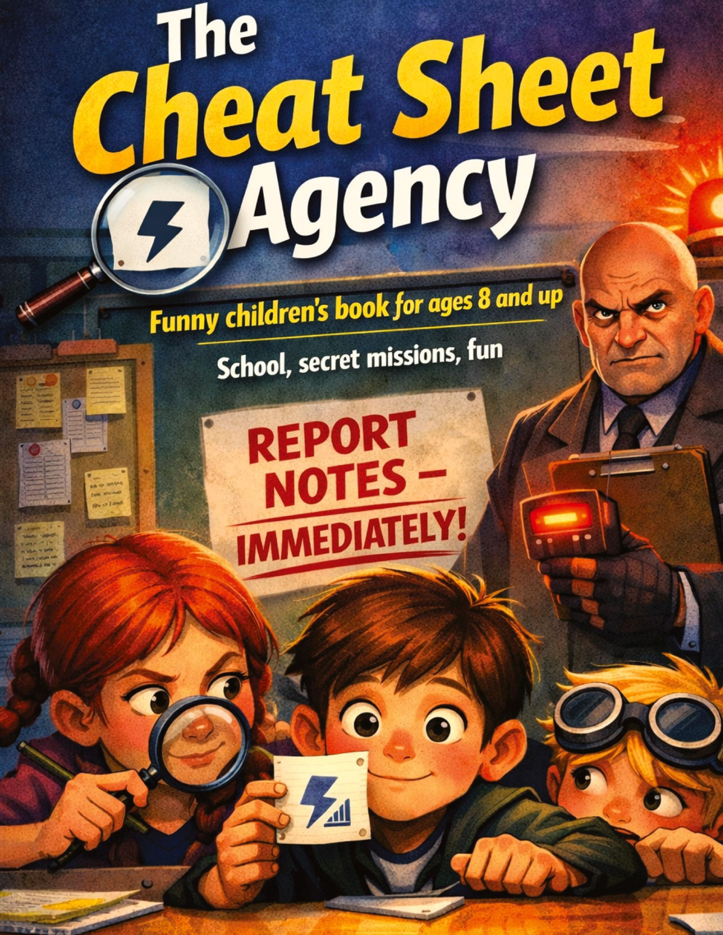 Ein spannendes Kinderbuchcover mit Kindern, die Geheimnotizen erforschen. Ein ernst aussehender Mann ist im Hintergrund., Buch