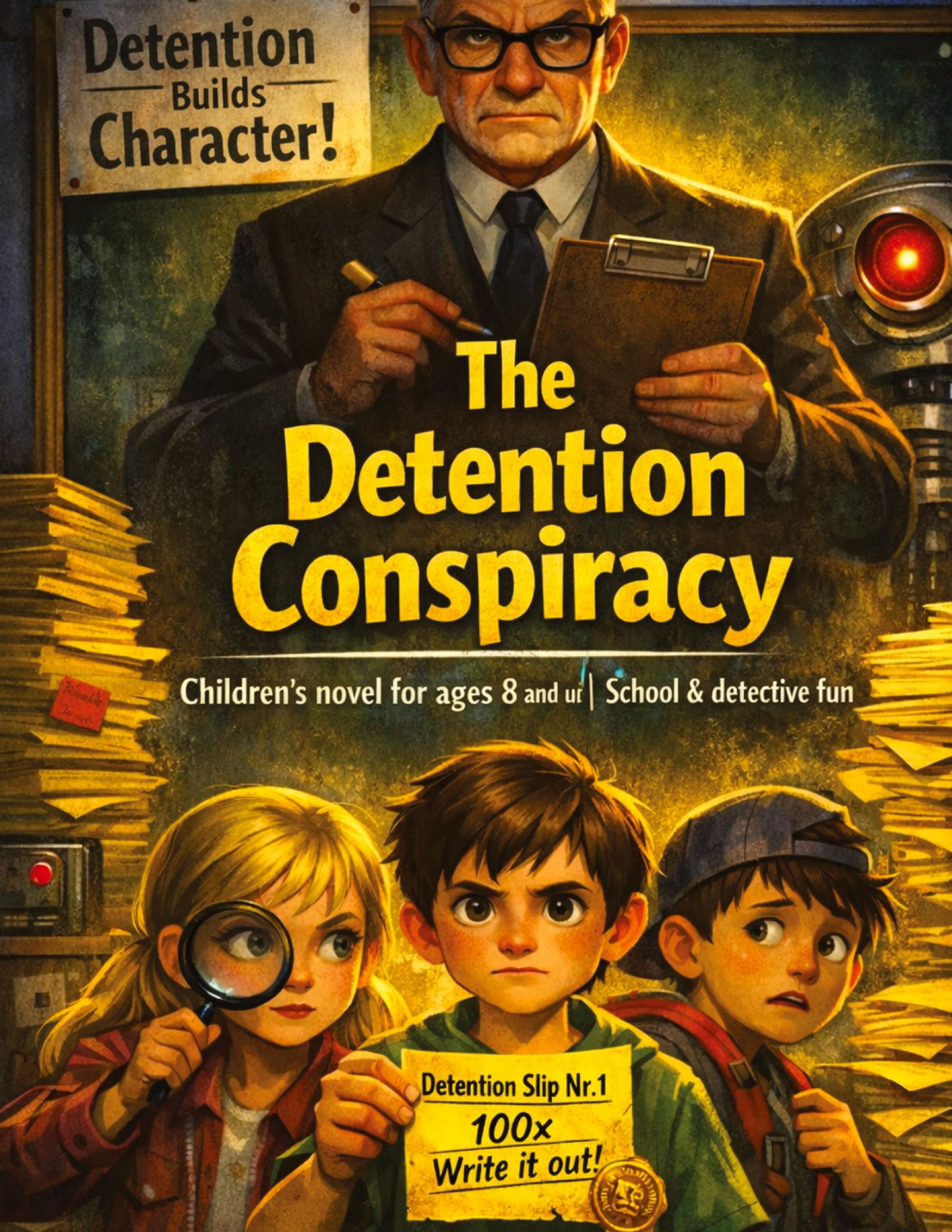 **"The Detention Conspiracy"** is a fast-paced **children's mystery novel for ages 8 and up**, packed with humor, tension, and clever detective moments. It's a thrilling mix of **school story, kid detective adventure, and laugh-out-loud satire**, showing young readers that unfair rules should be questioned-and that friendship and teamwork can beat even the strictest system.