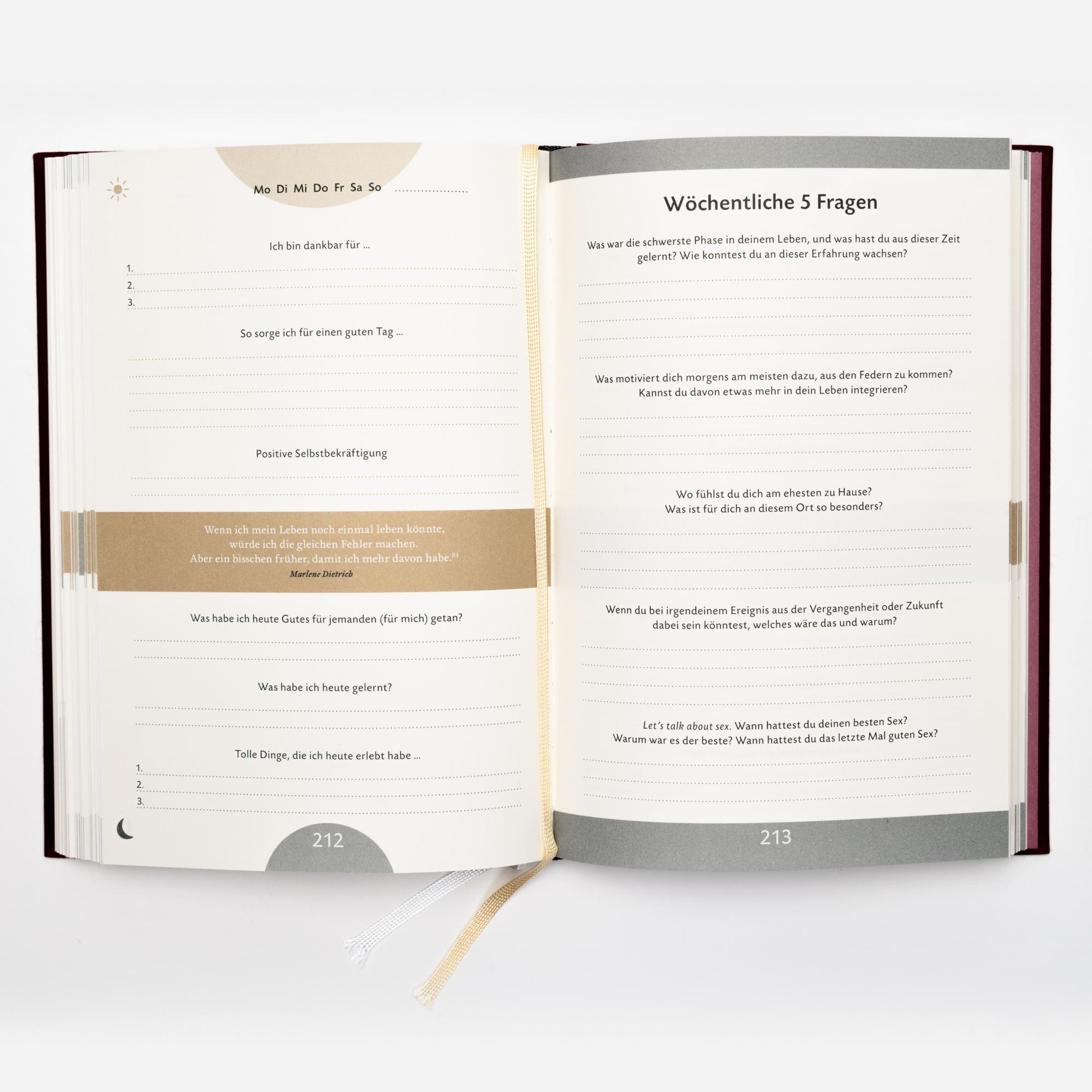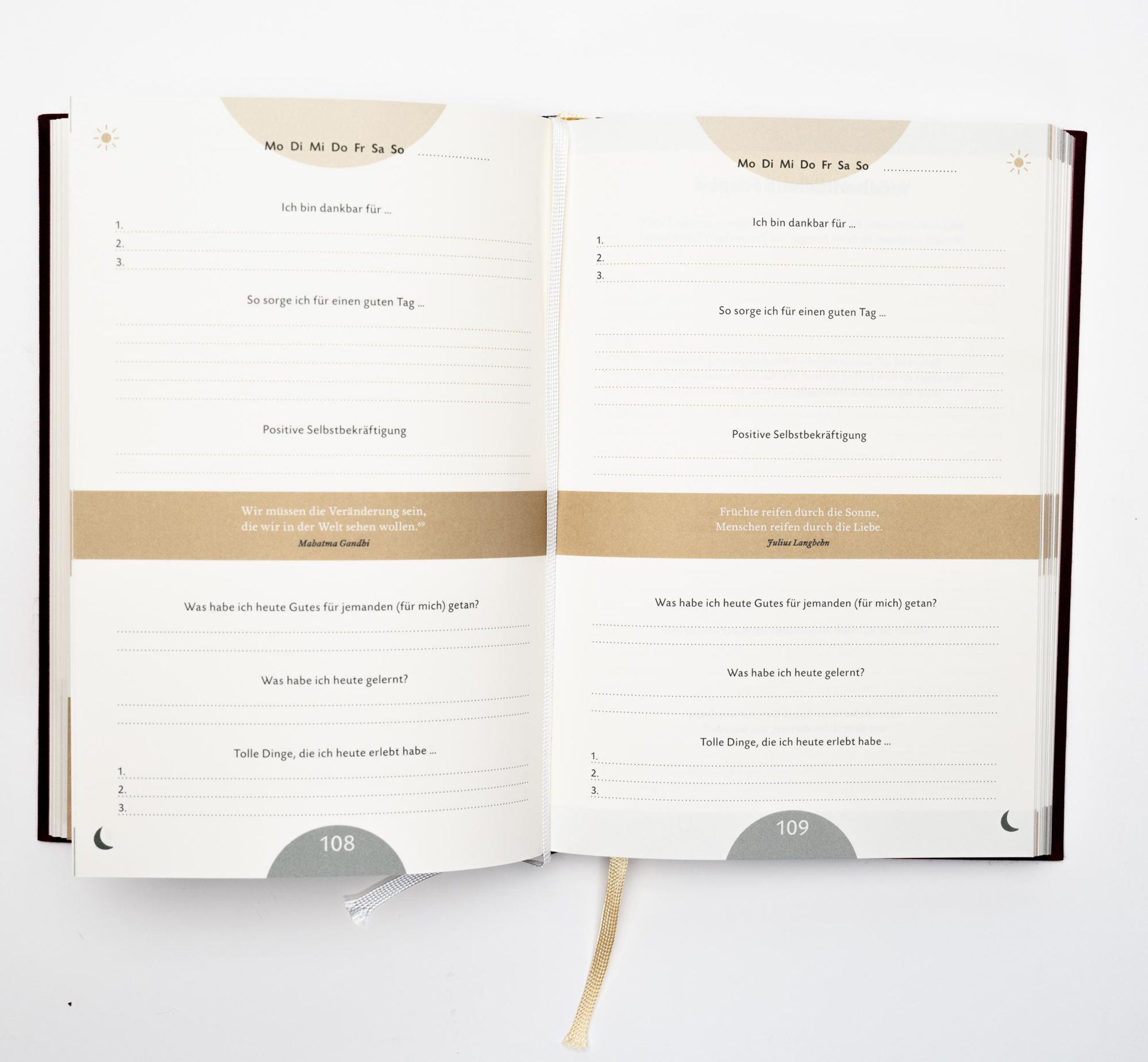 Deutschlands erfolgreichstes Dankbarkeitstagebuch, über 1 Million Nutzer: innen: Was ist der sicherste Weg, sein Leben zu verbessern? Wer sich gut fühlen will, muss auch gut denken - und das wird in diesem Tagebuch trainiert. Das 6-Minuten-Tagebuch hilft, nicht auf das zu schauen, was fehlt oder nicht passt, sondern sich auf Fortschritt und das Gute zu fokussieren. Simpel & wirkungsvoll werden in jeweils drei Minuten am Morgen und am Abend die praxiserprobten Prinzipien der positiven Psychologie genutzt, um das eigene Wohlbefinden langfristig zu steigern. Sechs Minuten, um wünschenswerte Gewohnheiten - wie zum Beispiel Dankbarkeit, Optimismus oder persönliches Wachstum durch tägliche Reflexion - aufzubauen. So werden positive Veränderungen automatisch in den Alltag integriert und du kannst dein Leben Tag für Tag ein bisschen besser machen - konstant & proaktiv.