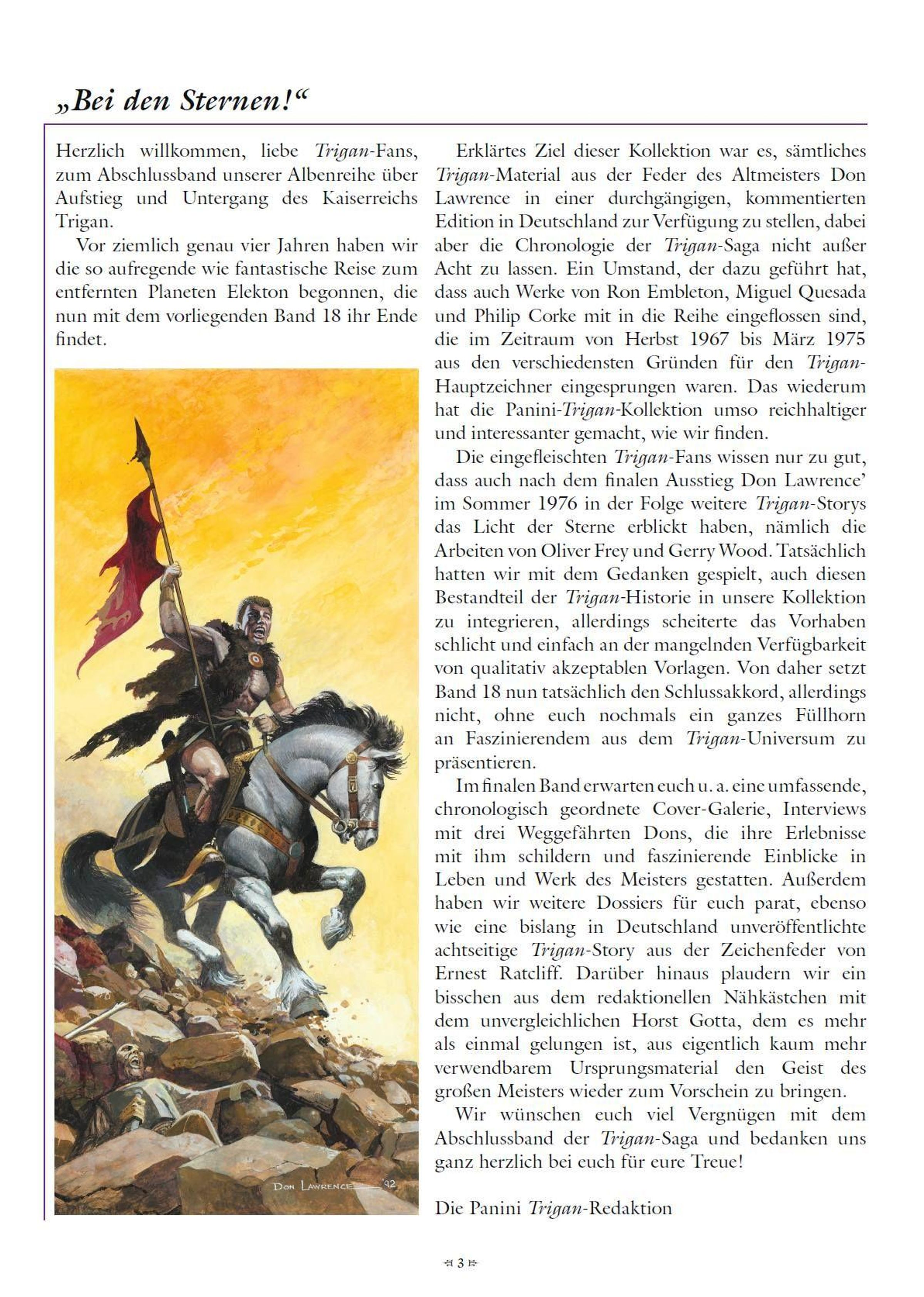 Vor Tausenden von Jahren erhob sich auf dem Planeten Elekton ein Stammesverbund von Nomaden aus dem Staub der Wüste und wuchs unter der Führung eines einzelnen Visionärs namens Trigo zu einer fortschrittlichen und hochentwickelten Zivilisation heran. Zu Ehren ihres Anführers nannte sich diese junge Nation fortan TRIGAN. Und dies ist ihre Geschichte ... AUS DER FEDER DES GENIALEN STORM-SCHÖPFERS DON LAWRENCE!