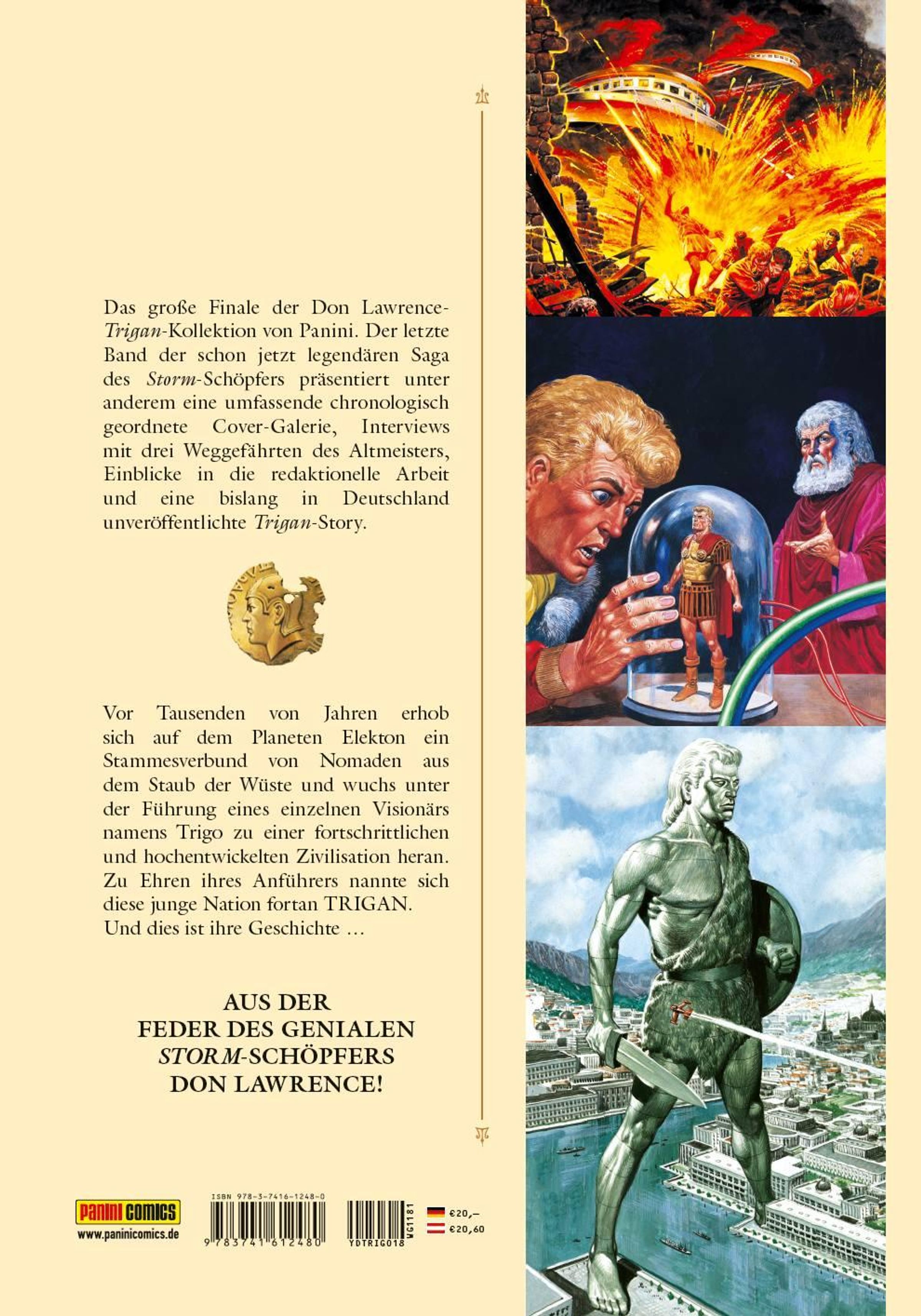 Das große Finale der Don Lawrence-Trigan-Kollektion von Panini. Der letzte Band der schon jetzt legendären Saga des Storm-Schöpfers präsentiert unter anderem eine umfassende chronologisch geordnete Cover-Galerie, Interviews mit drei Weggefährten des Altmeisters, Einblicke in die redaktionelle Arbeit und eine bislang in Deutschland unveröffentlichte Trigan-Story.