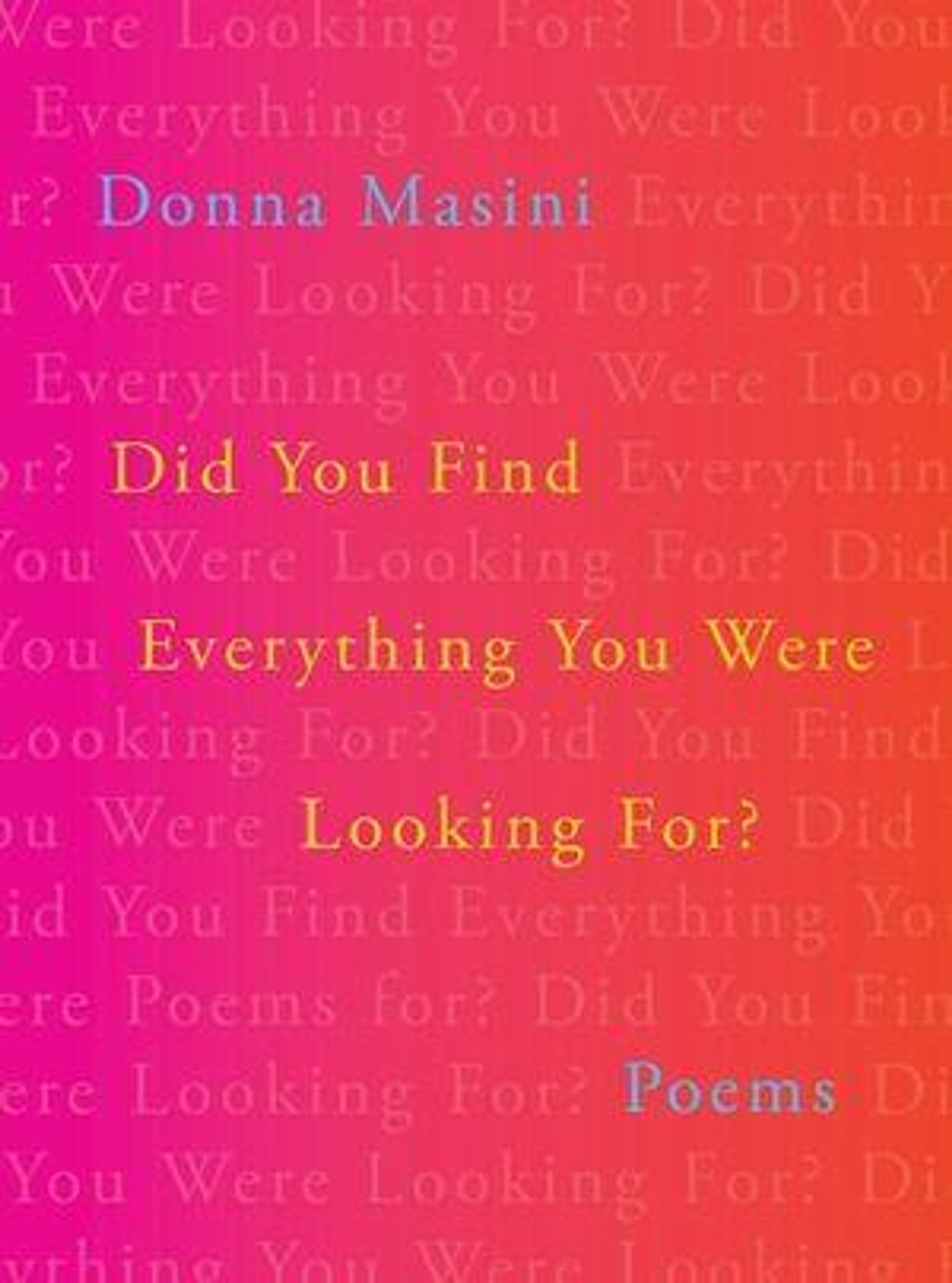 Formally inventive and conversational, the poems, prose poems, lyric essays, and "notebook entries" in Did You Find Everything You Were Looking For? explore our bewildering, increasingly fragmented lives. Unpredictable and unfailingly curious, Donna Masini-in her most compelling, wide-ranging book yet-moves from elegy and intimate address to exuberant performance and meditations on mortality and time. "Today I woke up hearing the urn is half full," one poem begins. "Survival is improvisational," another poem declares, succinctly capturing the unpredictability of our lives. This moving, irreverent, and surprisingly buoyant collection is alert to the ways in which we distract ourselves-erotic fantasy, binge-watching Netflix-and try to make meaning out of these distractions. For all their shifts of mind, for all the human noise, these are poems alive to mystery, to our unexpected moments of beauty, ultimately asking: Why love it all so intensely?