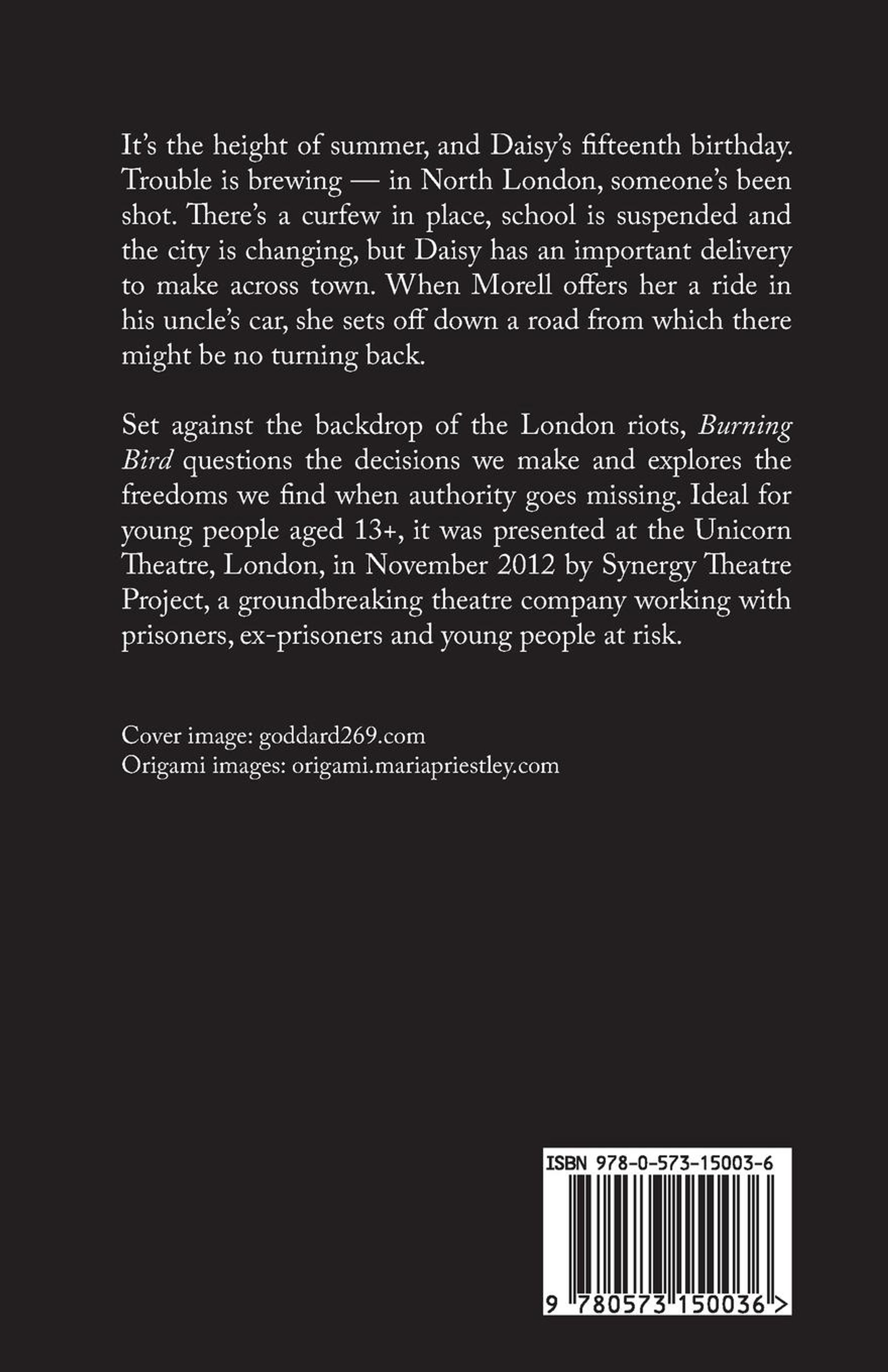 It's the height of the summer and Daisy's fifteenth birthday. Trouble is brewing - in North London, someone's been shot. There's a curfew in place, school is suspended and the city is changing, but Daisy has an important delivery to make across town. When Morell offers her a ride in his uncle's car, she sets off down a road from which there might be no turning back. Set against the backdrop of the London riots, Burning Bird, questions the decisions we make and explores the freedoms we find when authority goes missing. Ideal for young people ages 13+ it was presented at the Union Theatre, London, in November 2012 by Synergy Theatre Project, a groundbreaking theatre company working with prisoners, ex-prisoners and young people at risk.