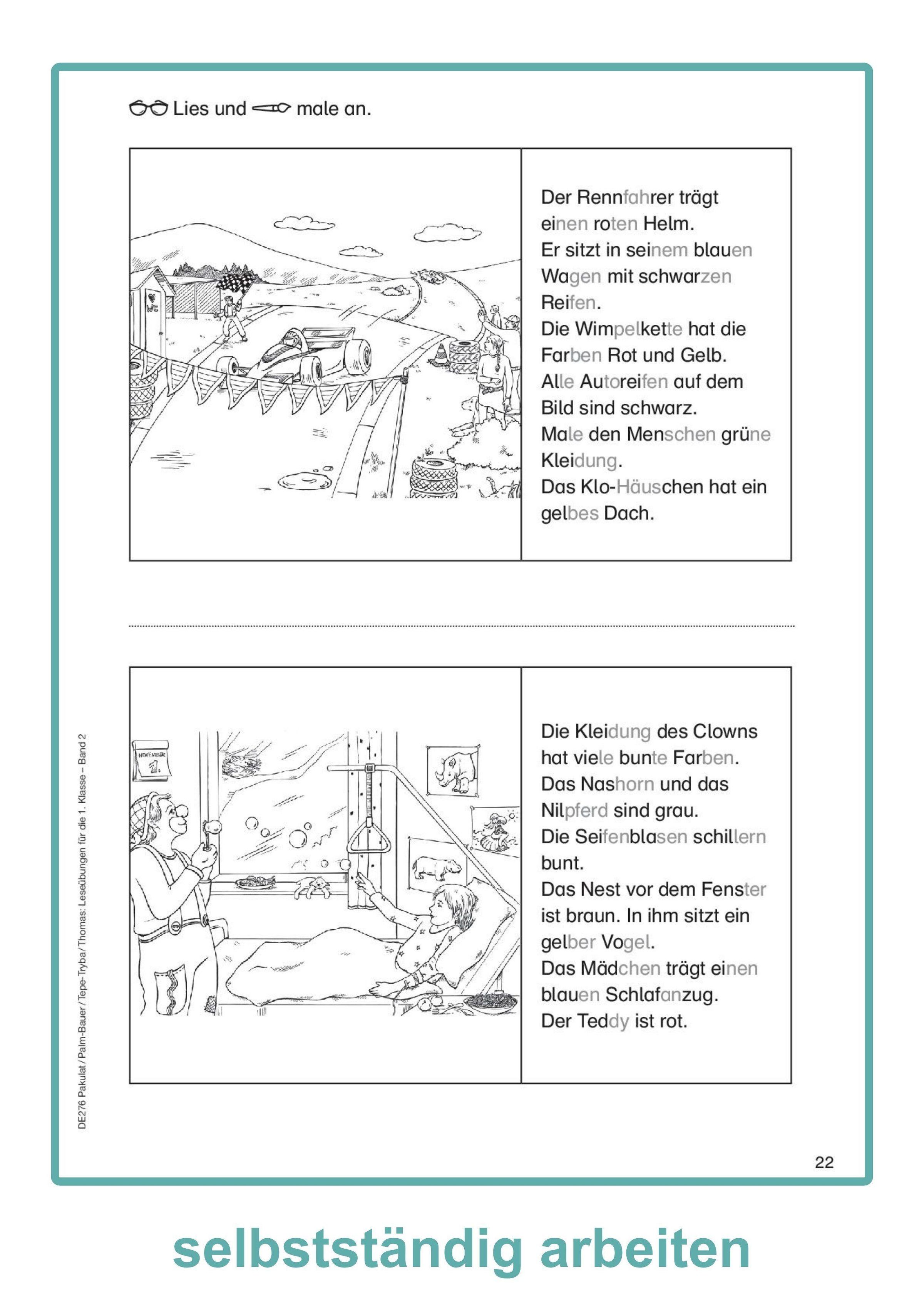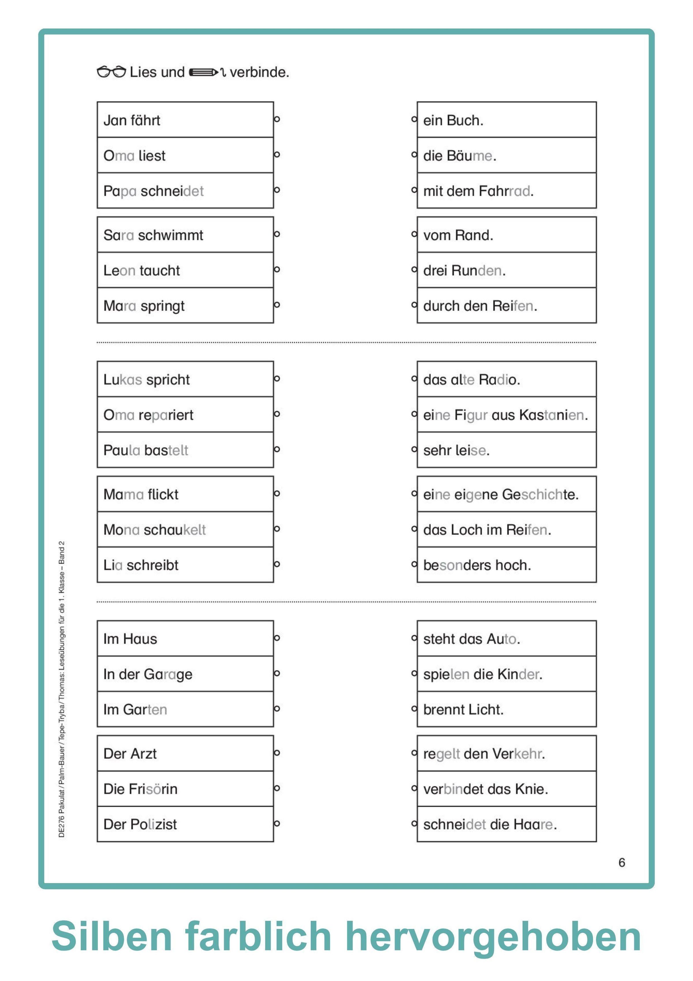 Die kleinen Leseaufträge in diesem Heft ermöglichen erste Leseerfolge. Es werden Satzteile erlesen und verbunden, Lese-Mal-Aufträge ausgeführt, richtige Sätze angekreuzt und kleine Rätsel gelöst. Dabei können die Kinder im eigenen Tempo und auf ihrem Lesestand arbeiten, dadurch ist auch der Einsatz in heterogenen Schuleingangsklassen möglich. Bei vielen Texten sind als zusätzliche Hilfe die Silben eingefärbt. Die wiederkehrenden Arbeitsanweisungen sind mit Piktogrammen versehen und ermöglichen die selbstständige Arbeit mit den Texten.