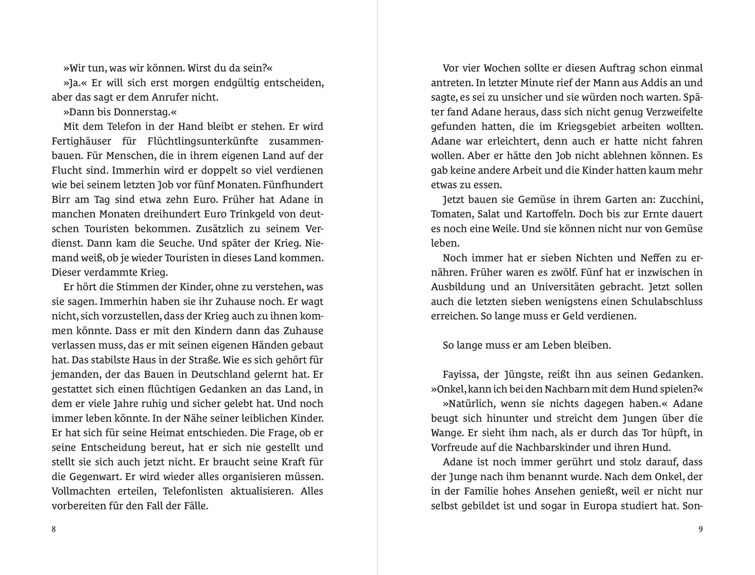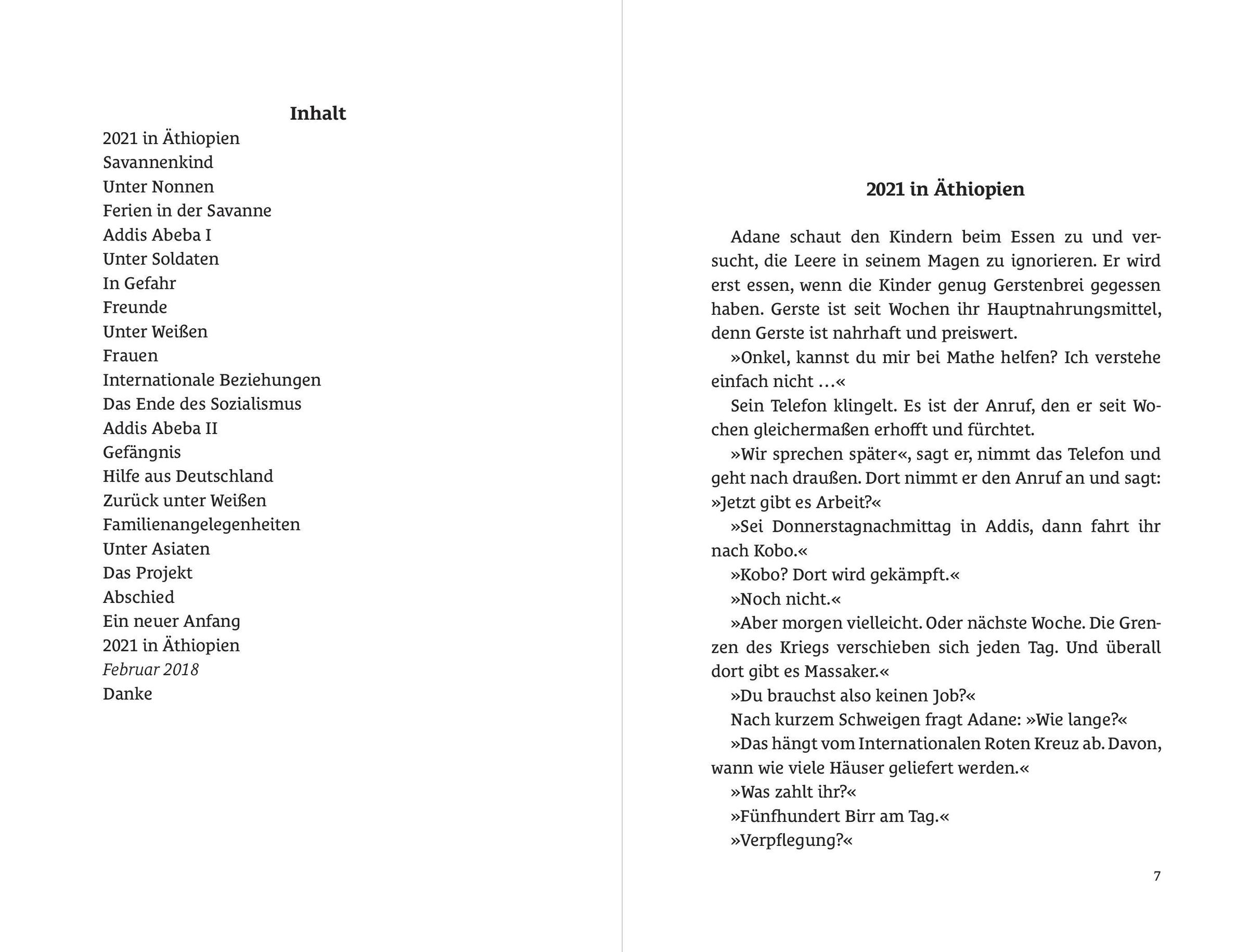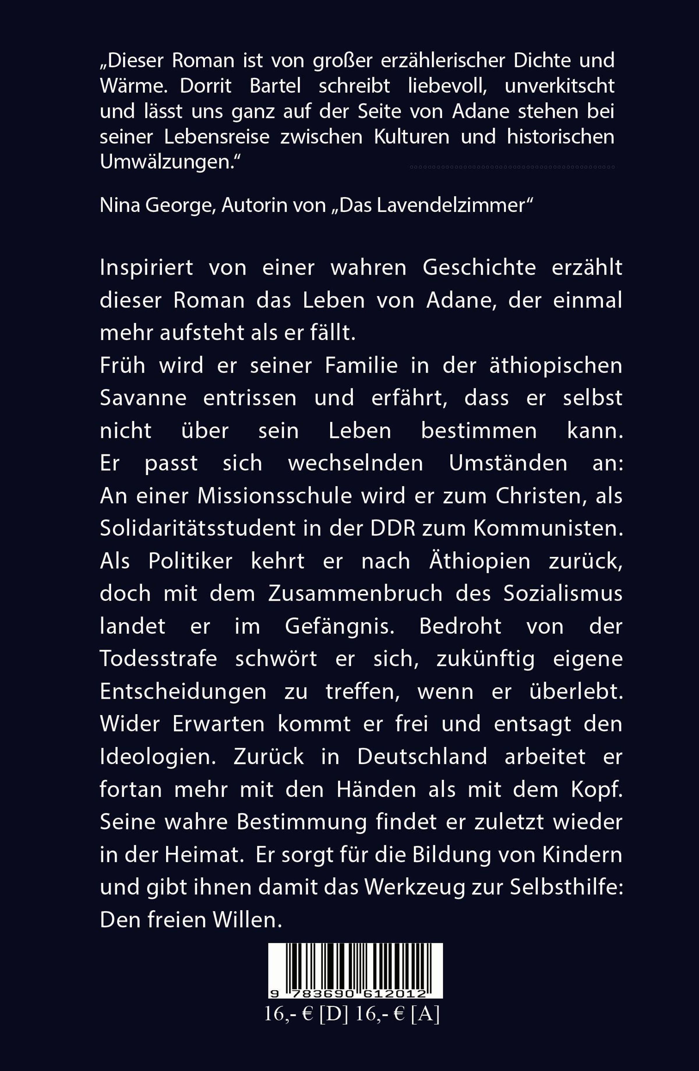Inspiriert von einer wahren Geschichte erzählt dieser Roman das Leben von Adane, der einmal mehr aufsteht als er fällt. Früh muss er seine Familie in der äthiopischen Savanne verlassen und erfahren, dass er selbst nicht über sein Leben bestimmen kann. Er passt sich wechselnden Umständen an: An einer Missionsschule wird er zum Christen, als Solidaritätsstudent in der DDR zum Kommunisten. Als Politiker kehrt er nach Äthiopien zurück, doch mit dem Zusammenbruch des Sozialismus landet er im Gefängnis. Bedroht von der Todesstrafe schwört er sich, zukünftig eigene Entscheidungen zu treffen, wenn er überlebt. Wider Erwarten kommt er frei und entsagt den Ideologien. Zurück in Deutschland arbeitet er fortan mehr mit den Händen als mit dem Kopf. Seine wahre Bestimmung findet er zuletzt wieder in der Heimat. Er sorgt für die Bildung von Kindern und gibt ihnen das Werkzeug zur Selbsthilfe: Den freien Willen. < // >
