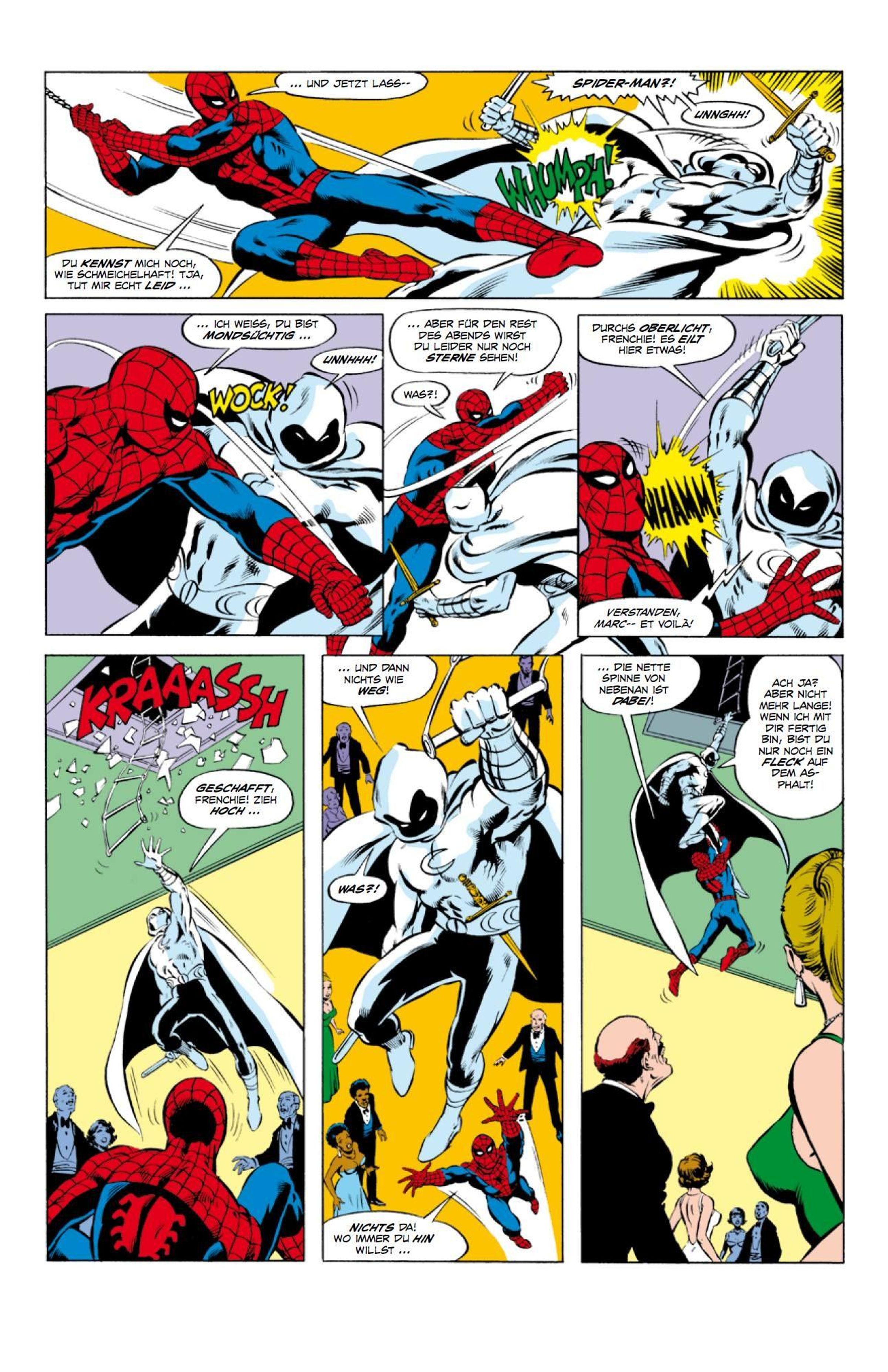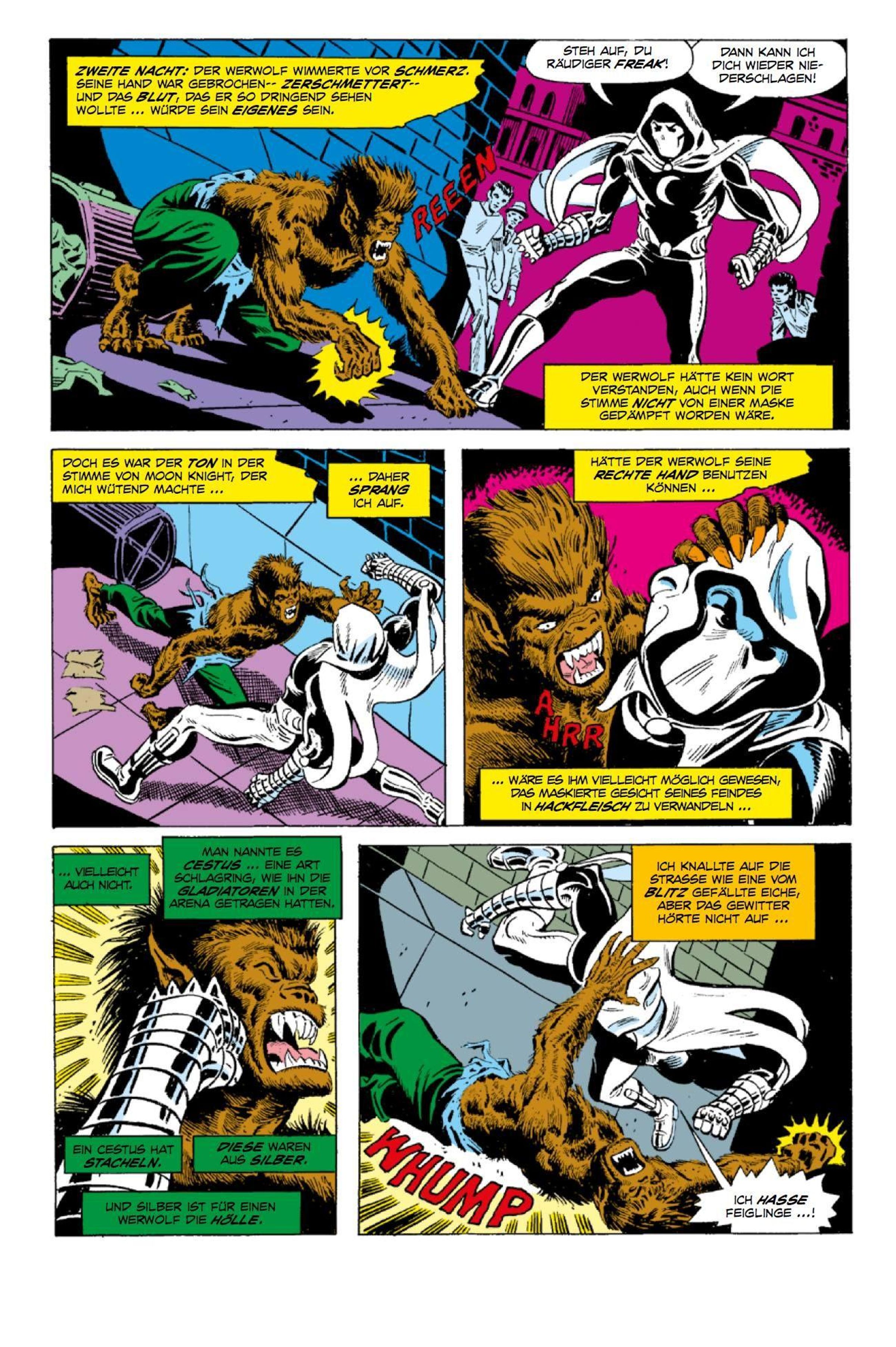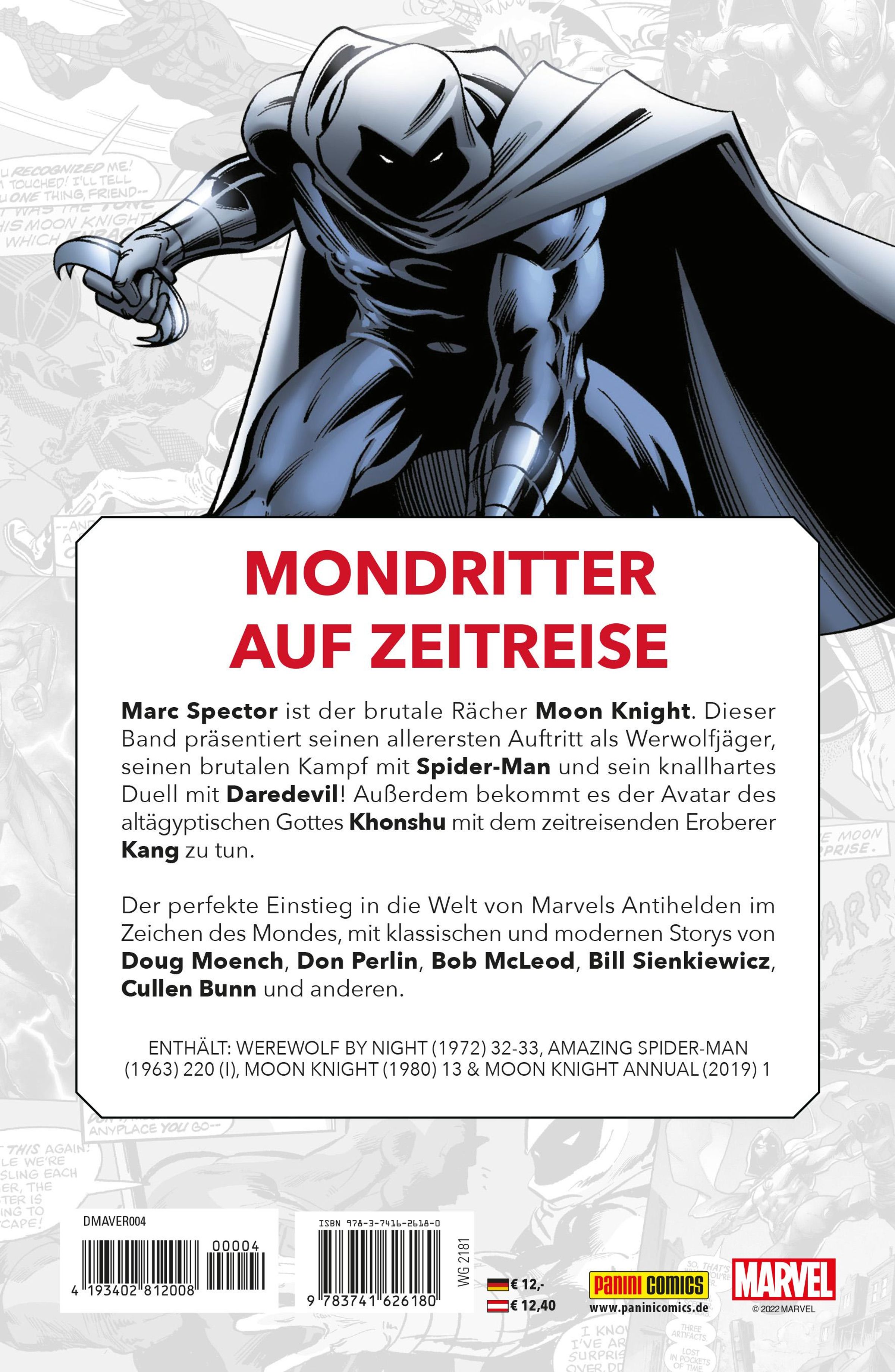 MONDRITTER AUF ZEITREISE Marc Spector ist der brutale Rächer Moon Knight. Dieser Band präsentiert seinen allerersten Auftritt als Werwolfjäger, seinen brutalen Kampf mit Spider-Man und sein knallhartes Duell mit Daredevil! Außerdem bekommt es der Avatar des altägyptischen Gottes Khonshu mit dem zeitreisenden Eroberer Kang zu tun.