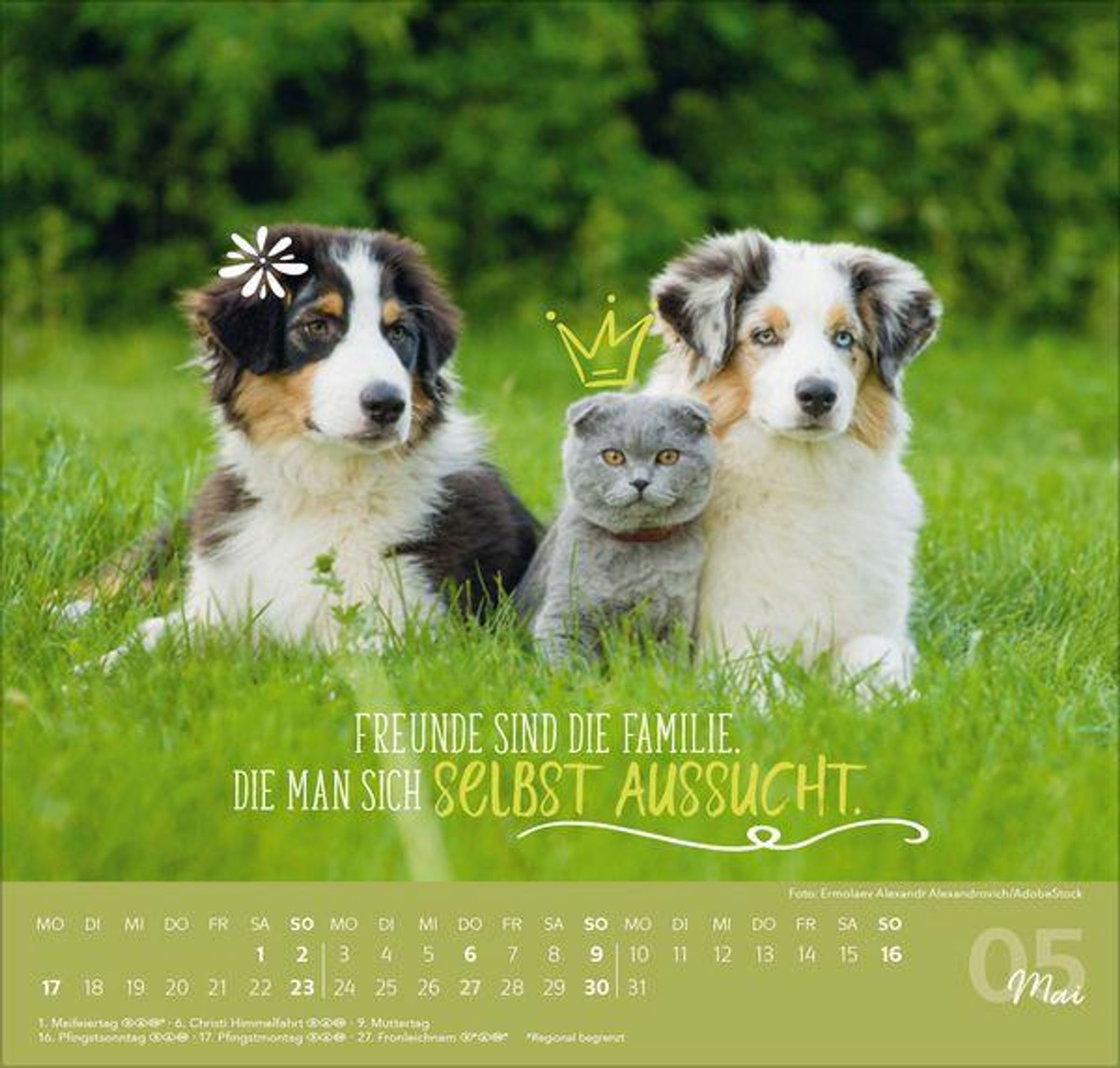 - Farblich abgestimmtes Kalendarium auf Deutsch mit hervorgehobenen Sonn- und Feiertagen für D, A und CH