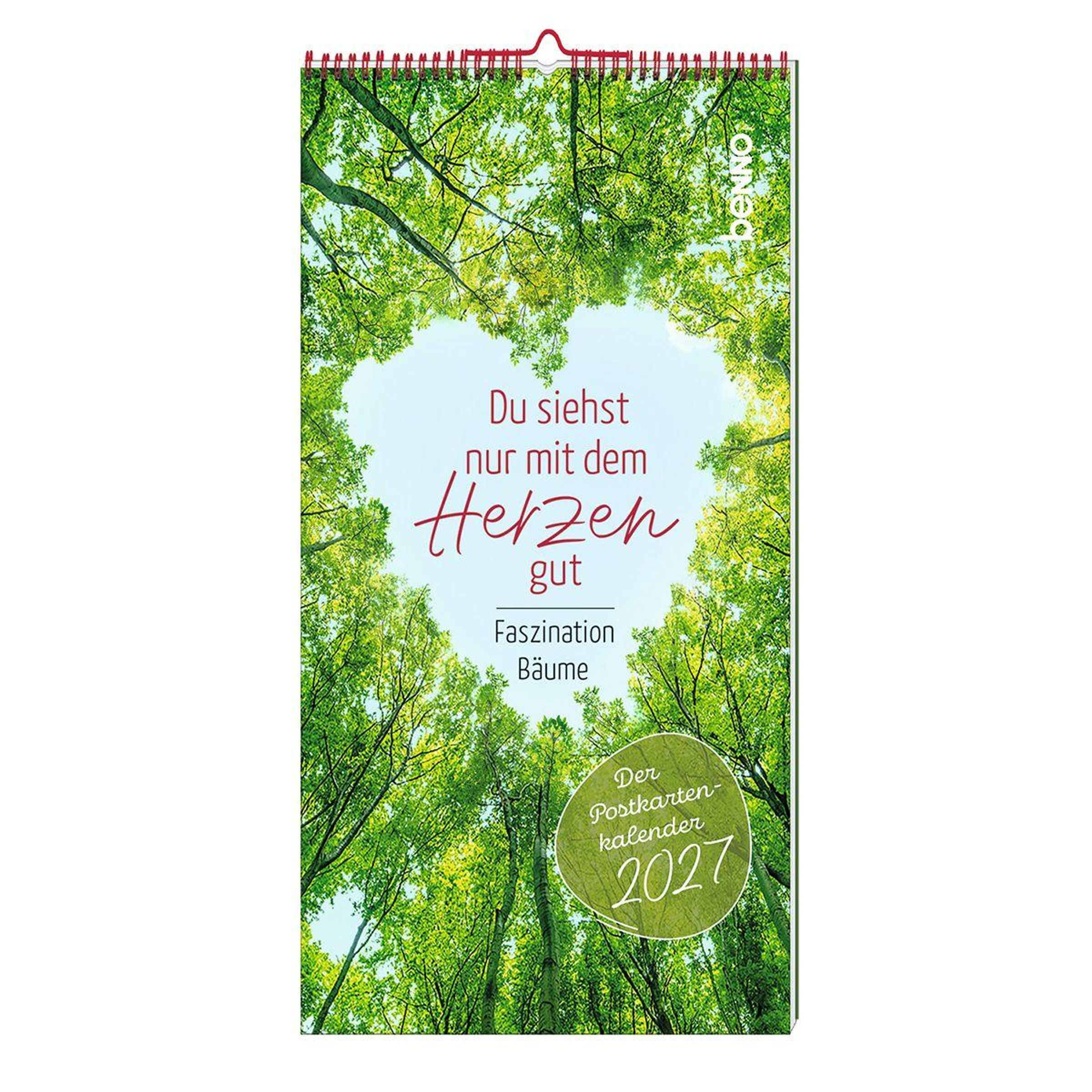 Text: „Du siehst nur mit dem Herzen gut. Faszination Bäume. Der Postkartenkalender 2027.“ Bäume formen ein Herz im Himmel., Kalender