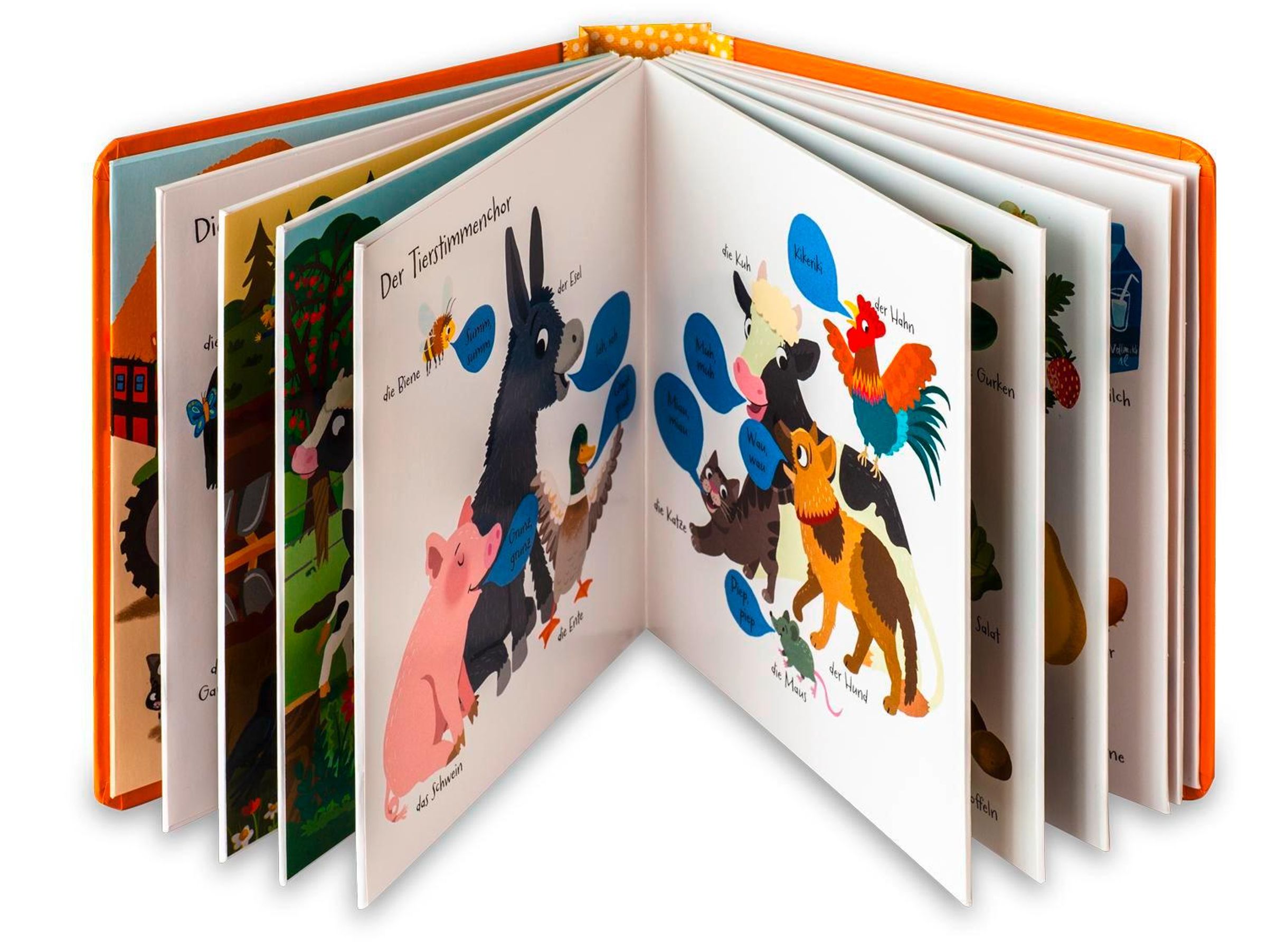 Durch die besondere Papiertechnik ist dieses Buch federleicht und zeigt Kindern ab 18 Monaten die bunte Bauernhof-Welt. Viele Tiere, Fahrzeuge, Obst- und Gemüsesorten kann man auf den Seiten bestaunen. Die Themen "Unser Bauernhof", "Auf dem Feld", "Bei der Ernte", Auf der Weide", "Tierfamilien", "Im Bauerngarten", "Der Tierstimmen-Chor", "Was kommt woher?", "Im Hofladen" und "Nachts im Hühnerstall" gibt es in bunten, lustigen Bildern zu bestaunen.