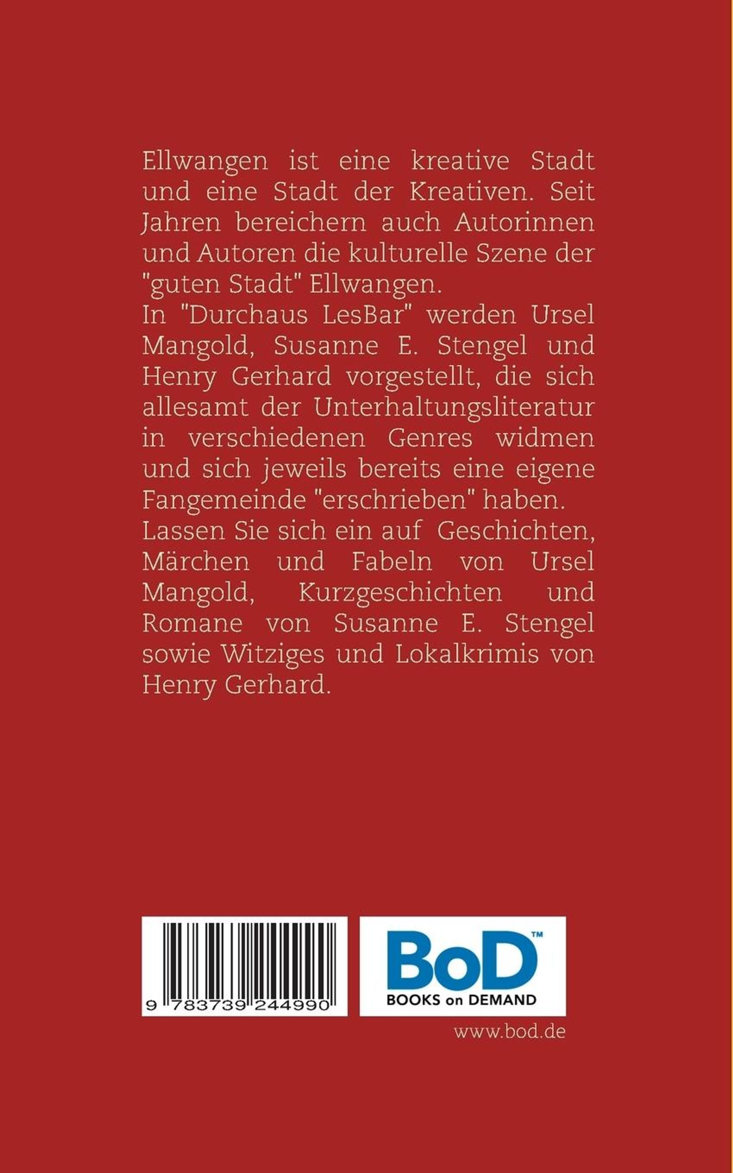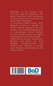 Ellwangen ist eine kreative Stadt und gleichzeitig eine Stadt der Kreativen. Seit Jahren bereichern auch Autorinnen und Autoren die kulturelle Szene der guten Stadt Ellwangen. In Durchaus LesBar Geschichten aus Ellwangen werden Ursel Mangold, Susanne E. Stengel und Henry Gerhard vorgestellt, die sich allesamt der Unterhaltungsliteratur in verschiedenen Genres widmen und sich mit ihren unterschiedlichen Werken bereits jeweils eine kleine, eigene Fangemeinde erschrieben haben. Die drei spannen dabei einen Bogen von der Kurzgeschichte über fantasievolle Romane bis zu den Ellwangen-Krimis. Gemeinsam ist ihnen die Freude am Erzählen von Geschichten und an der Unterhaltung ihrer Leserinnen und Leser. Lassen Sie sich ein auf Geschichten, Märchen und Fabeln von Ursel Mangold, auf Kurzgeschichten und Romane von Susanne E. Stengel sowie Witziges und Lokalkrimis von Henry Gerhard.