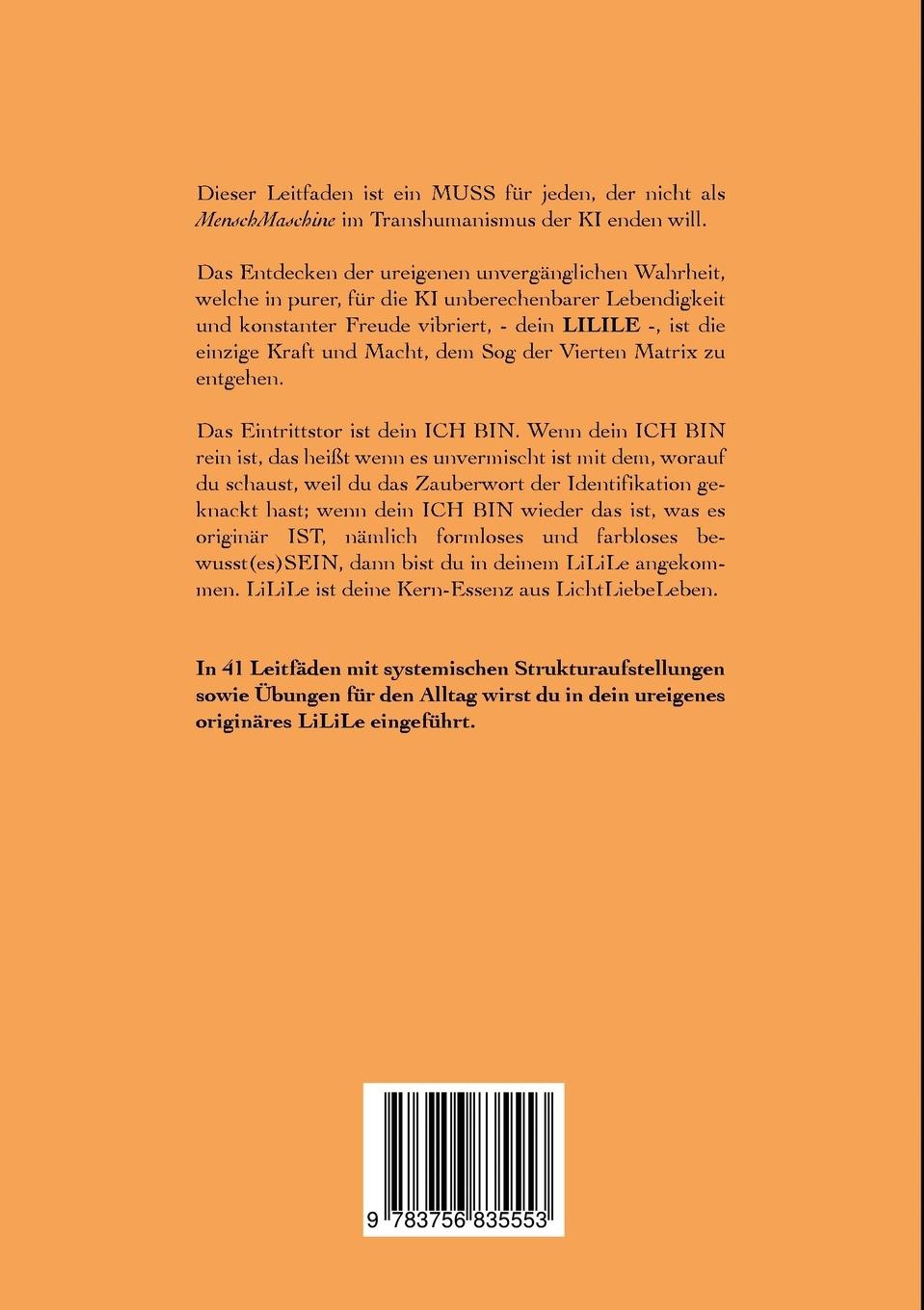 Dieser Leitfaden ist ein MUSS für jeden, der nicht als MenschMaschine im Transhumanismus der KI enden will. Denn das Entdecken der ureigenen unvergänglichen Wahrheit, welche in purer unberechenbarer Lebendigkeit und konstanter Freude vibriert, - DEIN LILILE -, ist die einzige Kraft und Macht, dem Sog der vierten Matrix zu entgehen.