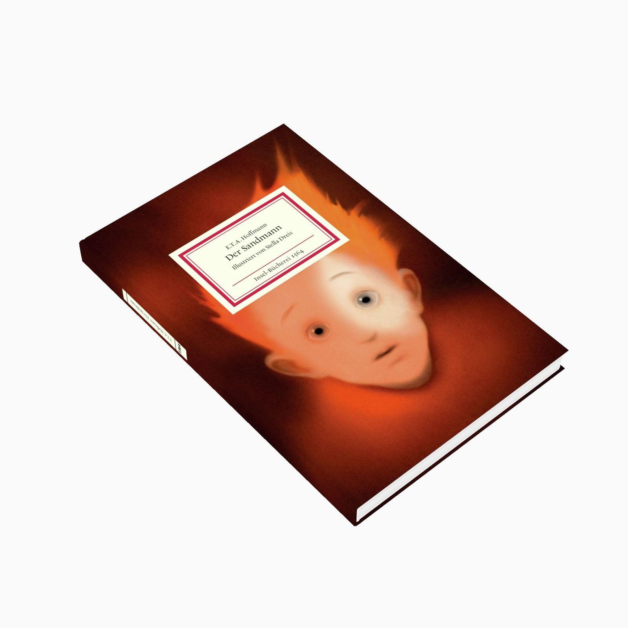 Text: "E.T.A. Hoffmann, Der Sandmann, Illustriert von Stella Dreis, Insel-Bücherei 1564." Illustration: Gesicht mit großen Augen., Buch