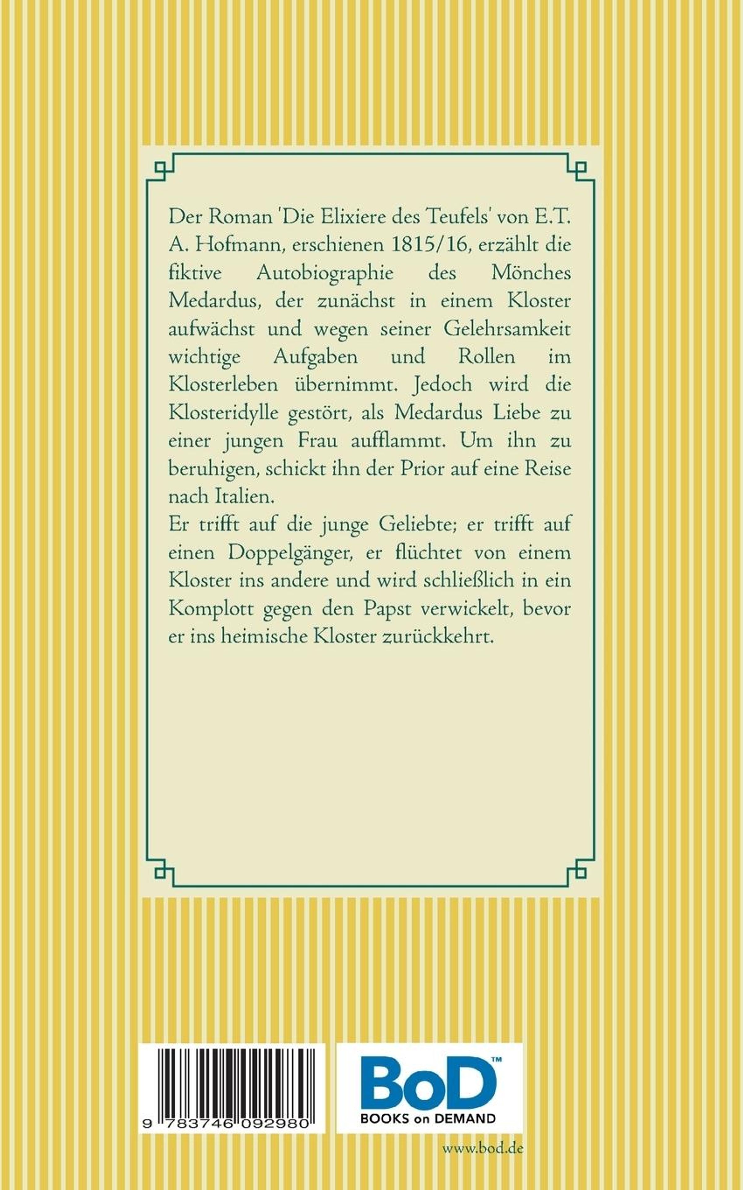 Der Roman 'Die Elixiere des Teufels' von E. T.A. Hofmann, erschienen 1815 / 16, erzählt die fiktive Autobiographie des Mönches Medardus, der zunächst in einem Kloster aufwächst und wegen seiner Gelehrsamkeit wichtige Aufgaben und Rollen im Klosterleben übernimmt. Jedoch wird die Klosteridylle gestört, als Medardus Liebe zu einer jungen Frau aufflammt. Um ihn zu beruhigen, schickt ihn der Prior auf eine Reise nach Italien. Er trifft auf die junge Geliebte; er trifft auf einen Doppelgänger, er flüchtet von einem Kloster ins andere und wird schließlich in ein Komplott gegen den Papst verwickelt, bevor er ins heimische Kloster zurückkehrt.