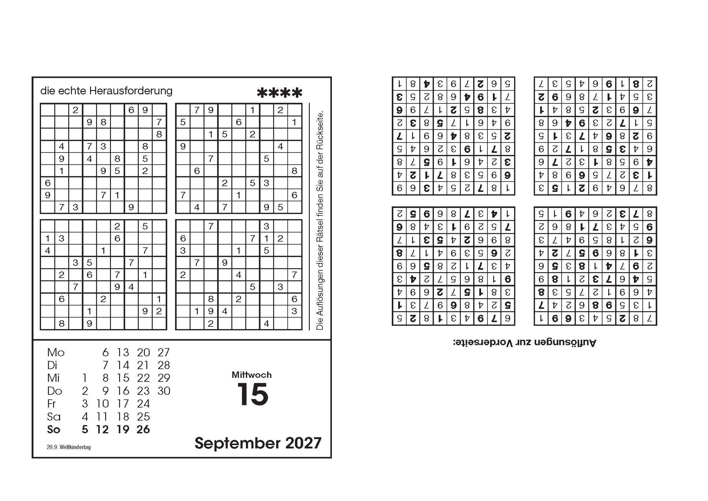 Für Sudoku-Einsteiger und fortgeschrittene Zahlenrätsel-Fans ein Muss: der übersichtliche Abreißkalender, der Blatt für Blatt vier neue Sudokus bietet - und das ein ganzes Jahr lang! Ein Kalender mit Suchtfaktor!