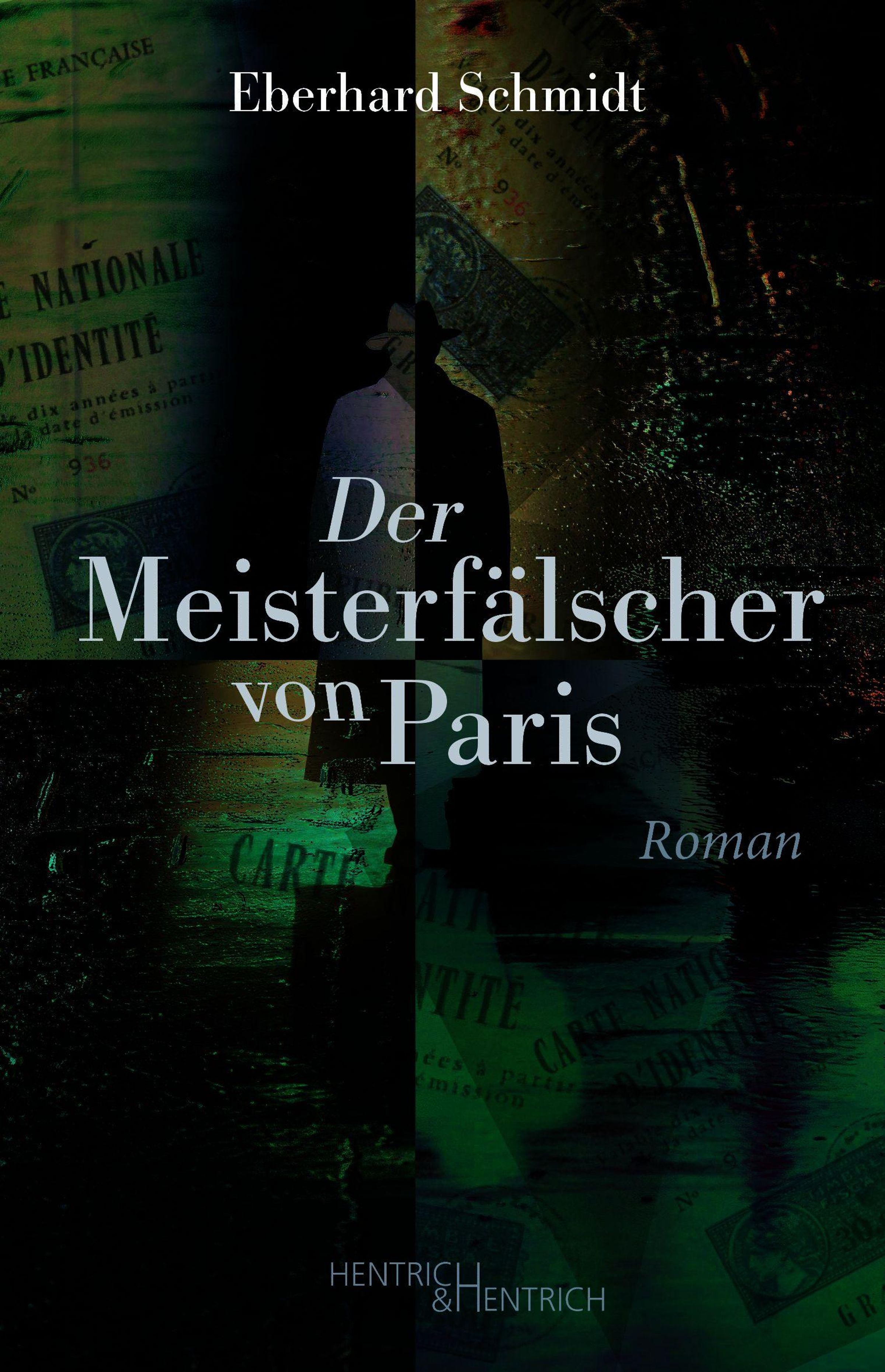 "Eberhard Schmidt, Der Meisterfälscher von Paris, Roman." Der Hintergrund zeigt dunkle, verschwommene Dokumente., Buch
