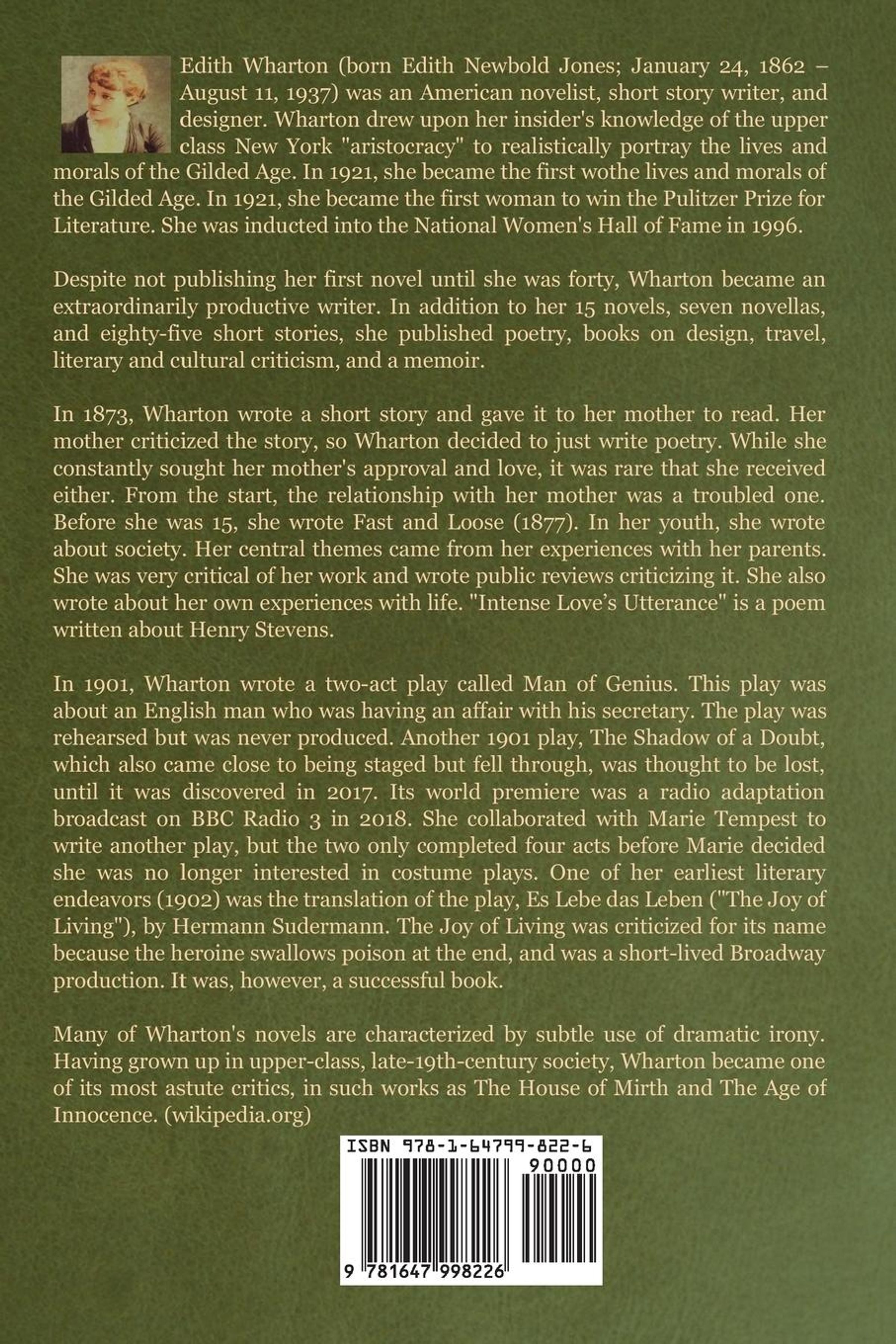 Edith Wharton (born Edith Newbold Jones; January 24, 1862 -- August 11, 1937) was an American novelist, short story writer, and designer. Wharton drew upon her insider's knowledge of the upper class New York "aristocracy" to realistically portray the lives and morals of the Gilded Age. In 1921, she became the first woman to win the Pulitzer Prize for Literature. She was inducted into the National Women's Hall of Fame in 1996. Despite not publishing her first novel until she was forty, Wharton became an extraordinarily productive writer. In addition to her 15 novels, seven novellas, and eighty-five short stories, she published poetry, books on design, travel, literary and cultural criticism, and a memoir. In 1873, Wharton wrote a short story and gave it to her mother to read. Her mother criticized the story, so Wharton decided to just write poetry. While she constantly sought her mother's approval and love, it was rare that she received either. From the start, the relationship with her mother was a troubled one. Before she was 15, she wrote Fast and Loose (1877). In her youth, she wrote about society. Her central themes came from her experiences with her parents. She was very critical of her work and wrote public reviews criticizing it. She also wrote about her own experiences with life. "Intense Love's Utterance" is a poem written about Henry Stevens. In 1901, Wharton wrote a two-act play called Man of Genius. This play was about an English man who was having an affair with his secretary. The play was rehearsed but was never produced. Another 1901 play, The Shadow of a Doubt, which also came close to being staged but fell through, was thought to be lost, until it was discovered in 2017. Its world premiere was a radio adaptation broadcast on BBC Radio 3 in 2018. She collaborated with Marie Tempest to write another play, but the two only completed four acts before Marie decided she was no longer interested in costume plays. One of her earliest literary endeavors (1902) was the translation of the play, Es Lebe das Leben ("The Joy of Living"), by Hermann Sudermann. The Joy of Living was criticized for its name because the heroine swallows poison at the end, and was a short-lived Broadway production. It was, however, a successful book. Many of Wharton's novels are characterized by subtle use of dramatic irony. Having grown up in upper-class, late-19th-century society, Wharton became one of its most astute critics, in such works as The House of Mirth and The Age of Innocence. (wikipedia. org)