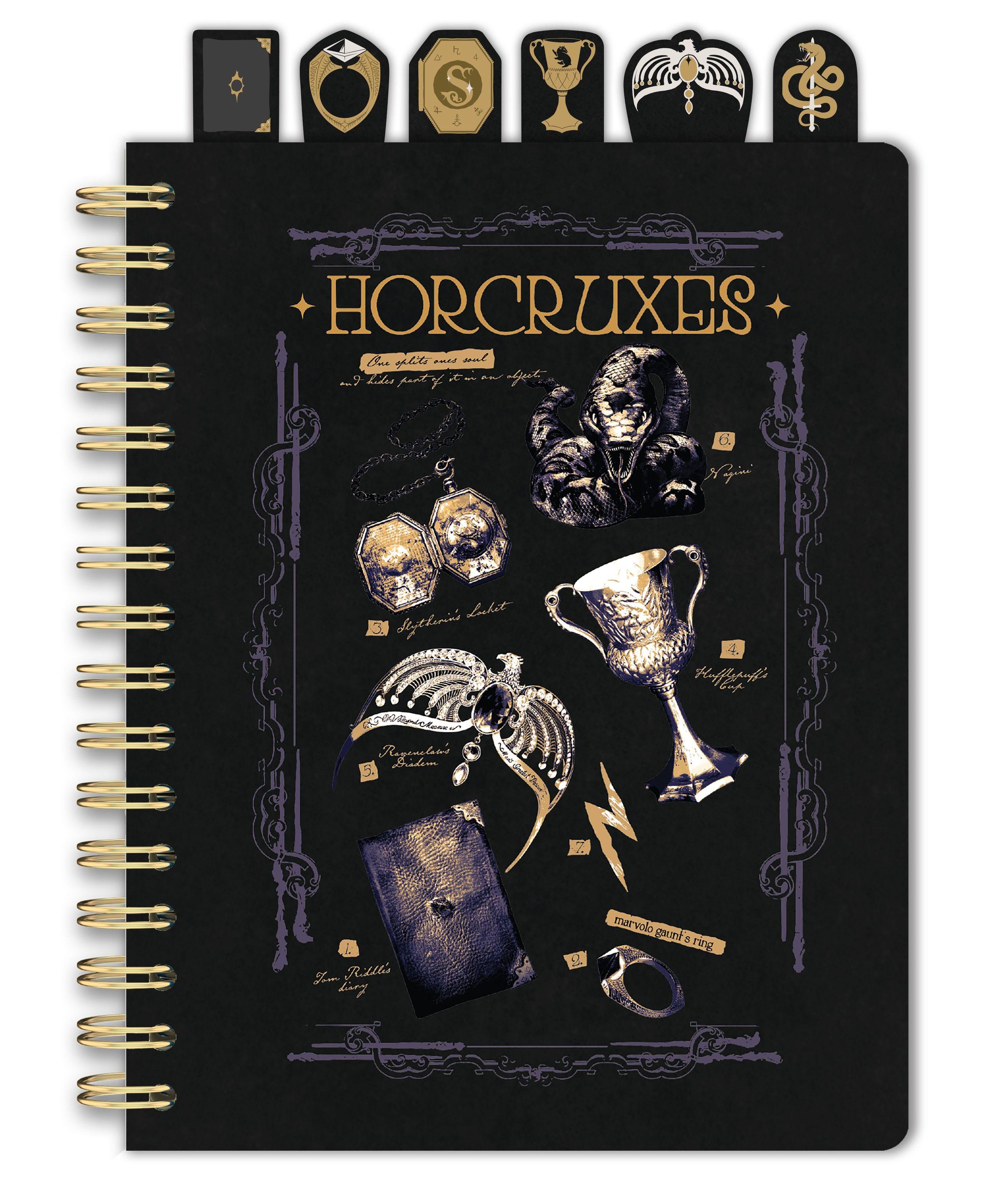 Organize multiple subjects in a single notebook with tabbed divider sections featuring Tom Riddle's diary, Marvolo Gaunt's ring, Nagini, and the other Horcruxes in this Dark Arts--inspired spiral notebook.