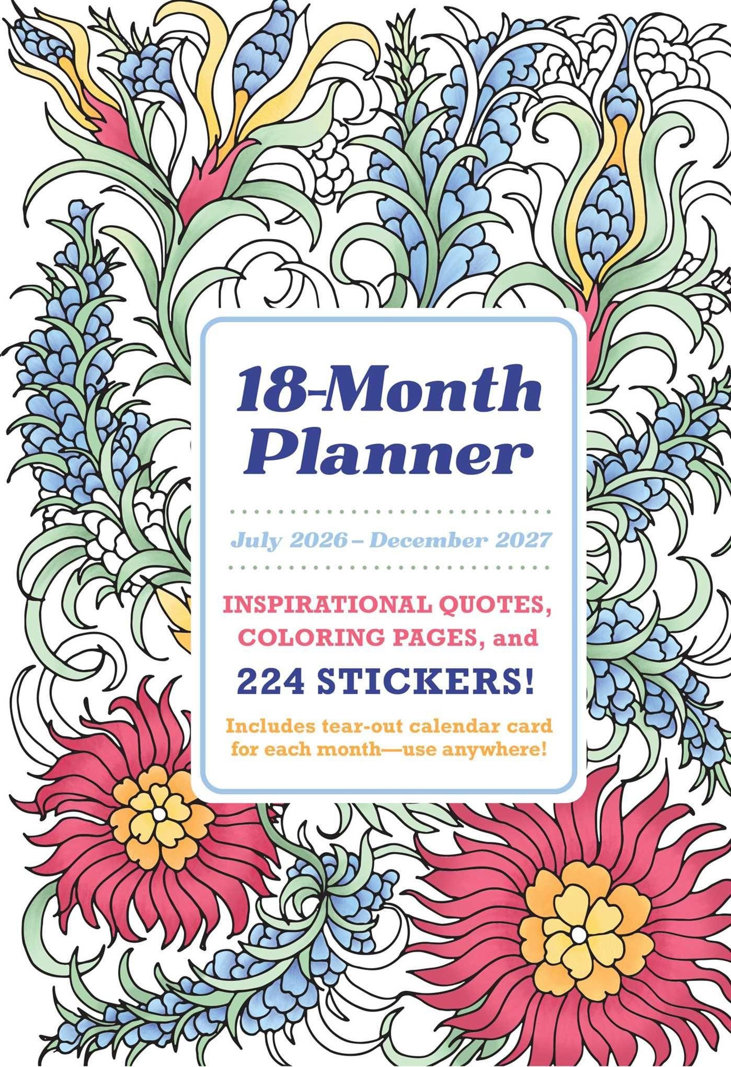 Every spread in this 18-month planner---covering July 2026 to December 2027---features an inspirational quote and an image to color. When you start off your week with a relaxing coloring activity instead of the dreaded Monday blahs, you'll soon find your mood improving in everything you do, whether at work, play, or a quiet evening at home. Also included are two sheets of colorful stickers that you can use to highlight important dates and events, as well as removable calendar cards with uplifting quotes for each month.
