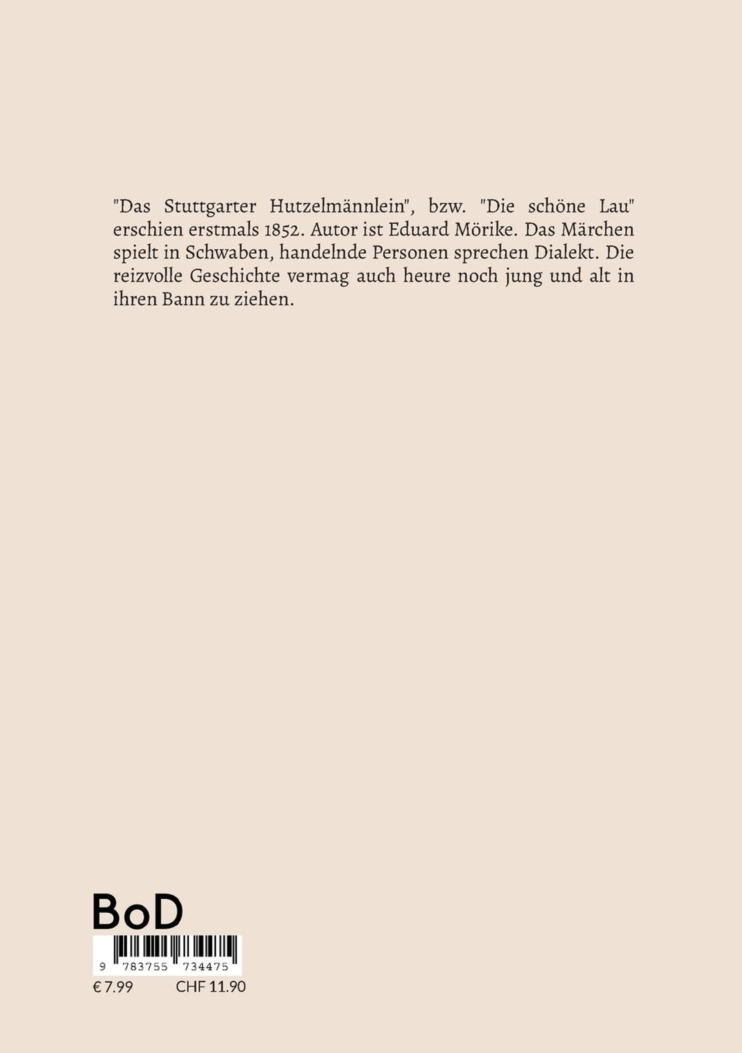 "Das Stuttgarter Hutzelmännlein", bzw. "Die schöne Lau" erschien erstmals 1852. Autor ist Eduard Mörike. Das Märchen spielt in Schwaben, handelnde Personen sprechen Dialekt. Die reizvolle Geschichte vermag auch heure noch jung und alt in ihren Bann zu ziehen.