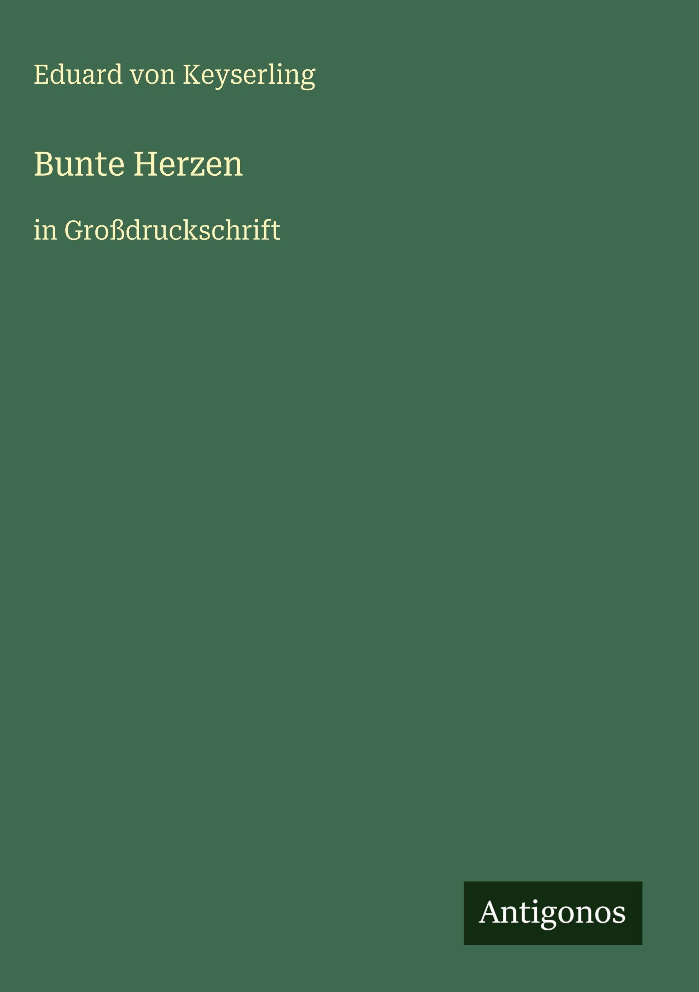 Titel: "Bunte Herzen in Großdruckschrift" von Eduard von Keyserling. Unten rechts kleines Logo "Antigonos". Hintergrund: Dunkelgrün., Buch