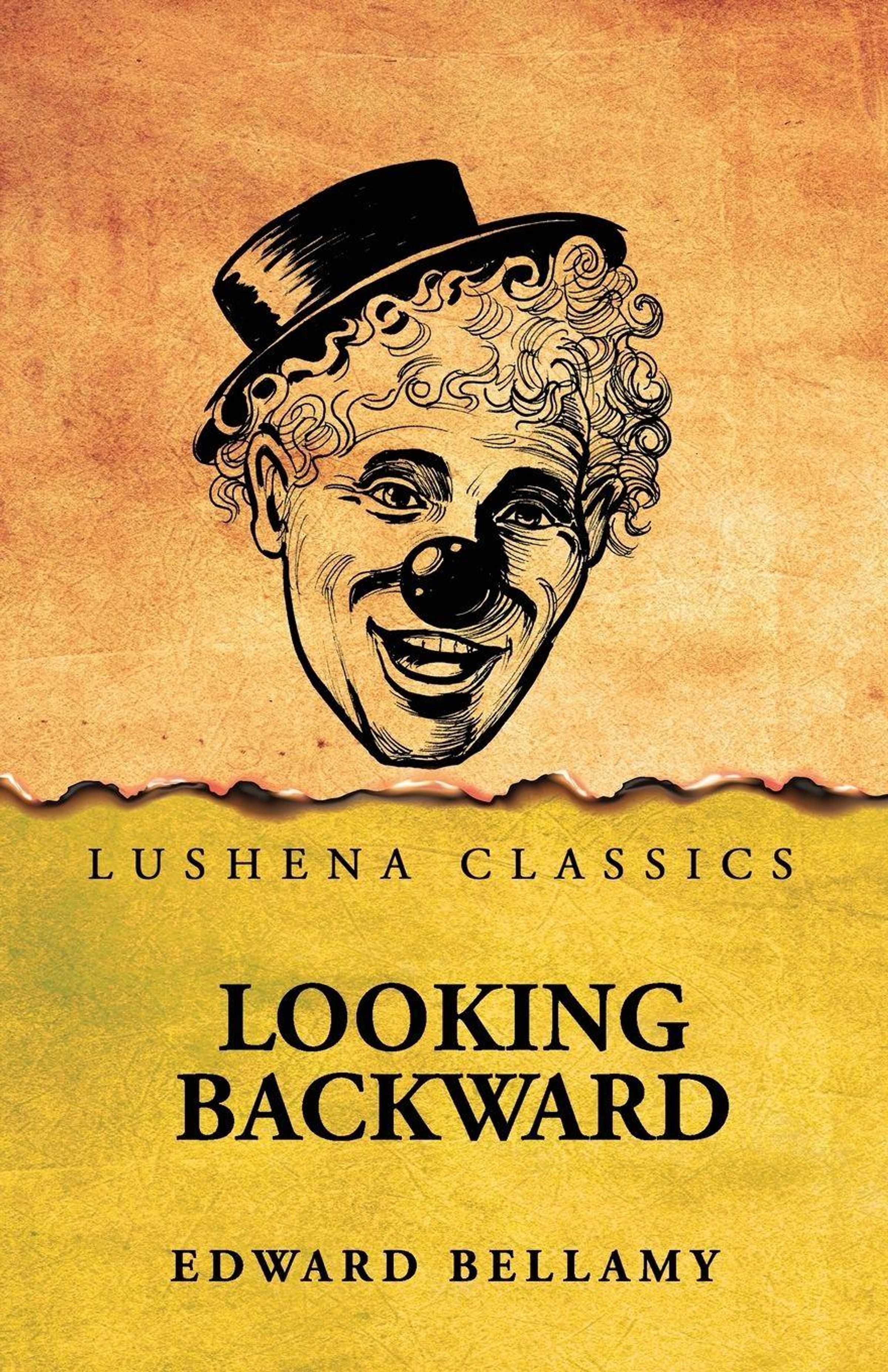 "LUSHENA CLASSICS" und "LOOKING BACKWARD" von "EDWARD BELLAMY". Illustration von einem lachenden Clown mit Hut., Buch