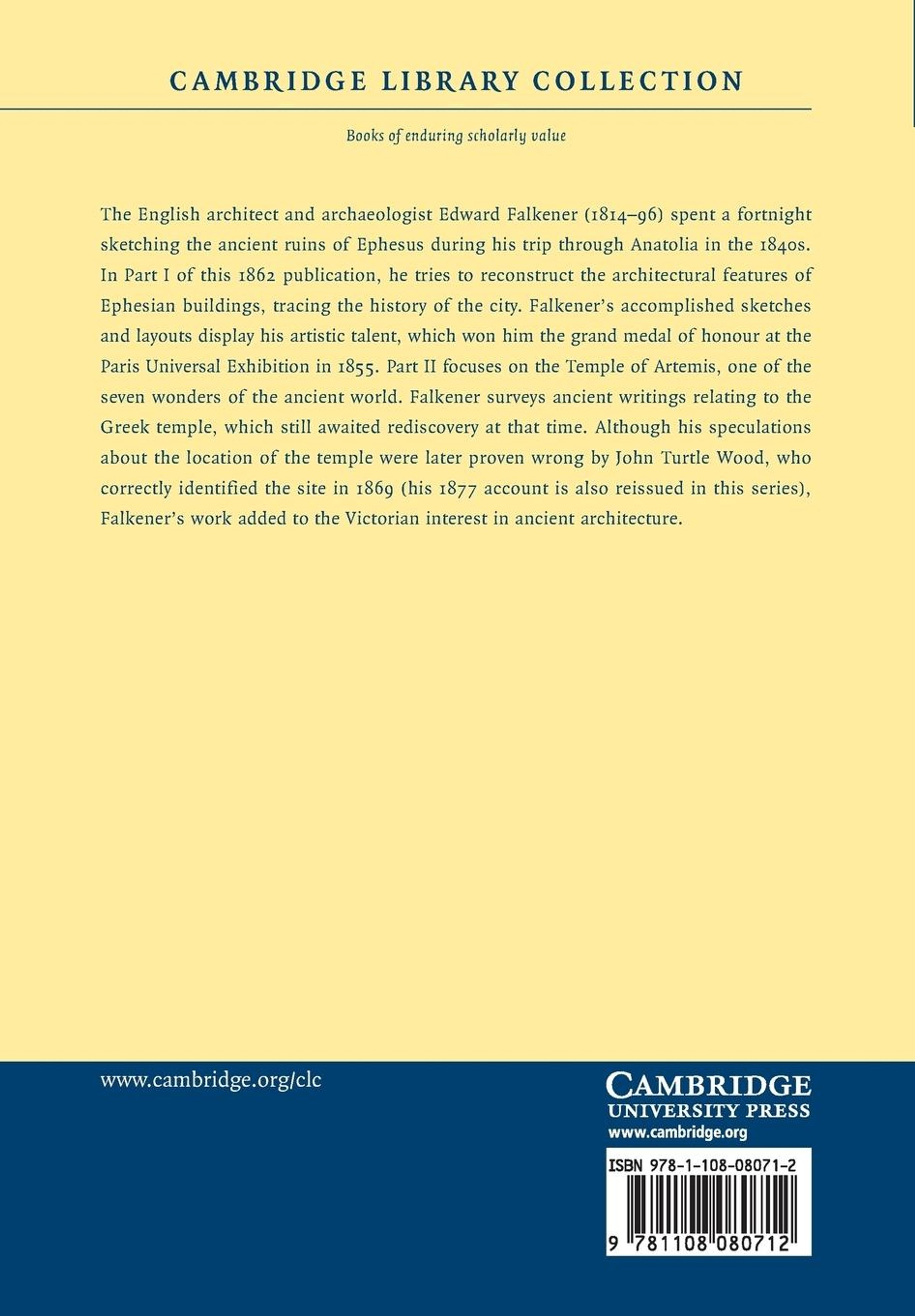 The English architect and archaeologist Edward Falkener (1814-96) spent a fortnight sketching the ancient ruins of Ephesus during his trip through Anatolia in the 1840s. In Part I of this 1862 publication, he tries to reconstruct the architectural features of Ephesian buildings, tracing the history of the city. Falkener's accomplished sketches and layouts display his artistic talent, which won him the grand medal of honour at the Paris Universal Exhibition in 1855. Part II focuses on the Temple of Artemis, one of the seven wonders of the ancient world. Falkener surveys ancient writings relating to the Greek temple, which still awaited rediscovery at that time. Although his speculations about the location of the temple were later proven wrong by John Turtle Wood, who correctly identified the site in 1869 (his 1877 account is also reissued in this series), Falkener's work added to the Victorian interest in ancient architecture.