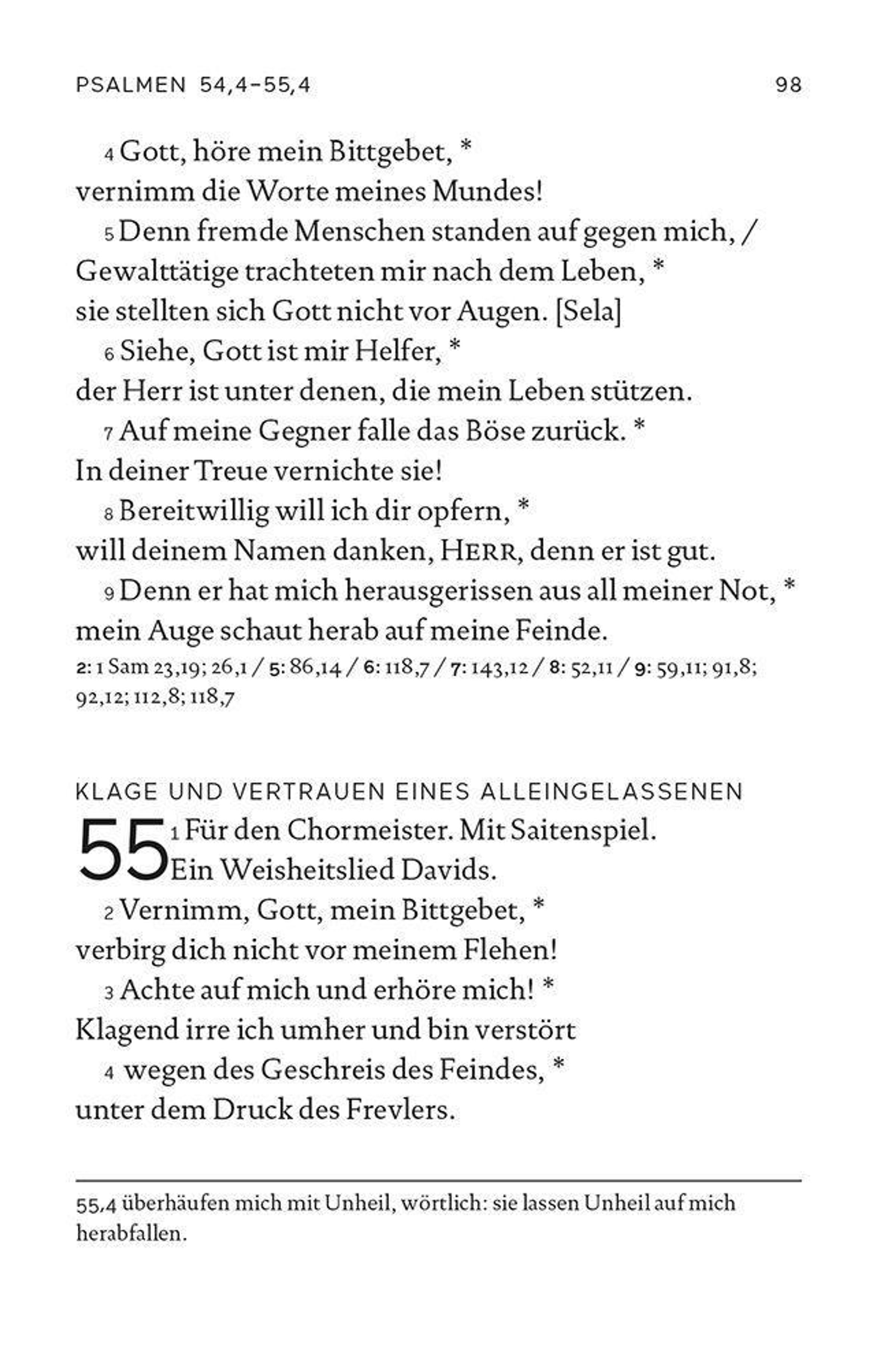 Die Psalmen sind jahrtausendalte Gebete. Sie verbinden Generationen von Menschen, die sie gebetet haben und heute noch beten. Diese Ausgabe im handlichen Format für unterwegs ist in einem einspaltigen Satz in schwarz-weiß Layout und gut lesbarer Typografie gedruckt. Eine allgemeinverständliche Einführung von Egbert Ballhorn erschließt die Psalmen für heutige Leser: innen. Die Ausgabe beinhaltet alle 150 Psalmen in praktischem Taschenformat.