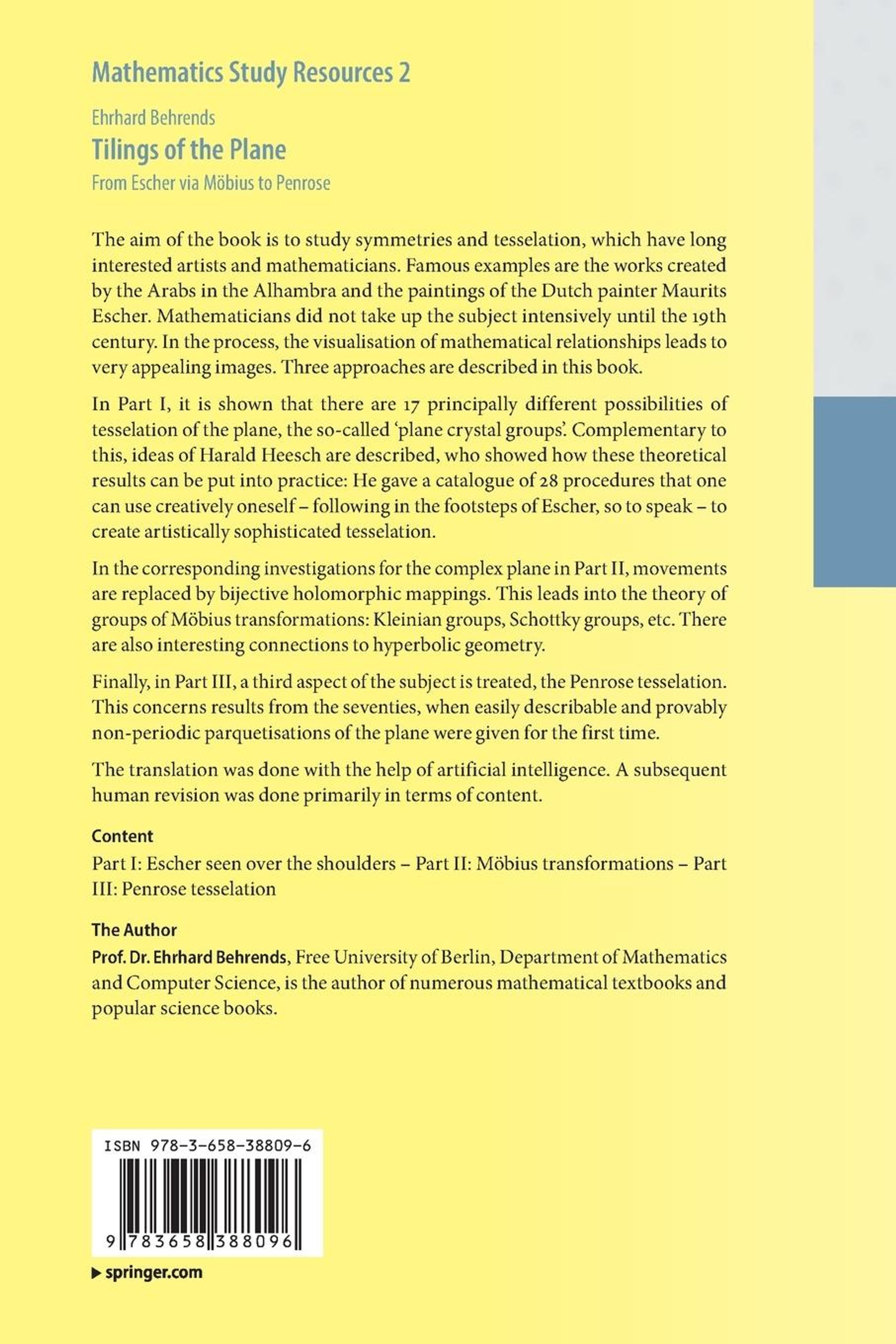 The aim of the book is to study symmetries and tesselation, which have long interested artists and mathematicians. Famous examples are the works created by the Arabs in the Alhambra and the paintings of the Dutch painter Maurits Escher. Mathematicians did not take up the subject intensively until the 19th century. In the process, the visualisation of mathematical relationships leads to very appealing images. Three approaches are described in this book. In Part I, it is shown that there are 17 principally different possibilities of tesselation of the plane, the so-called 'plane crystal groups'. Complementary to this, ideas of Harald Heesch are described, who showed how these theoretical results can be put into practice: He gave a catalogue of 28 procedures that one can use creatively oneself - following in the footsteps of Escher, so to speak - to create artistically sophisticated tesselation. In the corresponding investigations forthe complex plane in Part II, movements are replaced by bijective holomorphic mappings. This leads into the theory of groups of Möbius transformations: Kleinian groups, Schottky groups, etc. There are also interesting connections to hyperbolic geometry. Finally, in Part III, a third aspect of the subject is treated, the Penrose tesselation. This concerns results from the seventies, when easily describable and provably non-periodic parquetisations of the plane were given for the first time.