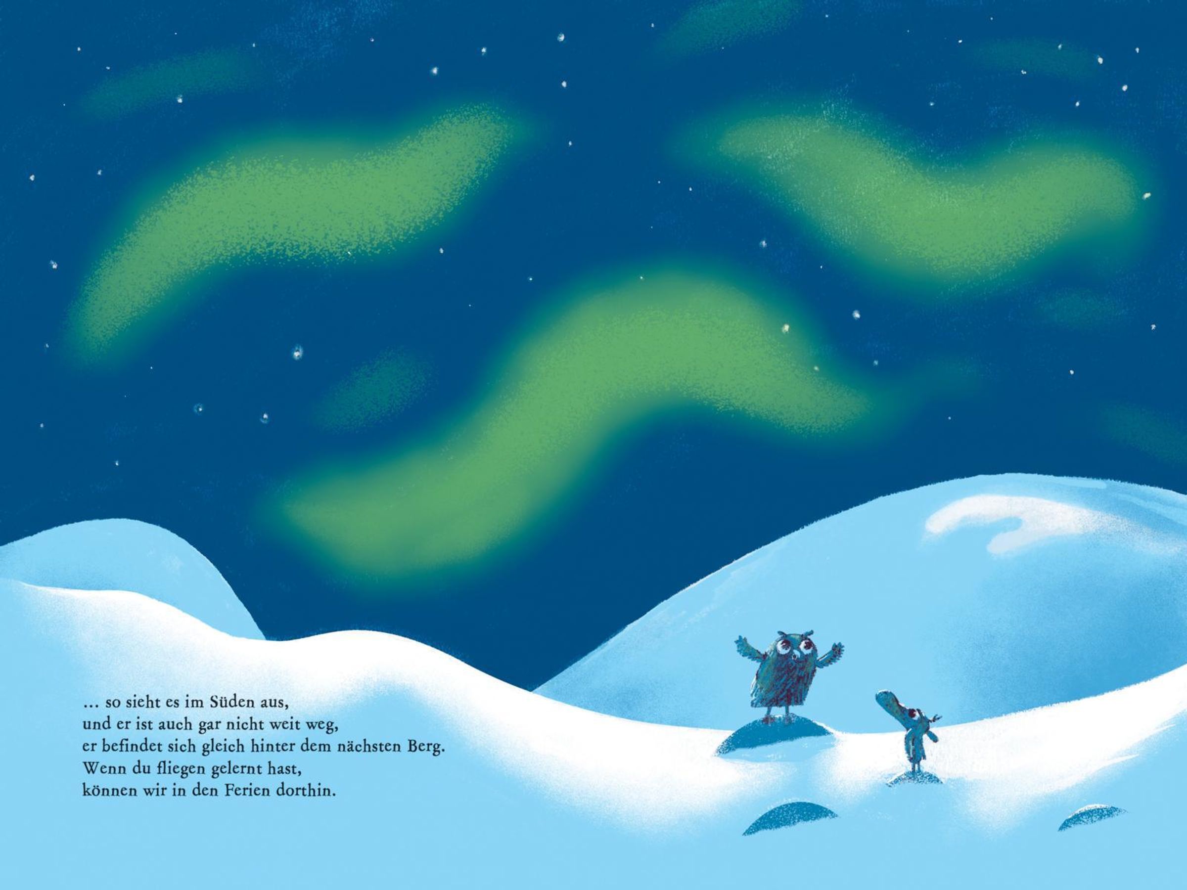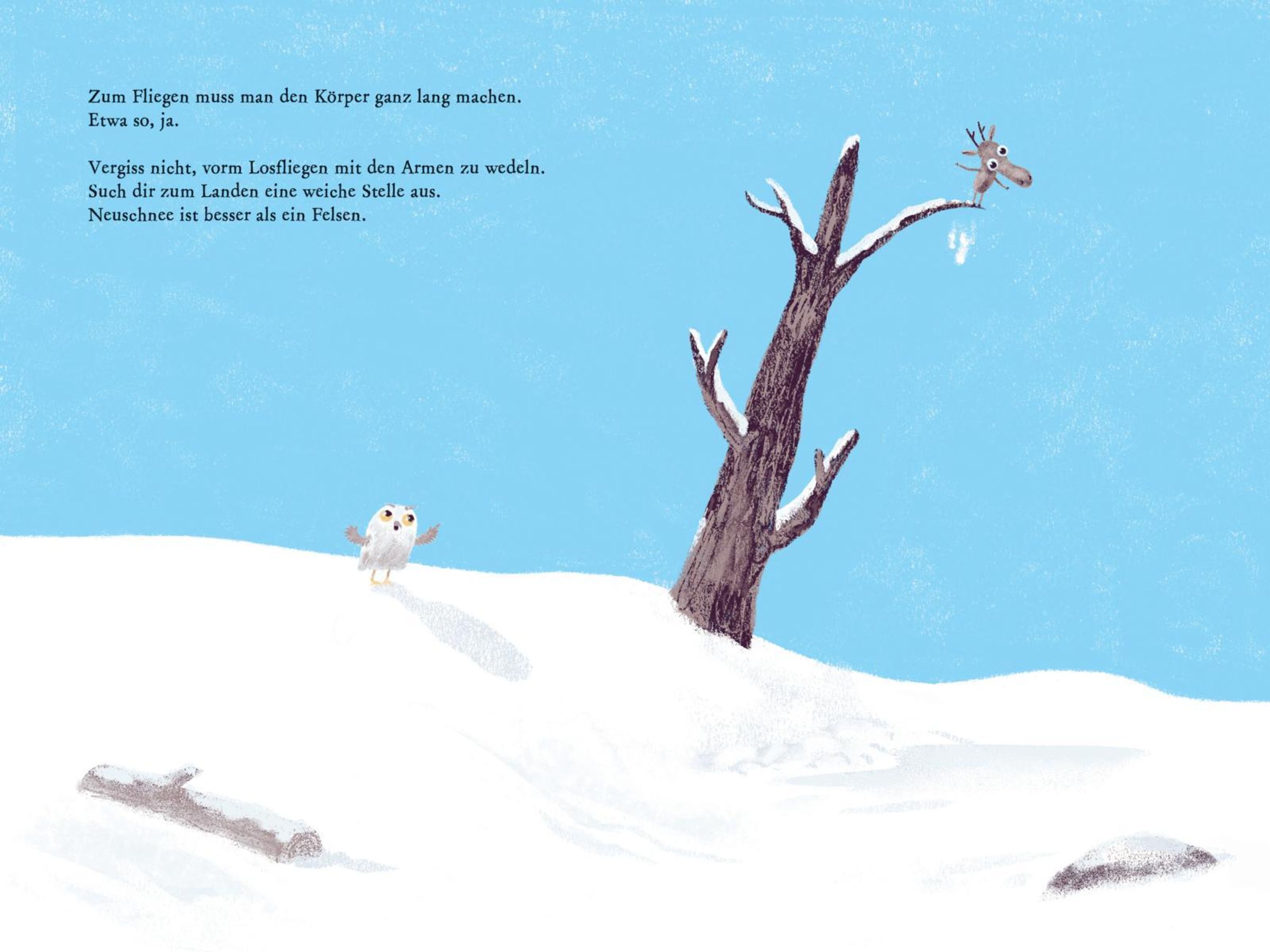 Ein kleines Rentier wünscht sich nichts sehnlicher, als wie die Vögel in den Süden zu fliegen - doch seine eiskalten Hufe stecken im Schnee fest. Also macht es sich mit klopfendem Herzen auf zur weisen Eule, die alles über das Fliegen weiß. Zwischen flatternden Versuchen, warmen Ratschlägen und einem wachsenden Funken Hoffnung entdeckt das Rentier, dass man alles schaffen kann, wenn man das Ziel fest im Blick hat.