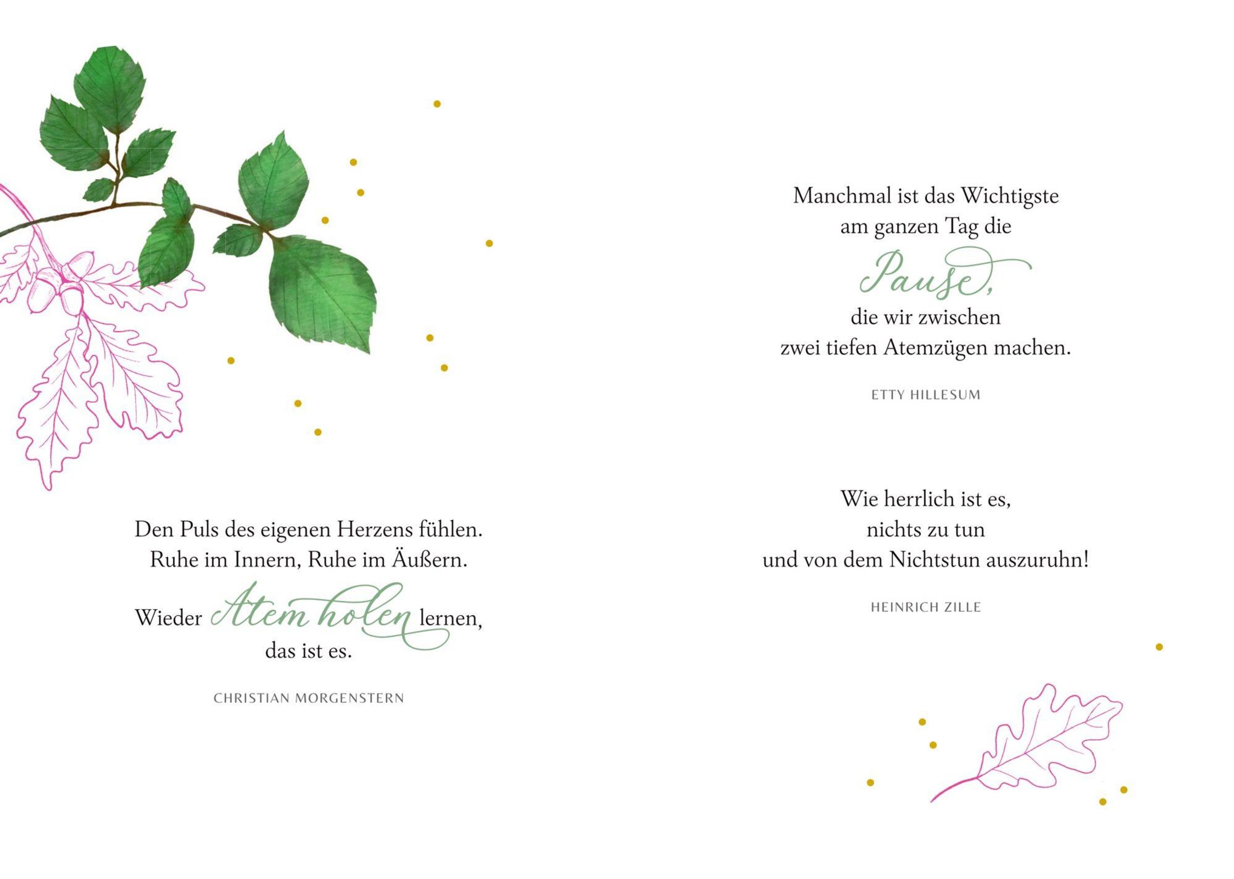 Geschichten, Gedanken und Tipps für kleine Auszeiten Zauberhafte Naturillustrationen Hochwertige Ausstattung mit Strukturpapier und Goldfolie Ein Geschenk für Menschen, denen wir Ruhe im Leben gönnen Eine kleine Oase der Ruhe im stressigen Alltag - dieses Buch bietet sie. Es vereint inspirierende Texte und praktische Tipps. Ideal für alle, denen wir eine kleine Auszeit vom täglichen Stress wünschen. Hochwertig ausgestattet mit Strukturpapier, Goldfolie und geprägtem Etikett - ein Geschenk voller Herzenswärme.