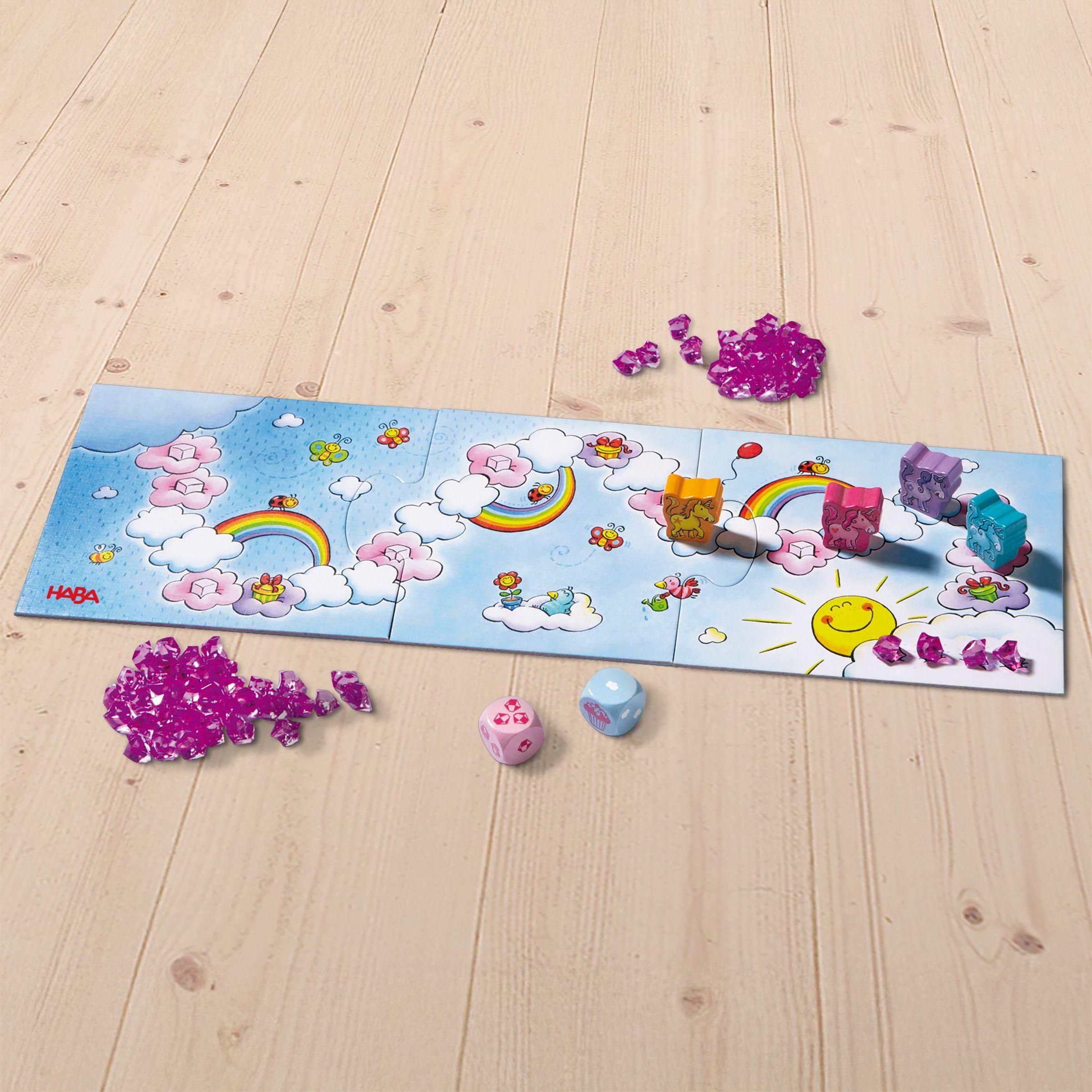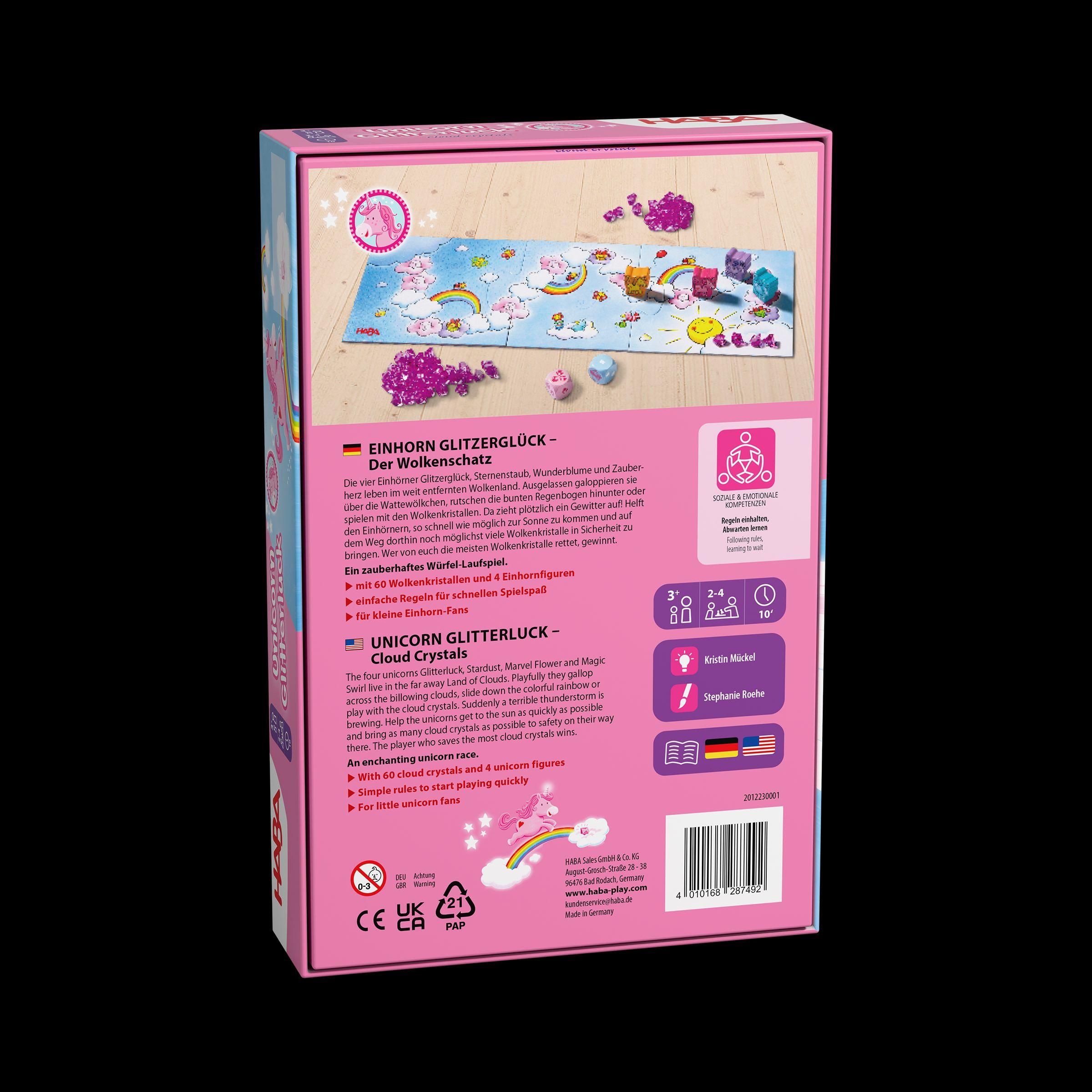 Die vier Einhörner Glitzerglück, Sternenstaub, Wunderblume und Zauberherz leben im weit entfernten Wolkenland. Ausgelassen galoppieren sie über die Wattewölkchen, rutschen die bunten Regenbogen hinunter oder spielen mit den Wolkenkristallen. Da zieht plötzlich ein Gewitter auf! Wer hilft den Einhörnern, so schnell wie möglich zur Sonne zu kommen und auf dem Weg dorthin noch möglichst viele Wolkenkristalle in Sicherheit zu bringen? Wer die meisten Wolkenkristalle rettet, gewinnt.