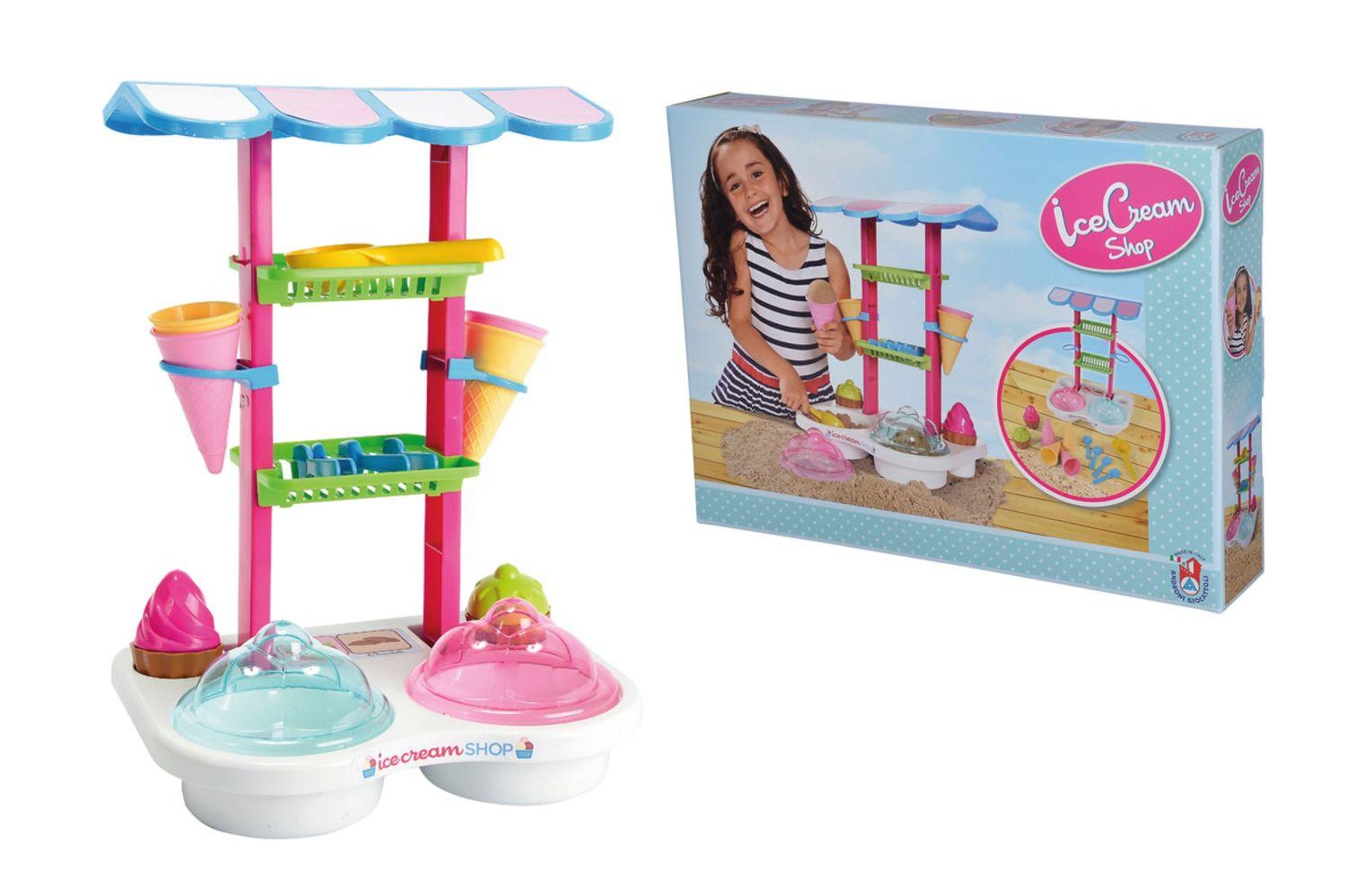 Teile enthalten: Eisdiele mit 2 Ablagefächern, Halter für Eiswaffeln und 2 Eisbehälter, 2 Cup Cake Formen, 4 Löffel, 4 Waffeln und ein Eiskugellöffel. Für Kinder ab 1 Jahr geeignet.