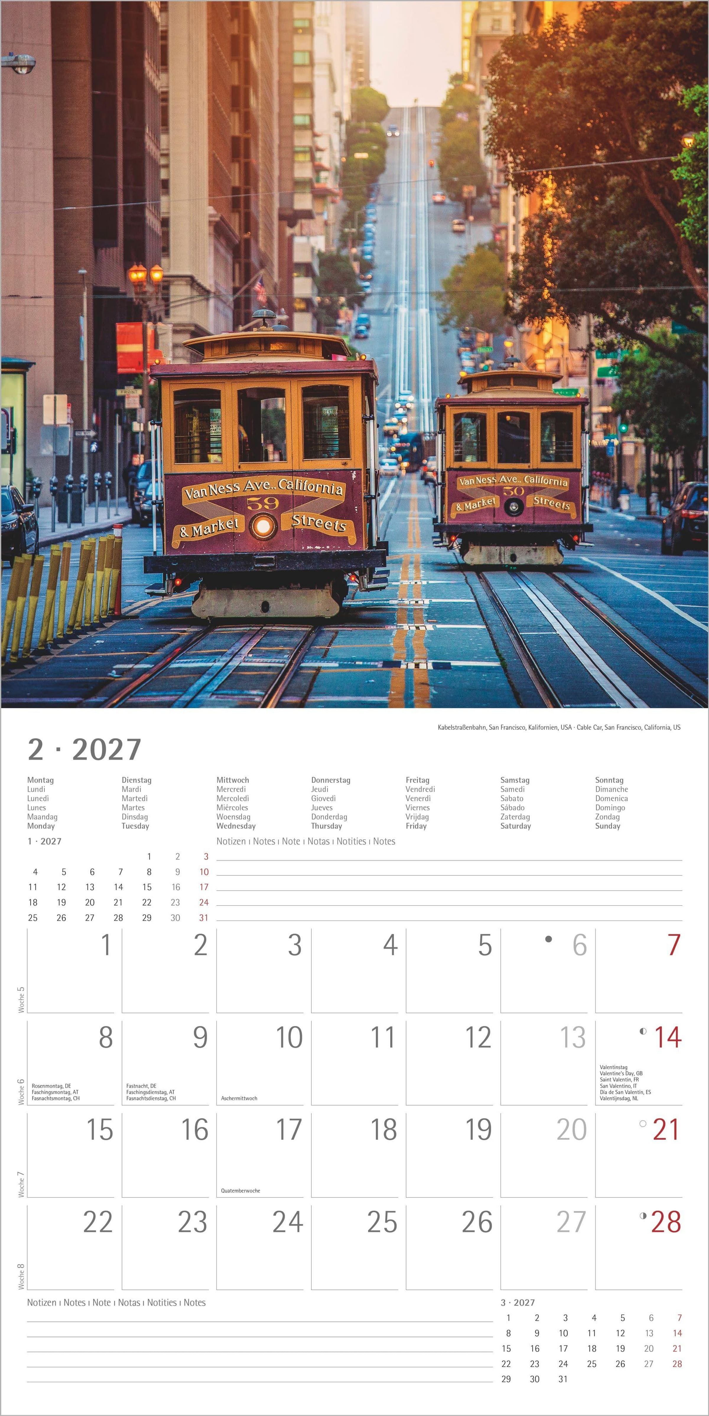 Im großzügigen Format 30 x 30 cm (aufgeklappt 30 x 60 cm) kommen die mächtigen Dampfloks und detailreichen Aufnahmen von Eisenbahnen perfekt zur Geltung. Das übersichtliche, 6-sprachige Kalendarium bietet viel Platz für persönliche Termine und Notizen, zeigt Feiertage vieler Länder und enthält Ferientermine für Deutschland, Österreich und die Schweiz. Zusätzlich finden Sie auf jeder Seite eine Monatsübersicht des Vor- und Folgemonats für eine bequeme Planung.