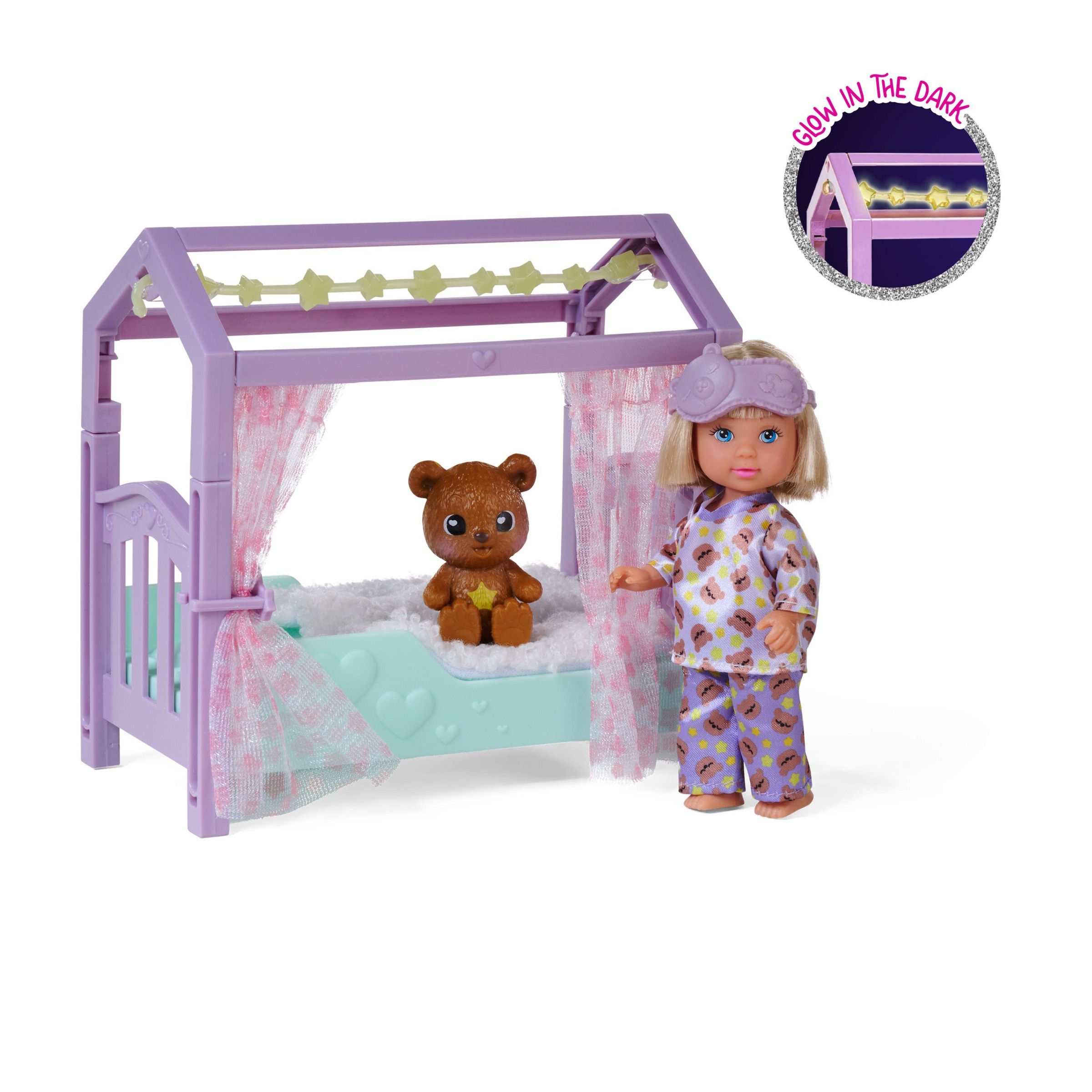 Evi im Schlafanzug mit Schlafmaske, flauschiger Decke, Teddy und Bett mit GID, 12cm, WB, 3J+