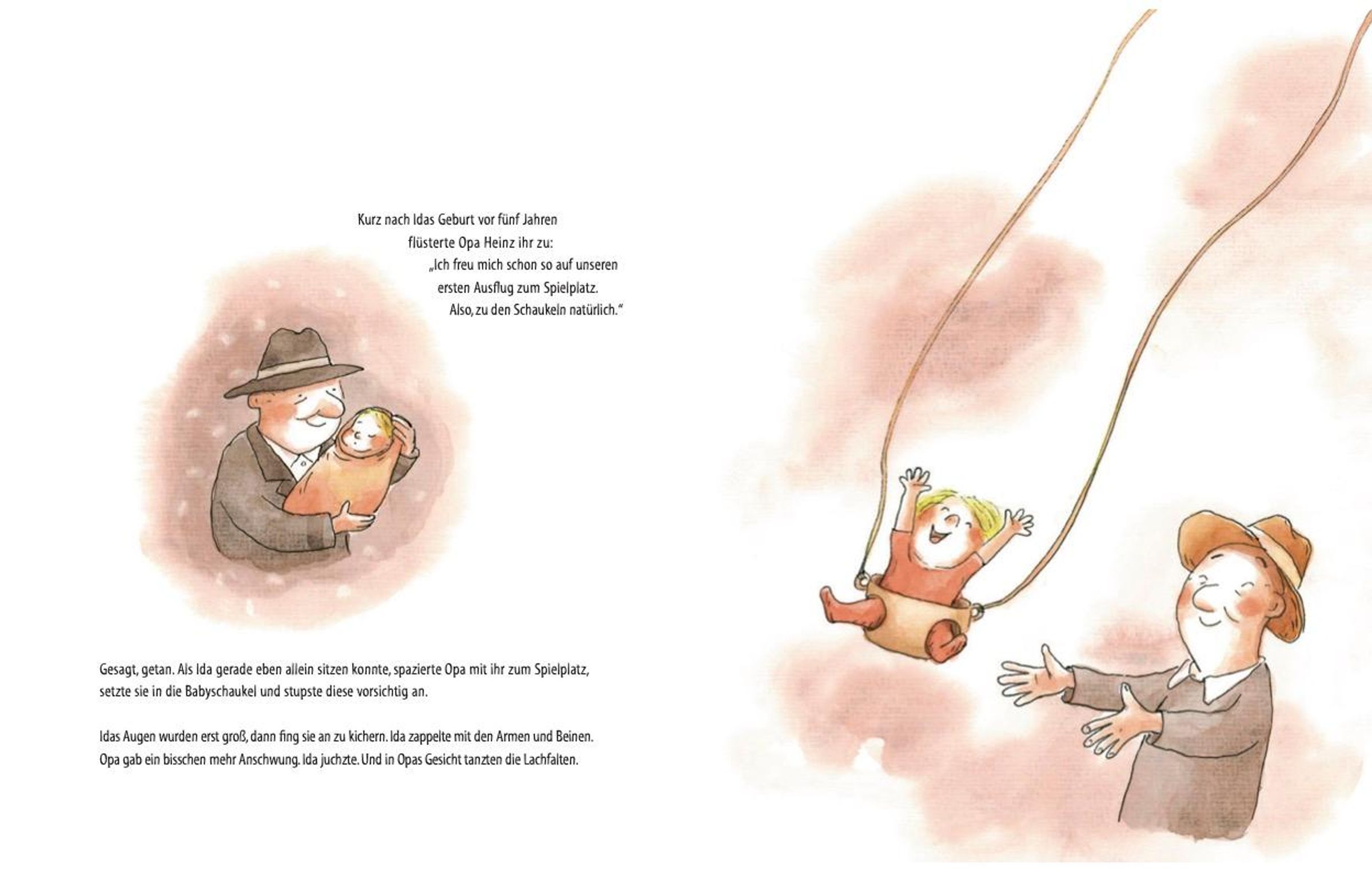 Am allerliebsten schaukelt Ida mit ihrem Opa Heinz. So doll, bis sein Hut wegfliegt, den er immer trägt. Doch eines Tages hat Opas Herz aufgehört zu schlagen. Nun hat Ida viele Fragen rund um den Tod, ihren Schmerz und die Bestattung, die ihr ihre Familie und ihre Freunde ehrlich und behutsam beantworten. Unsterbliche Quallen sind dabei ebenso Thema wie Seelen und Menschen im Himmel. Stück für Stück begreift Ida, was es mit dem Sterben auf sich hat.