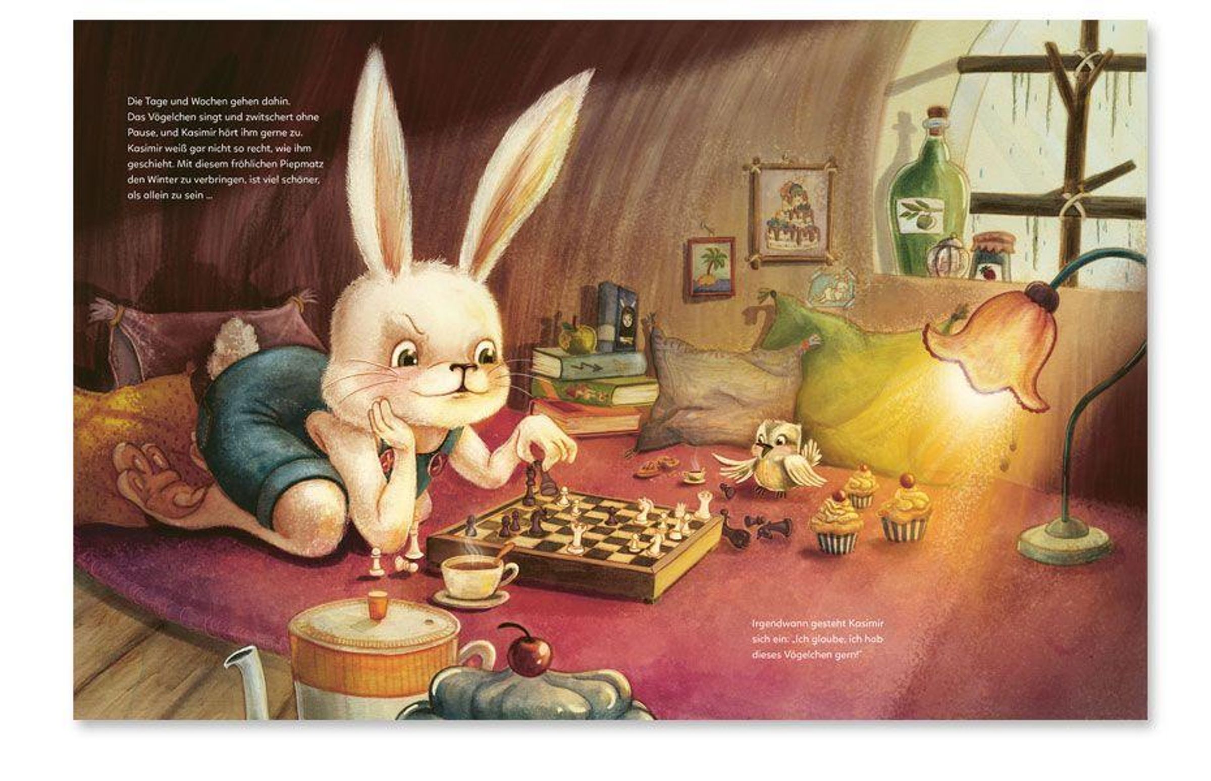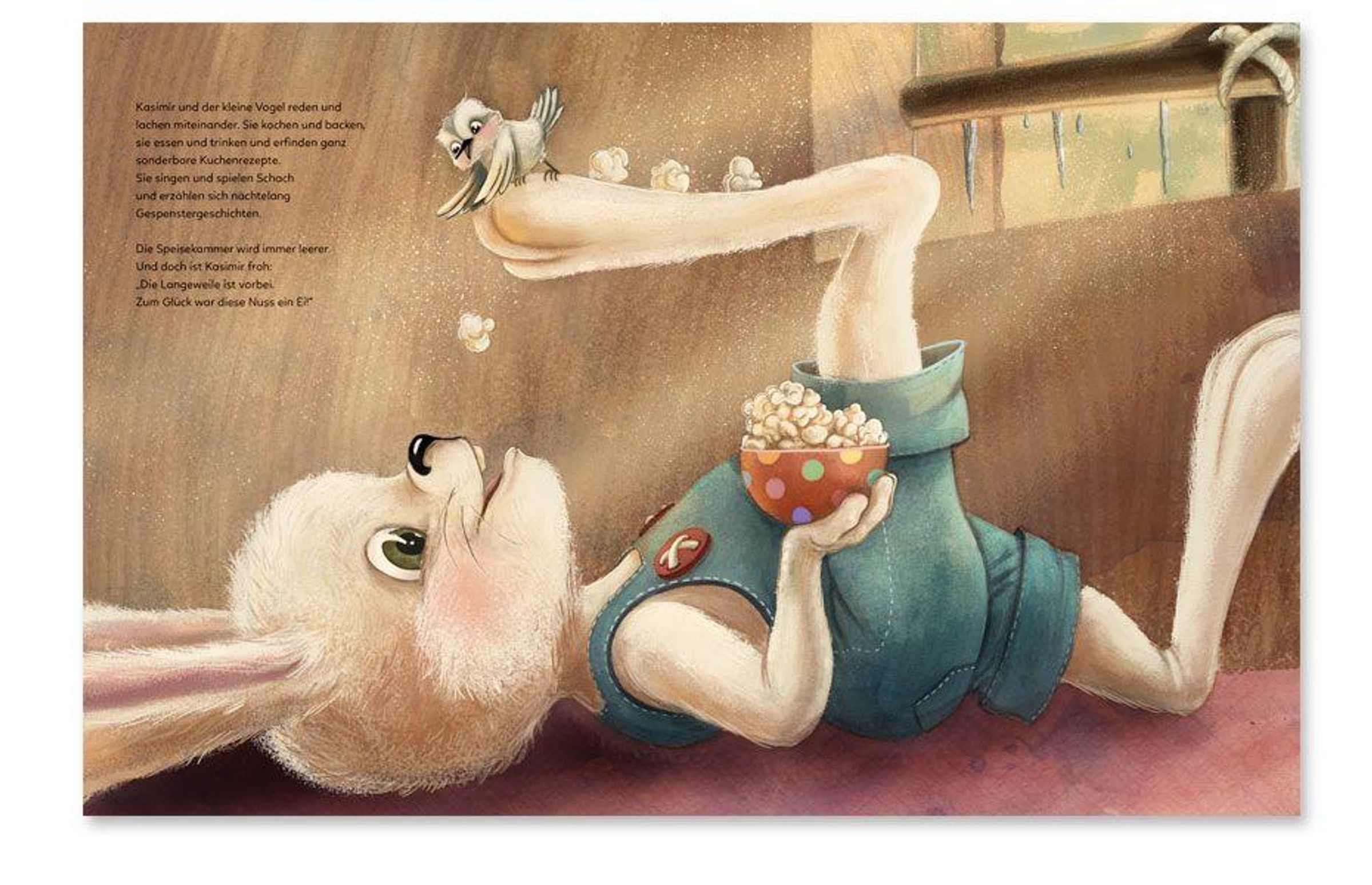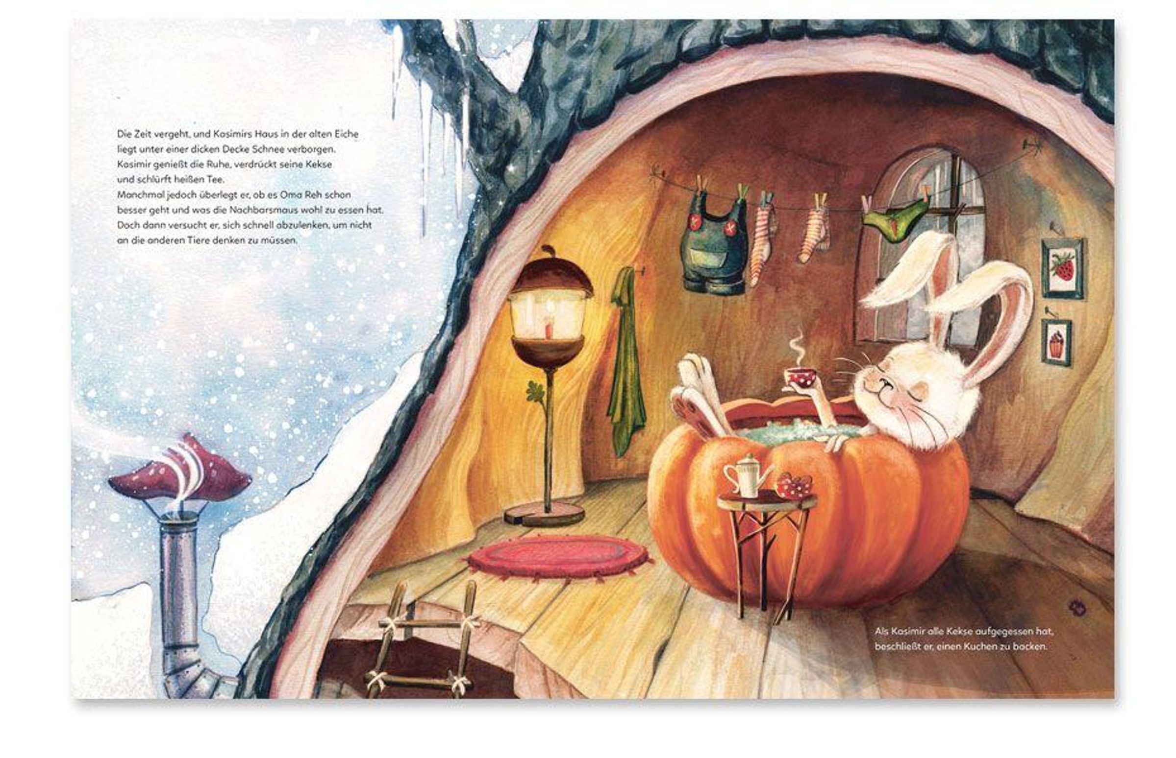 Der Hase Kasimir liebt es, Vorräte zu sammeln. In seinem Zuhause in der alten Eiche stapeln sich vor dem Wintereinbruch Feldfrüchte, Obst, Pilze und Nüsse. Davon gibt er nur ungern anderen Tieren ab. Sollen sie doch selber vorsorgen! Doch dann kommt Kasimir unfreiwillig zu einem kleinen Mitbewohner und lernt zu seiner eigenen Überraschung die Vorzüge des geselligen Lebens und Füreinander-Sorgens kennen. Miteinander, erkennt er, ist das Leben so viel schöner ...