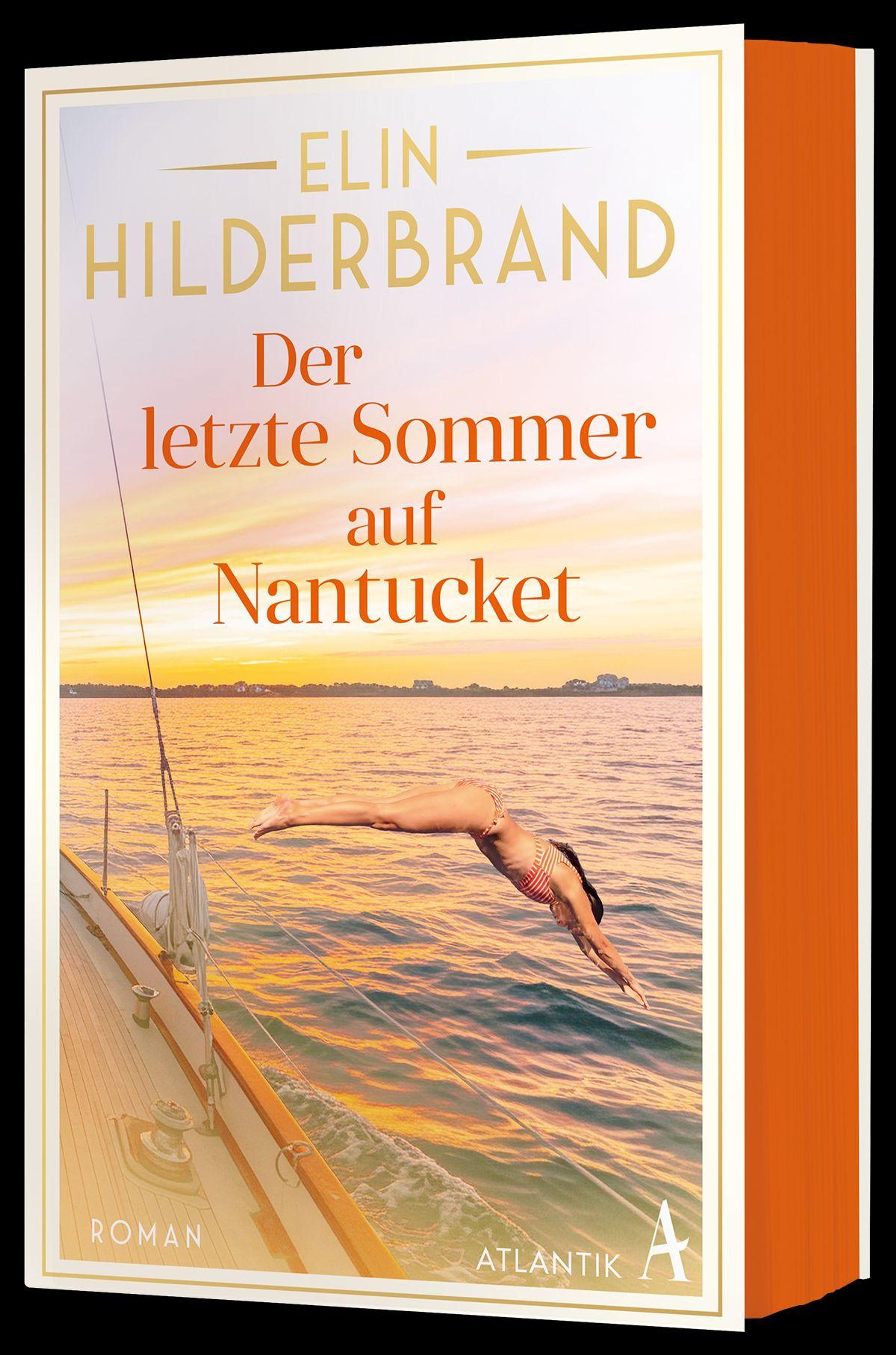 „Der letzte Sommer auf Nantucket“ von Elin Hilderbrand. Eine Frau springt von einem Boot ins Meer bei Sonnenuntergang., Buch