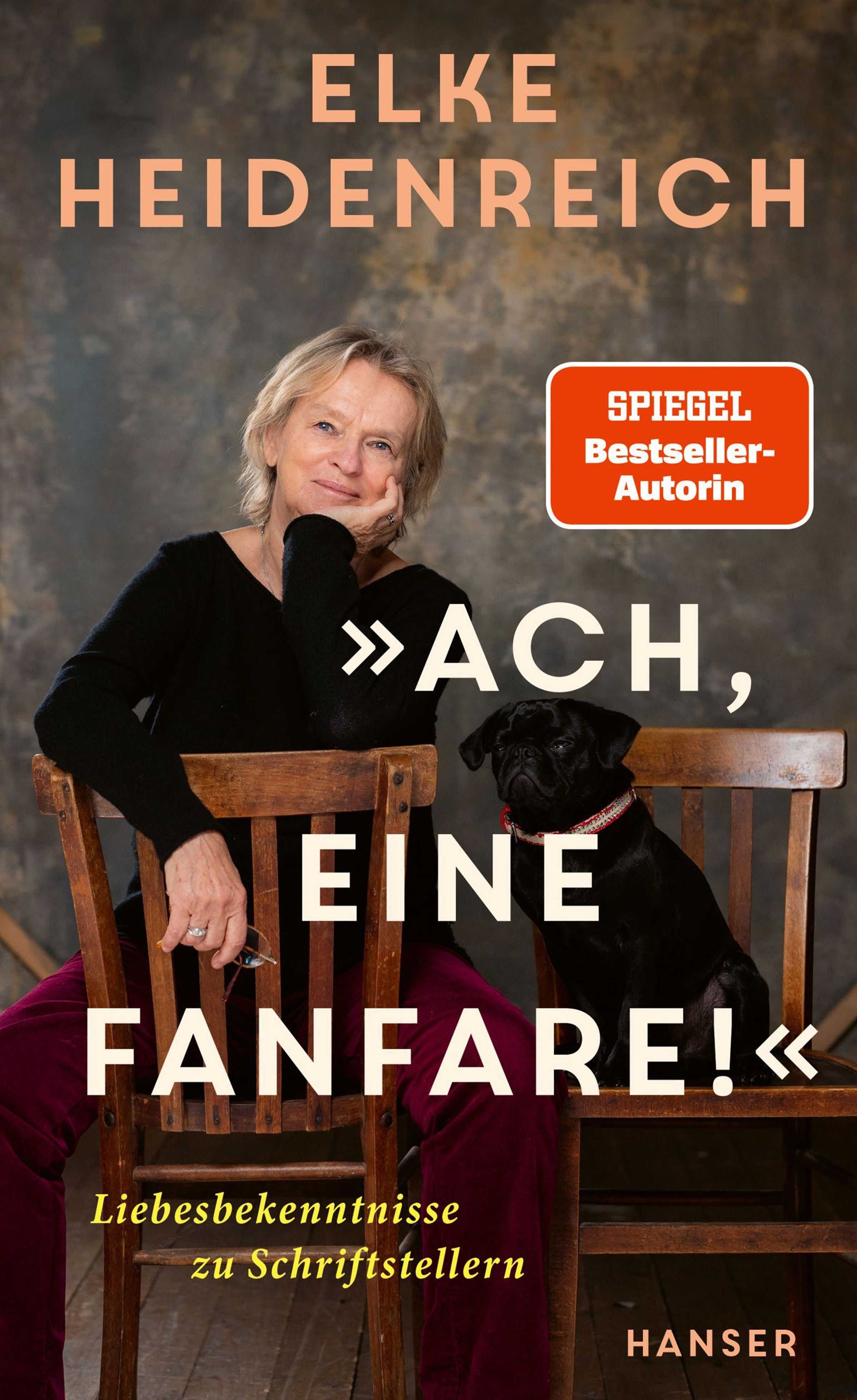 Der Text lautet: "Elke Heidenreich. »Ach, eine Fanfare!« Liebesbekenntnisse zu Schriftstellern. Spiegel Bestseller-Autorin". Eine Frau sitzt lächelnd mit einem schwarzen Hund auf Holzstühlen., Buch