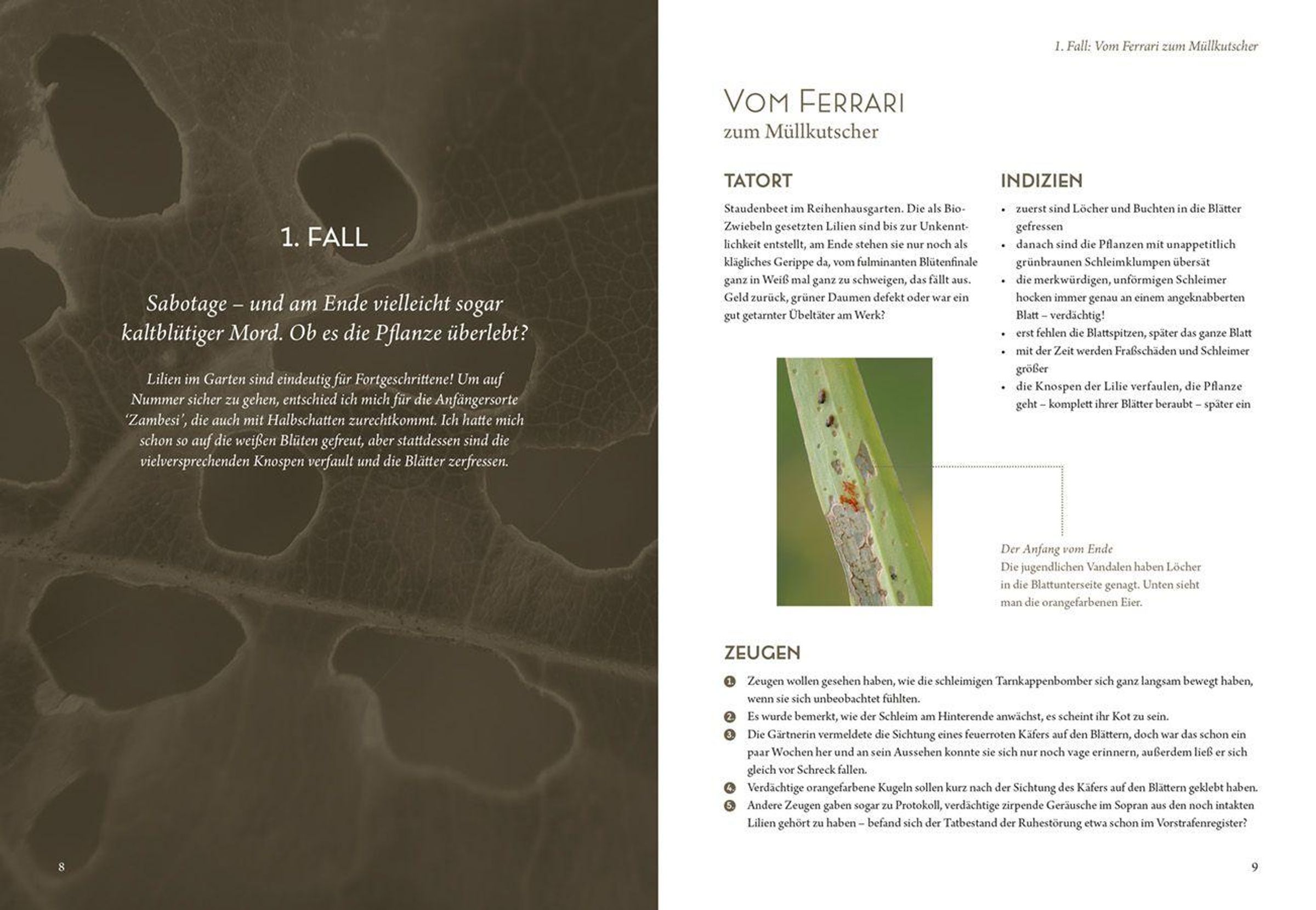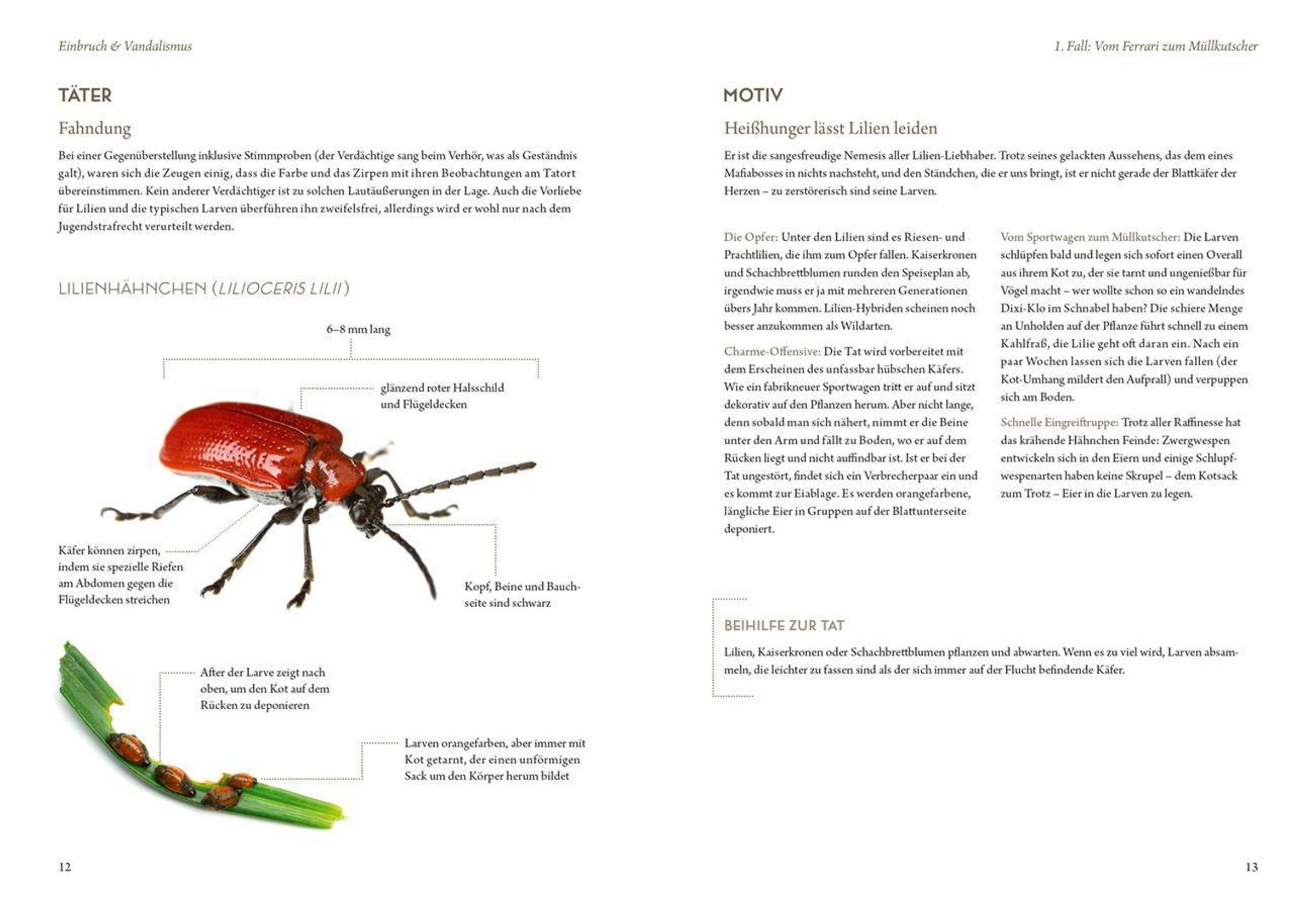 Verbrechen aller Art üben auf Menschen eine besondere Faszination aus, aber wer würde darauf kommen, dass das Böse gleich hinter dem Gartentor lauert? Wirft man einen Blick in den Mikrokosmos zwischen Beet und Topf, kommt man aus dem Staunen nicht heraus. Denn von Insekten über Pflanzen bis hin zu kleinen Säugetieren - der Garten ist voller Verbrecher! Werde zum Kommissar im eigenen Garten: 20 Fälle vom Vandalismus bis zum heimtückischen Mord sind zu lösen. Wer ist verdächtig? Lässt sich der Täter anhand seiner biologischen Merkmale überführen? Welches Motiv hatte er? Geh' auf Spurensuche! Oder schlägst du dich etwa auf die Seite des Bösen, um Blattläuse, Schnecken und Co. loszuwerden?