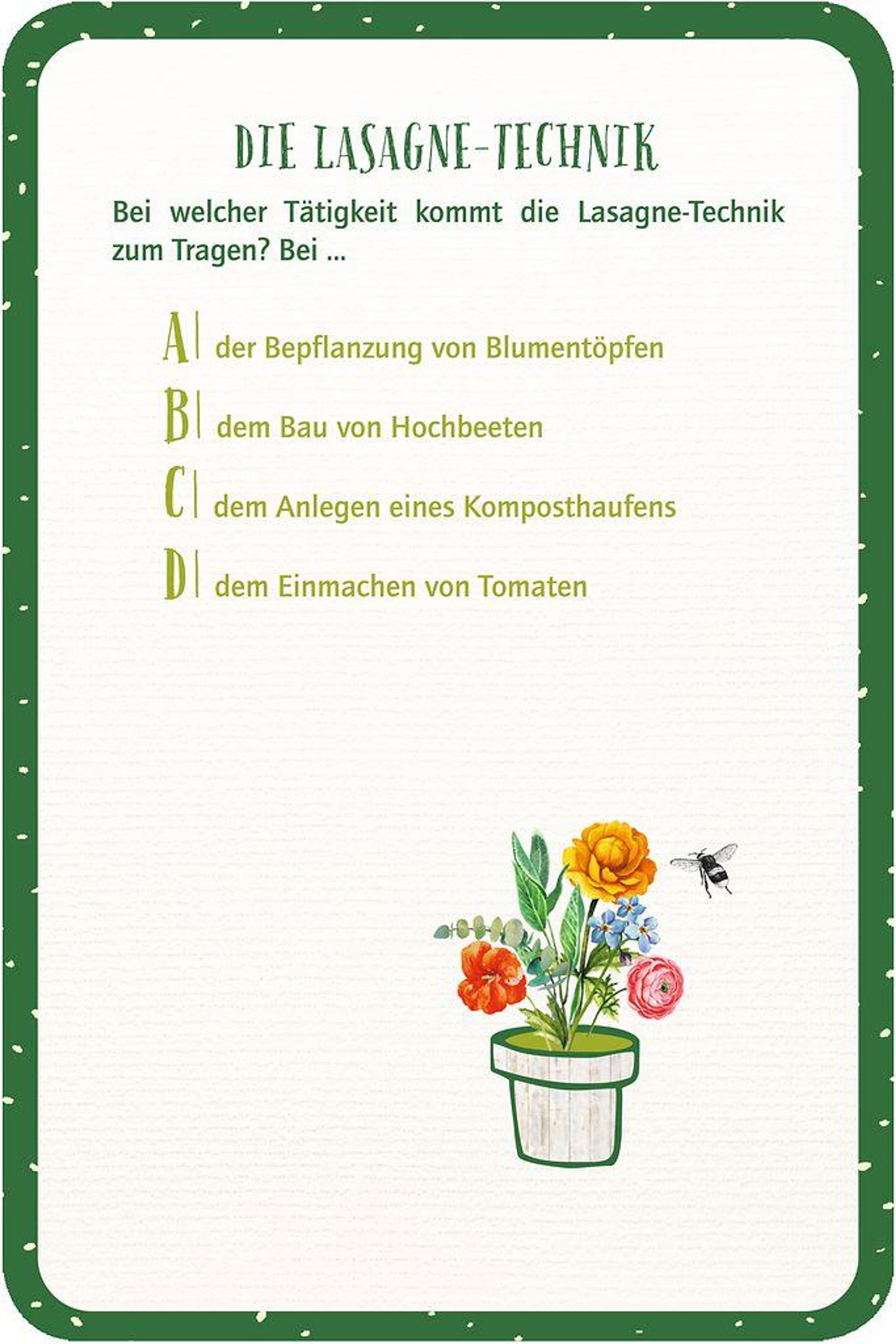 Dieses Quiz enthält 120 Karten mit geballtem Wissen rund um den Garten! Die faszinierenden Fragen und ausführlichen Antworten regen zum Nachdenken, Ausprobieren und Nachmachen an. Das Quiz liefert Hintergrundinformationen zu den unterschiedlichen Gartenpflanzen, heimischen und exotischen Blumen und Sträuchern, nützlichen Obstbäumen, hilfreichen Insekten, dem Garten in den vier Jahreszeiten und anderen kleinen Mitbewohnern. Außerdem weckt es die Freude an diesem kleinen, grünen Fleckchen Glück - unabhängig ob es ein Garten oder ein Balkon ist - ob auf dem Land oder in der Stadt.